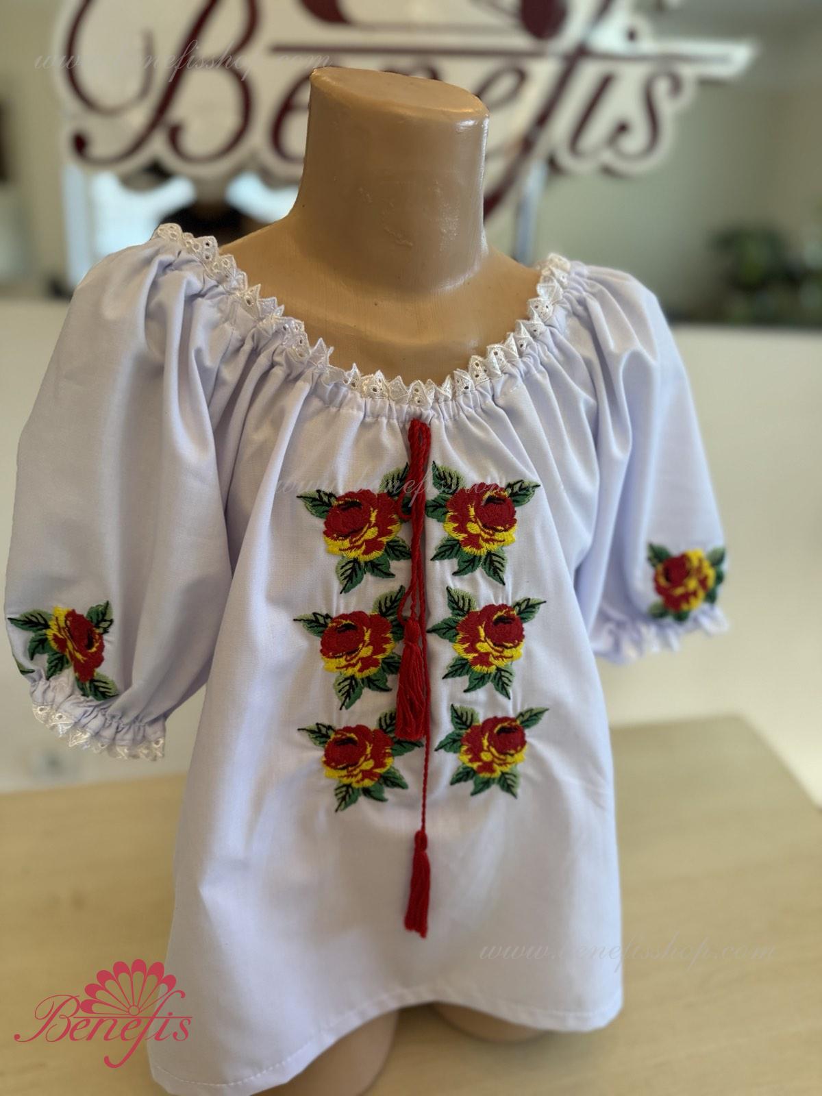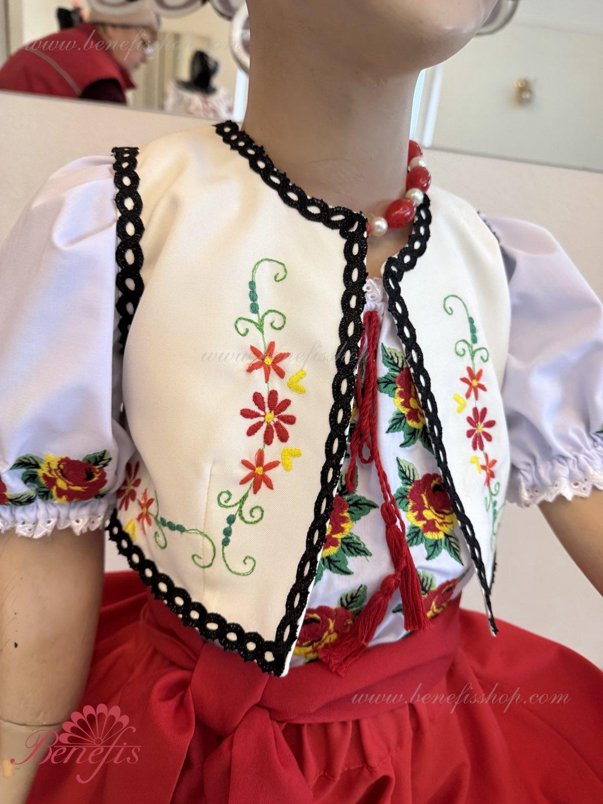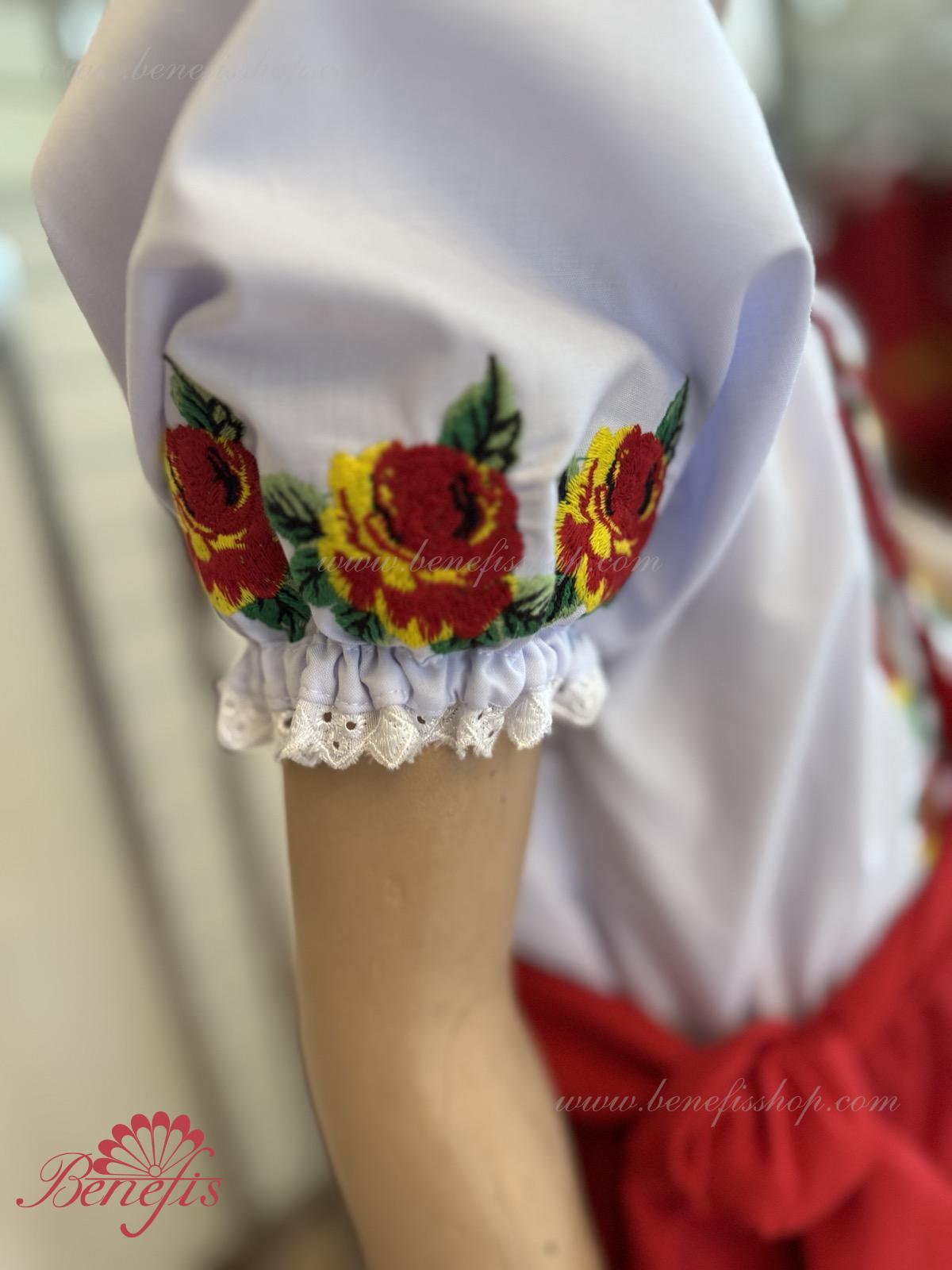 Блуза выполнена из сорочечной ткани. На горловине и рукавах вставлена резинка и от декорирована натуральным кружевом . Вышивка выполнена в национальном стиле на специальной машине. Юбка , пояс и жилетка не входит в цену. В дополнение к блузке вы можете заказать юбку J0123,J0354 пояс J0372 и жилетку J0171.
