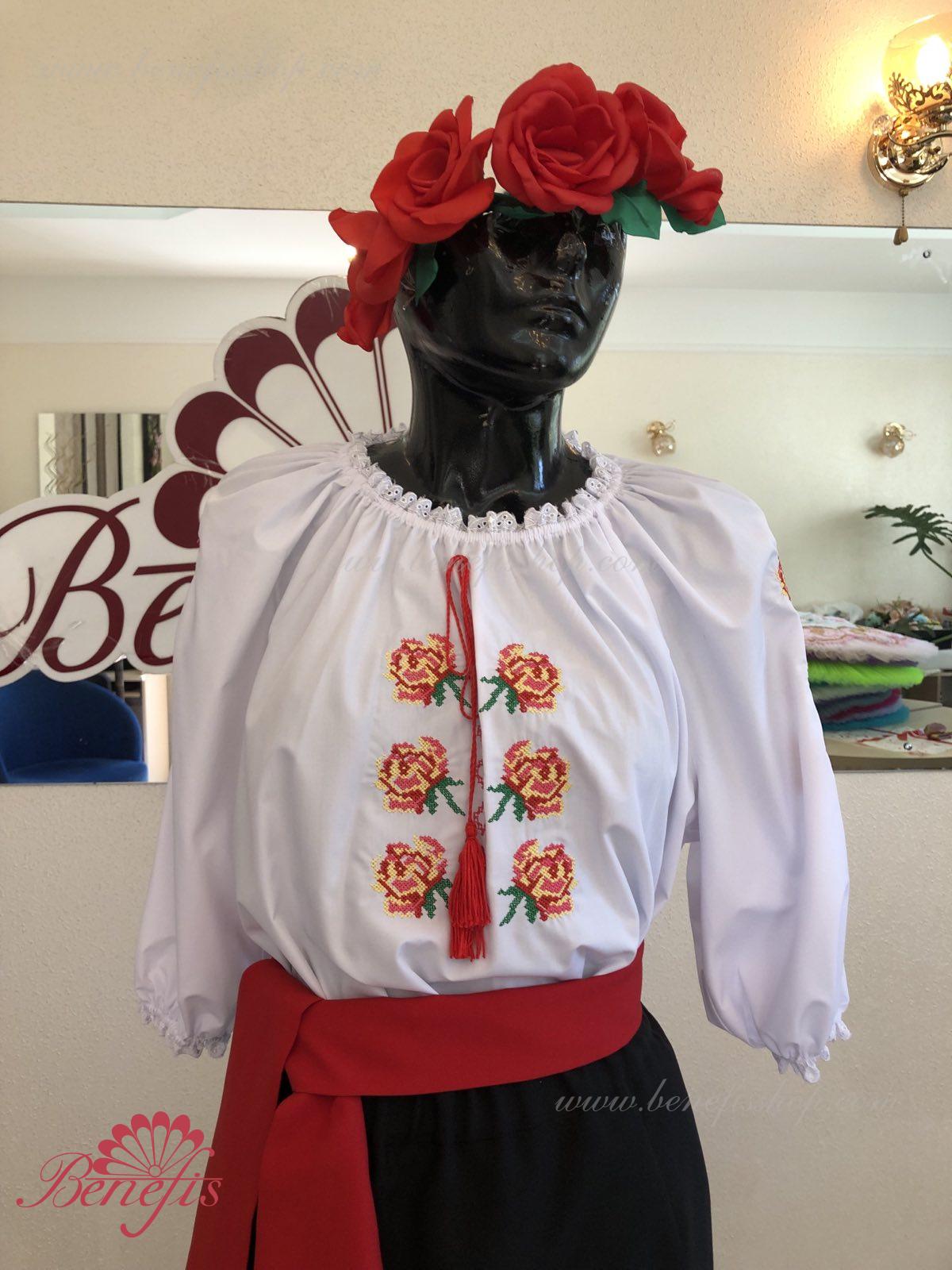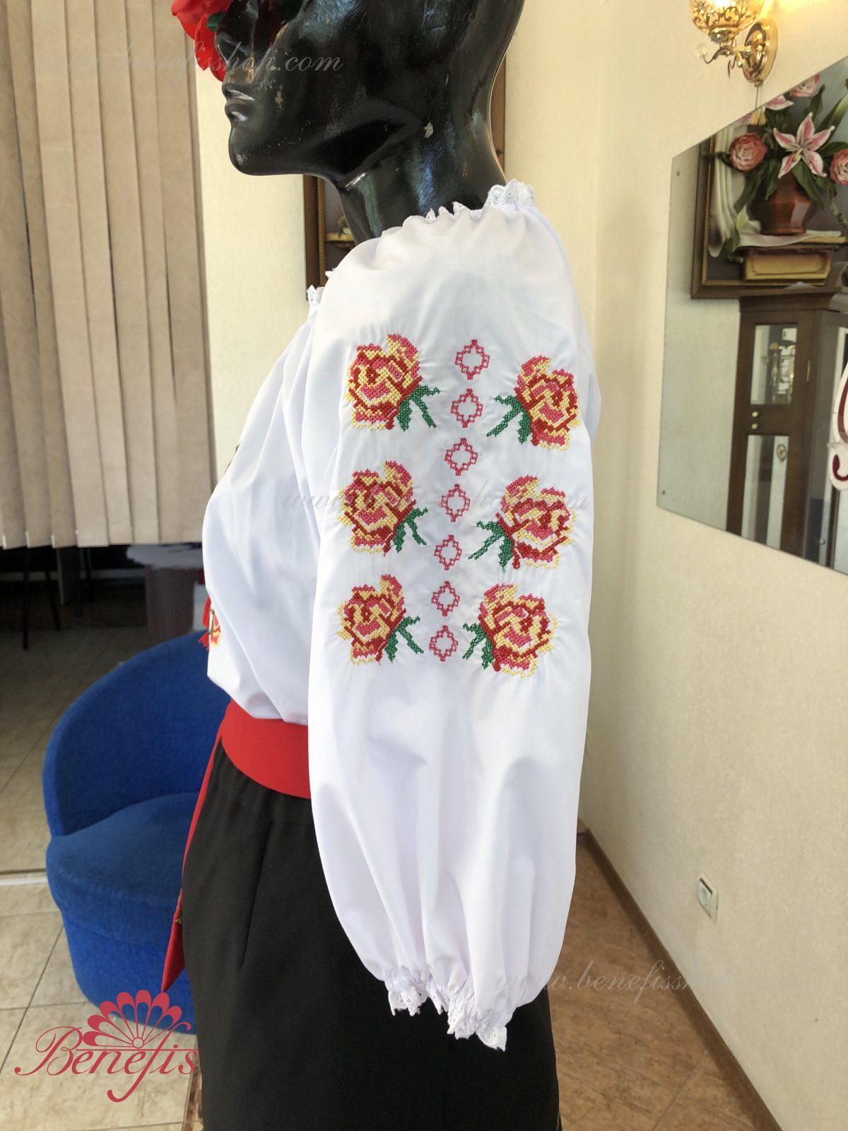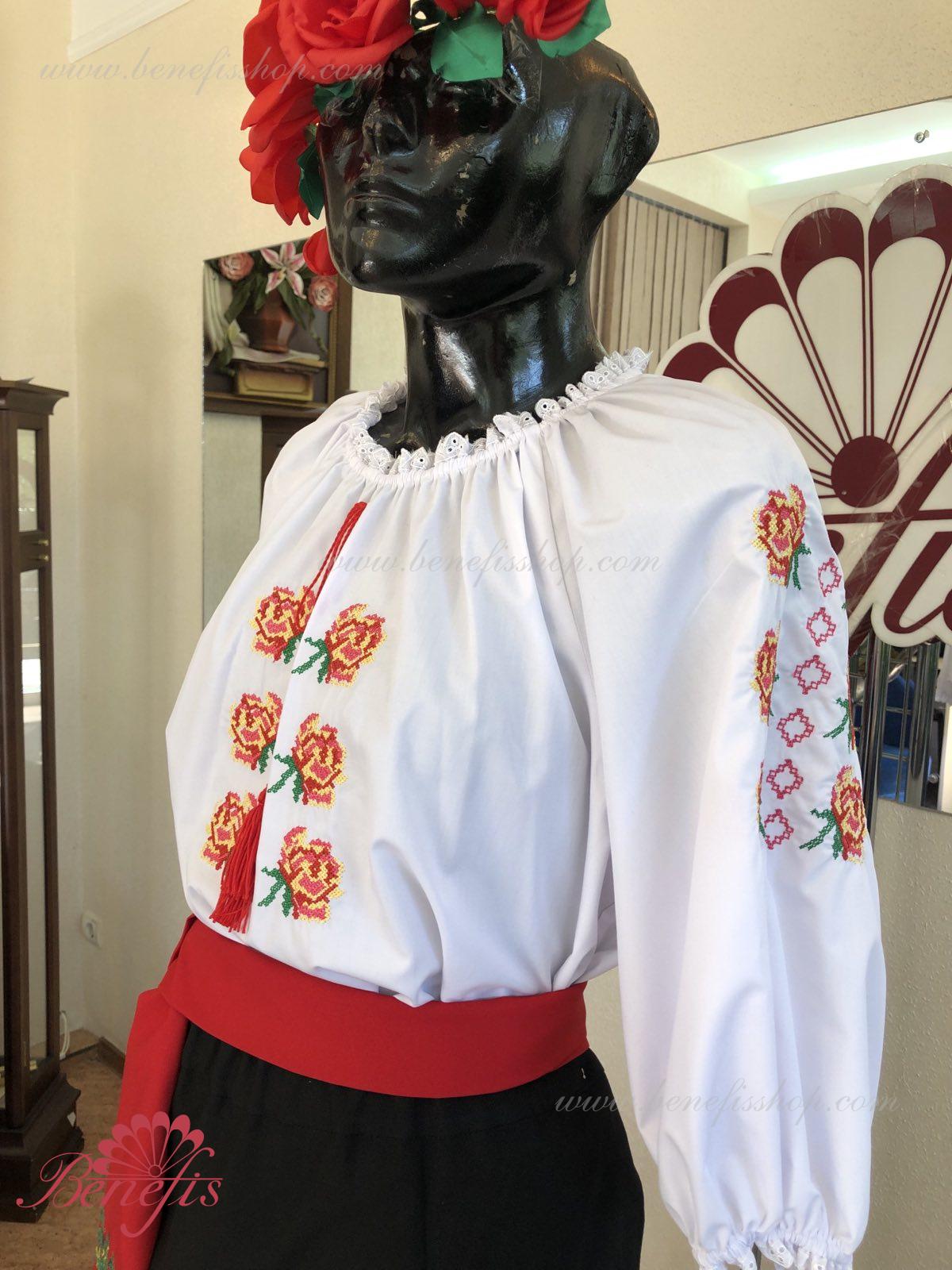 Блуза выполнена из сорочечной ткани. На горловине и рукавах вставлена резинка и от декорирована натуральным кружевом . Вышивка выполнена в национальном стиле на специальной машине.