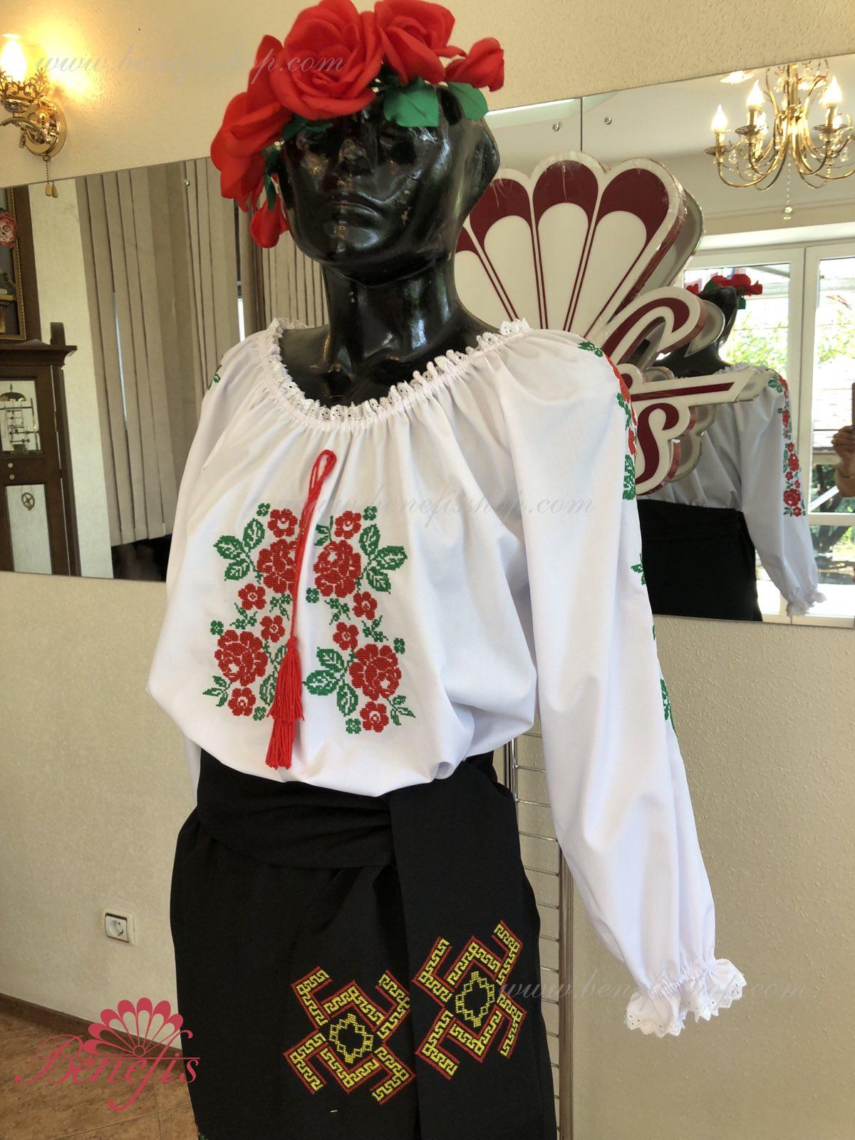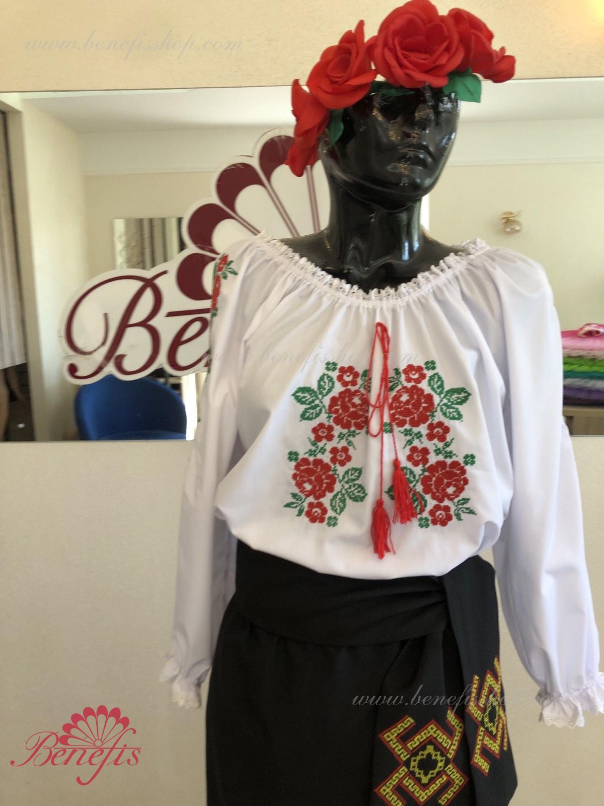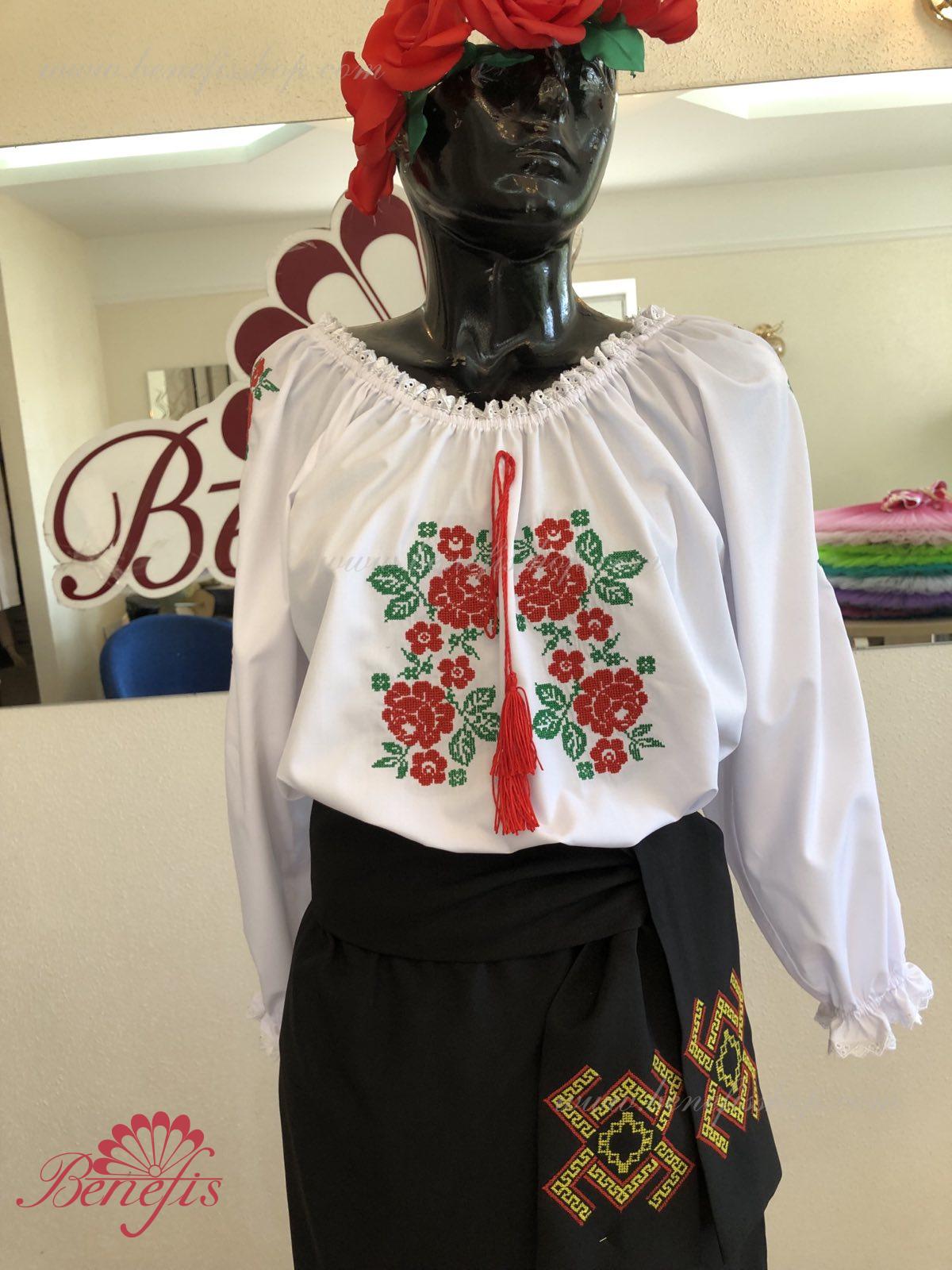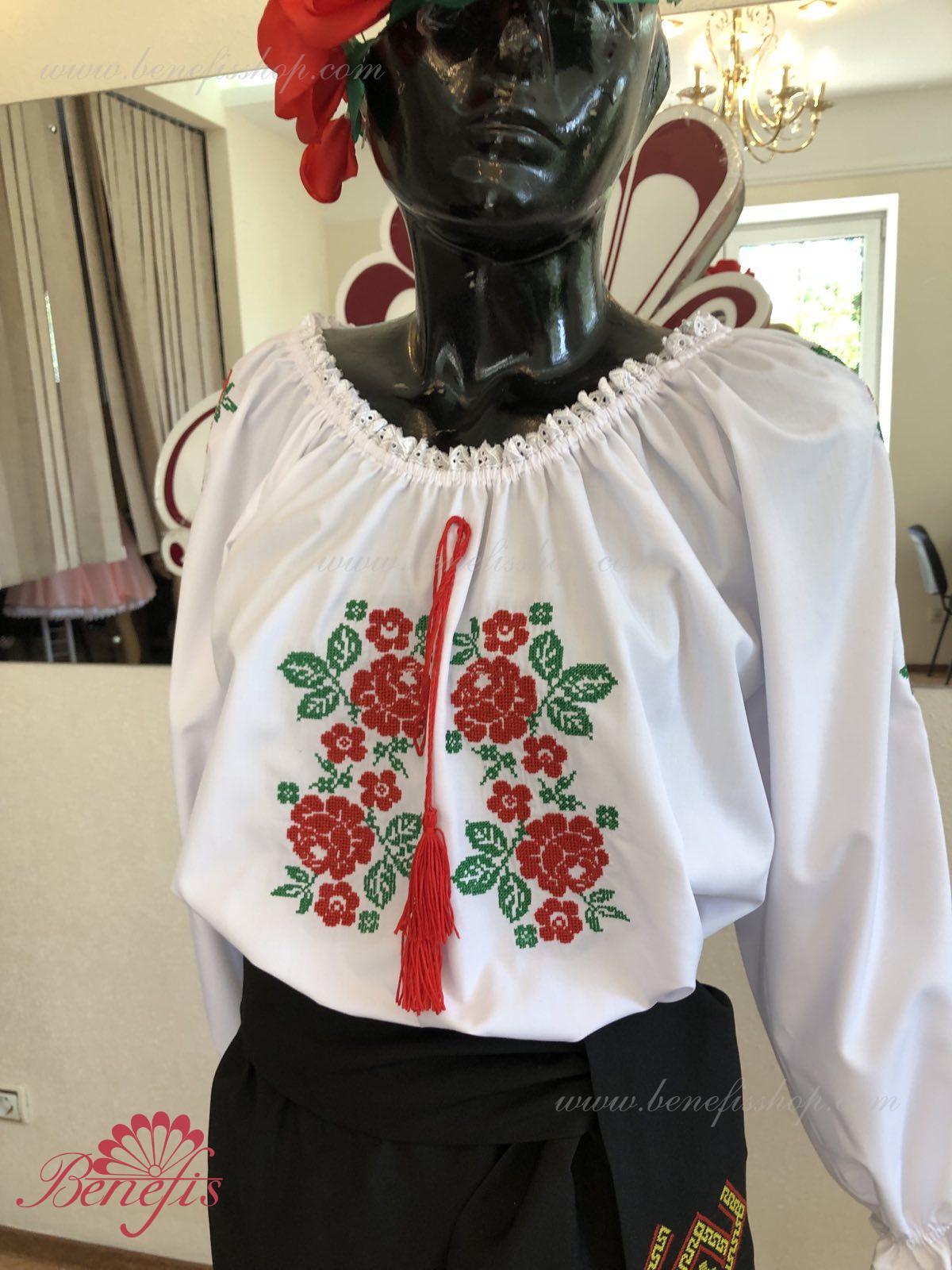 Блуза выполнена из сорочечной ткани. На горловине и рукавах вставлена резинка и от декорирована натуральным кружевом . Вышивка выполнена в национальном стиле на специальной машине.