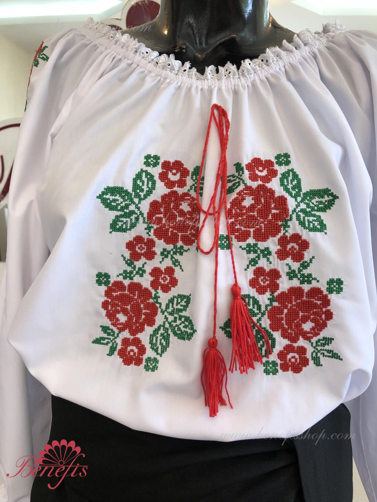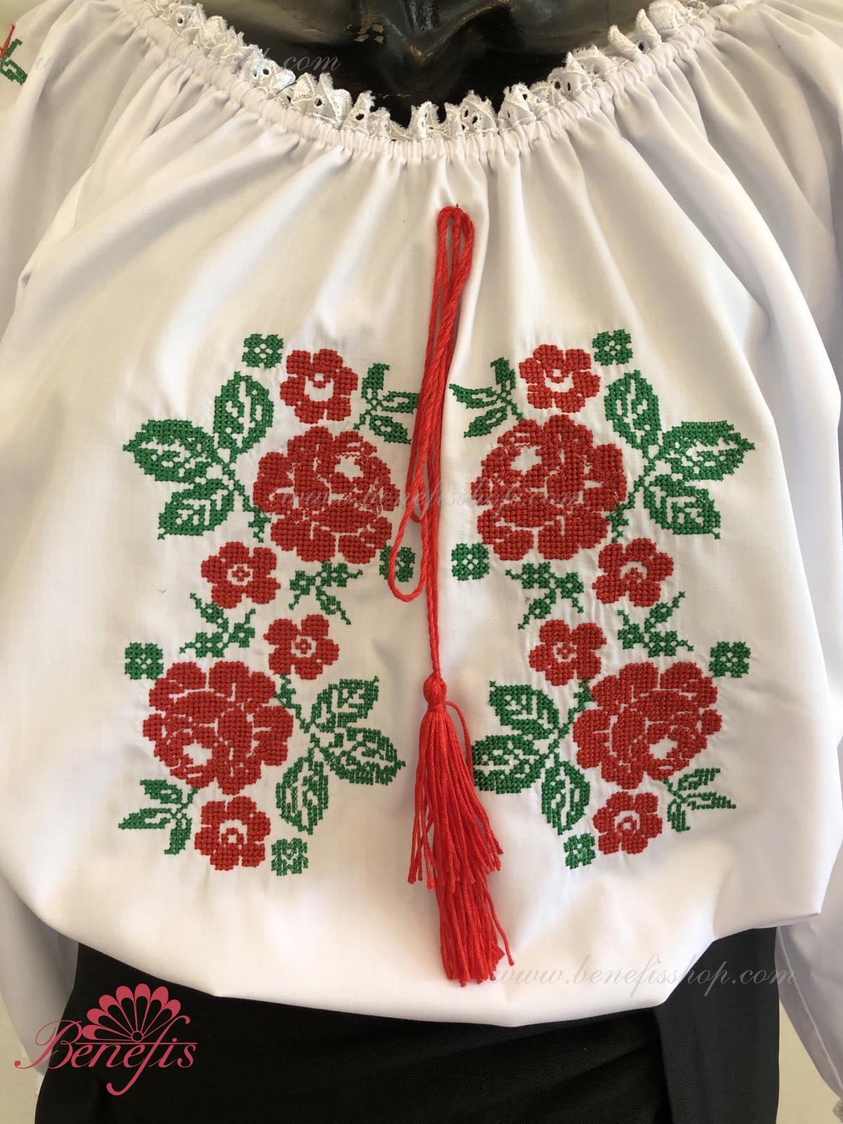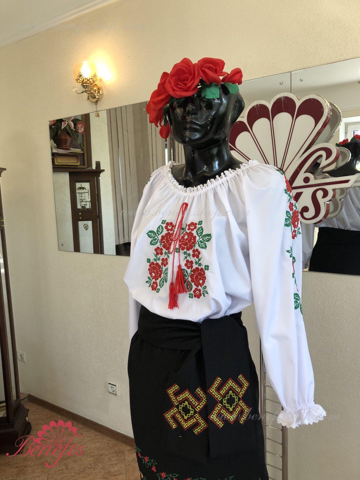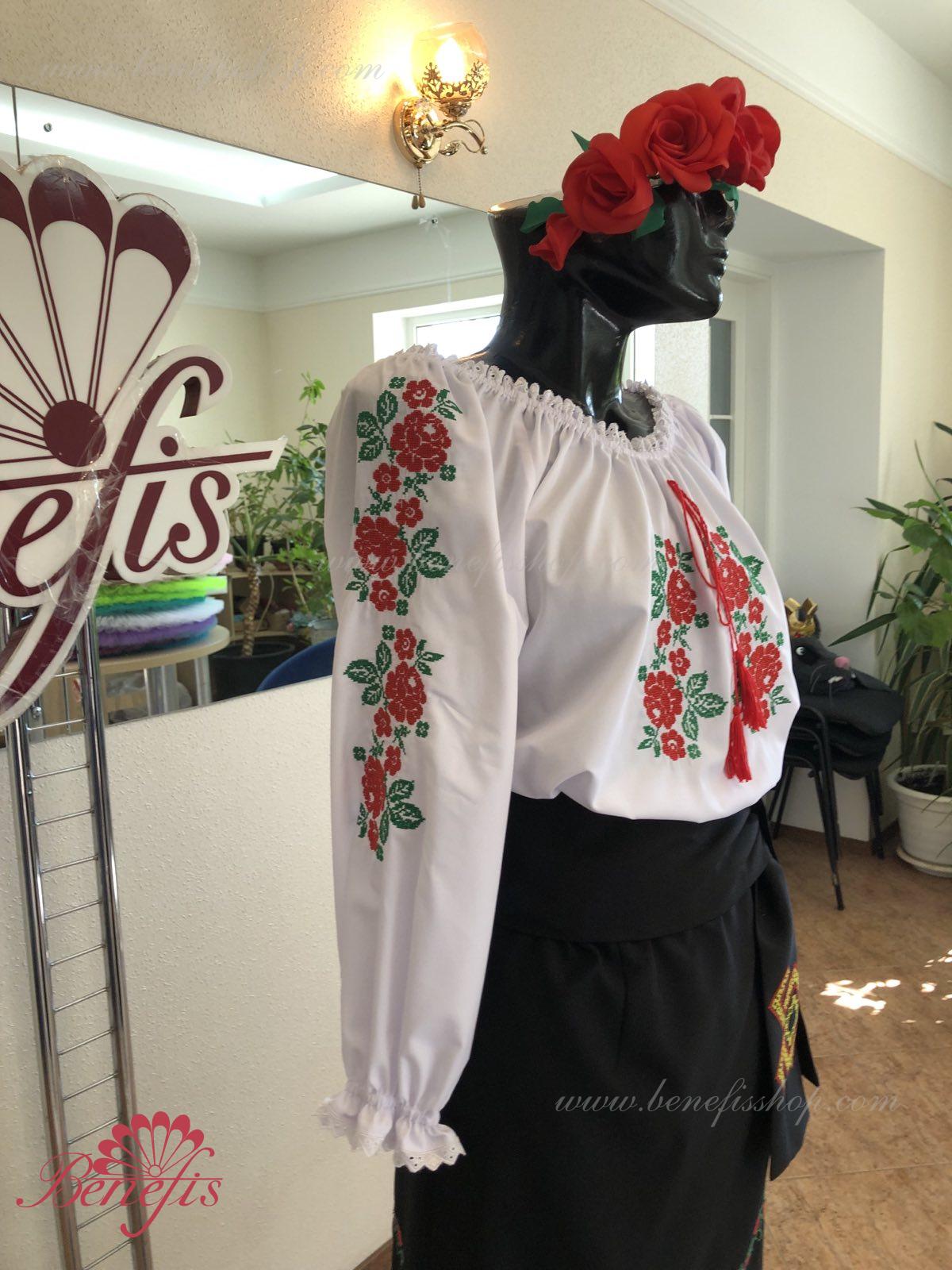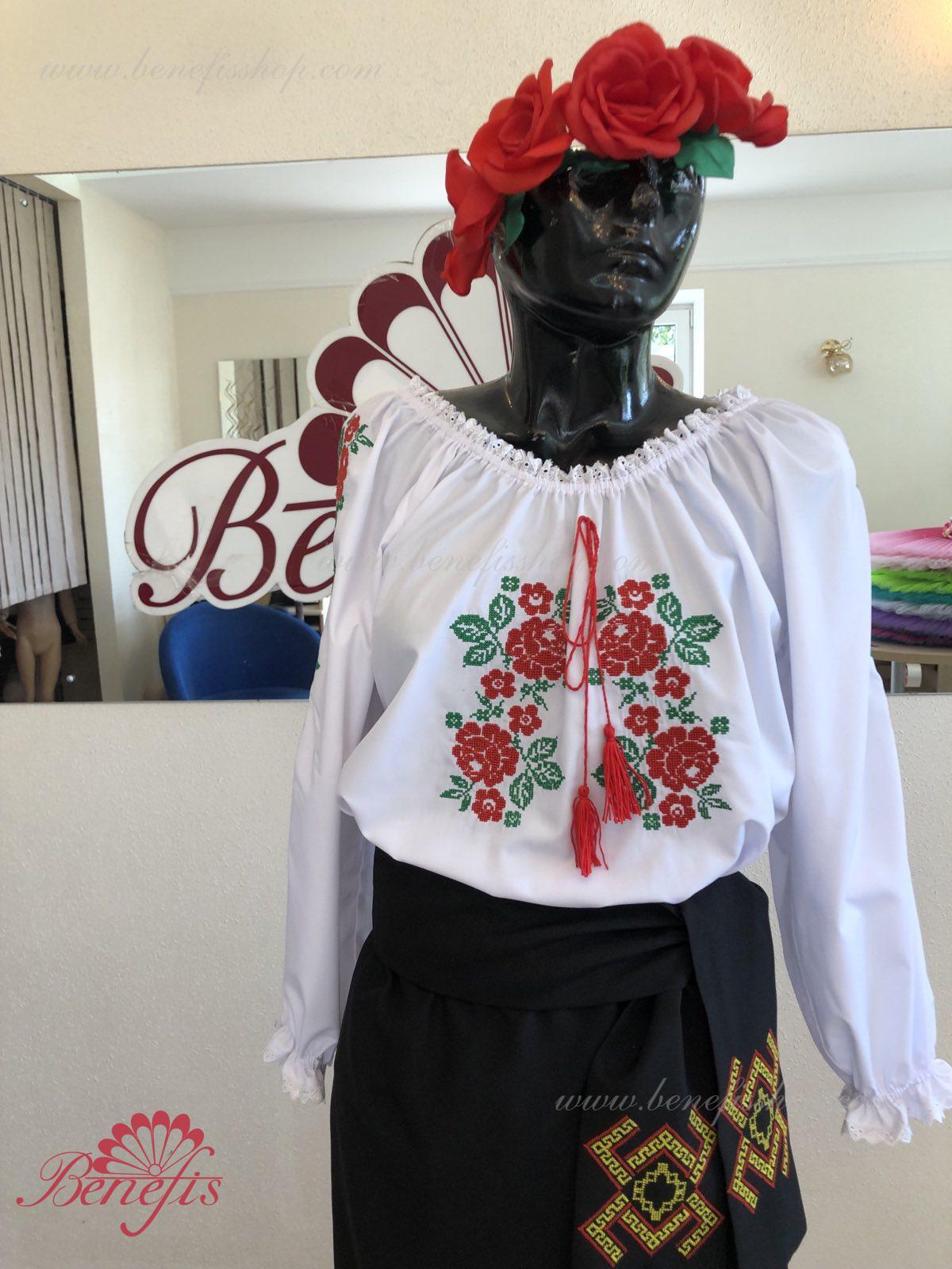 Блуза выполнена из сорочечной ткани. На горловине и рукавах вставлена резинка и от декорирована натуральным кружевом . Вышивка выполнена в национальном стиле на специальной машине.