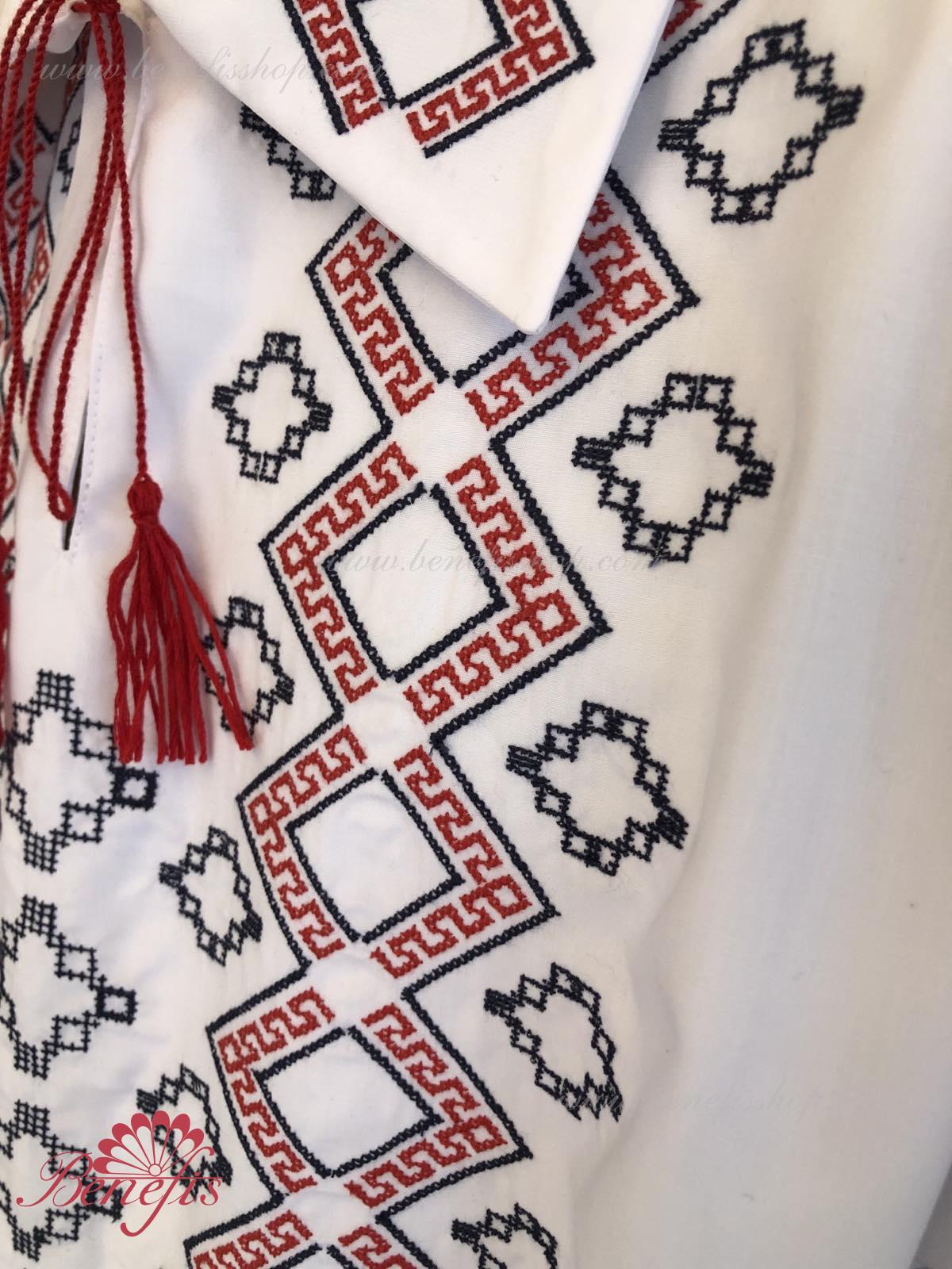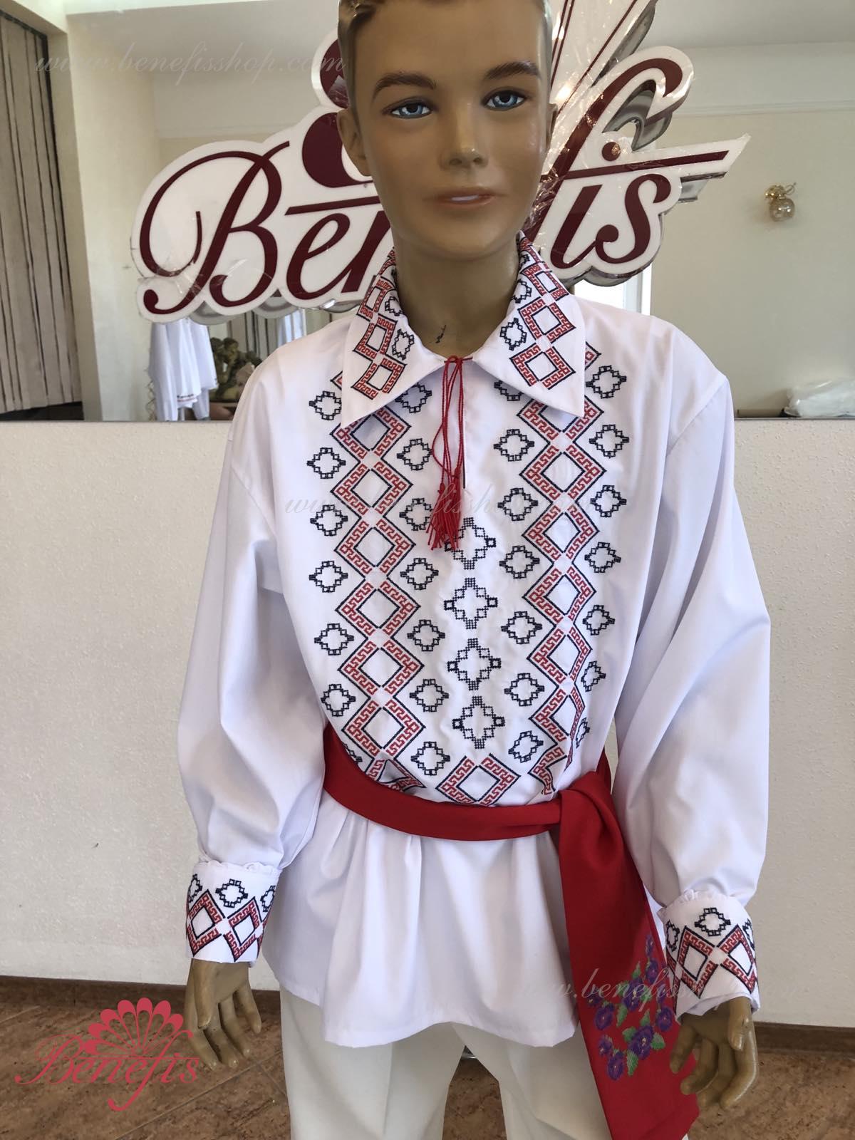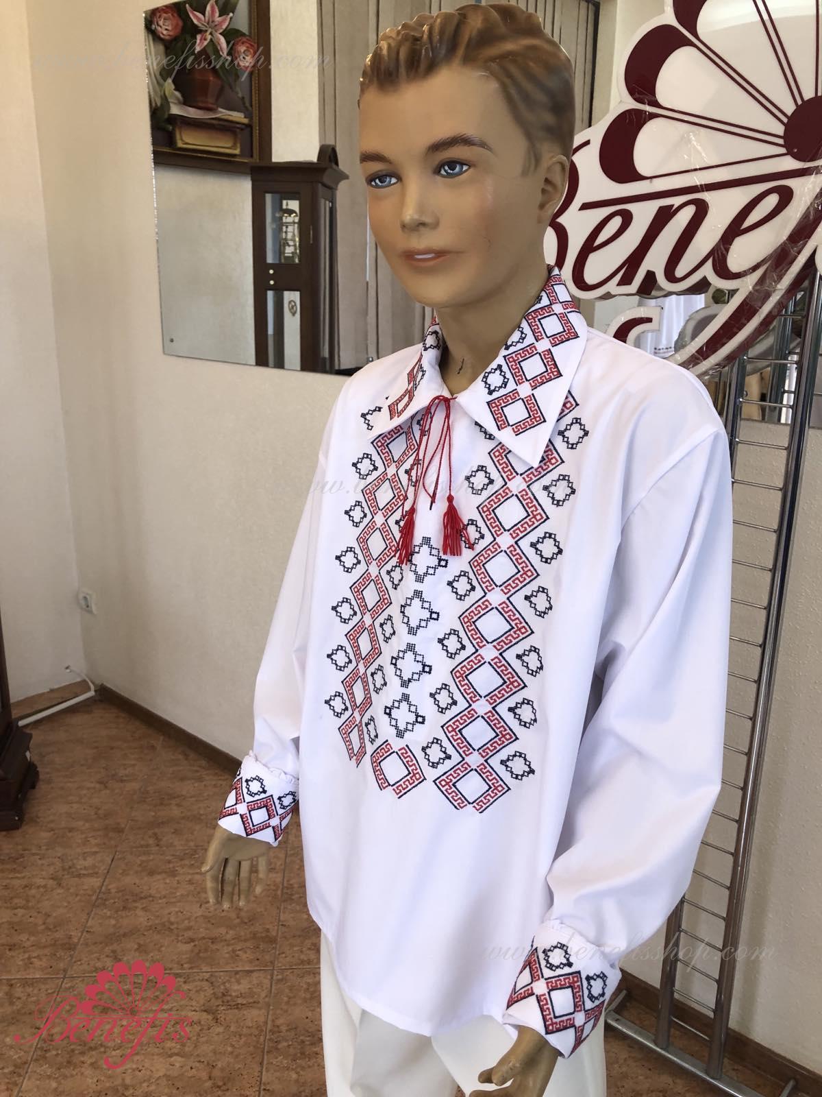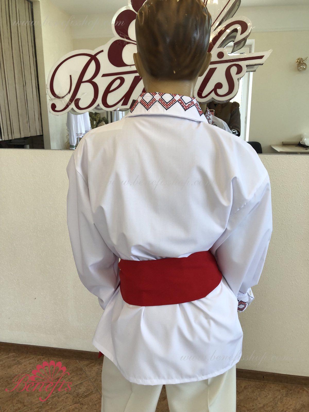 Детали: рубашка. Рубашка к национальному костюму для мальчика — это сорочка с длинным рукавом из сорочечной ткани. Воротник, низ и рукава сорочки декорированная нитками с национальными мотивами. Вышивка выполнена на специальной машине.