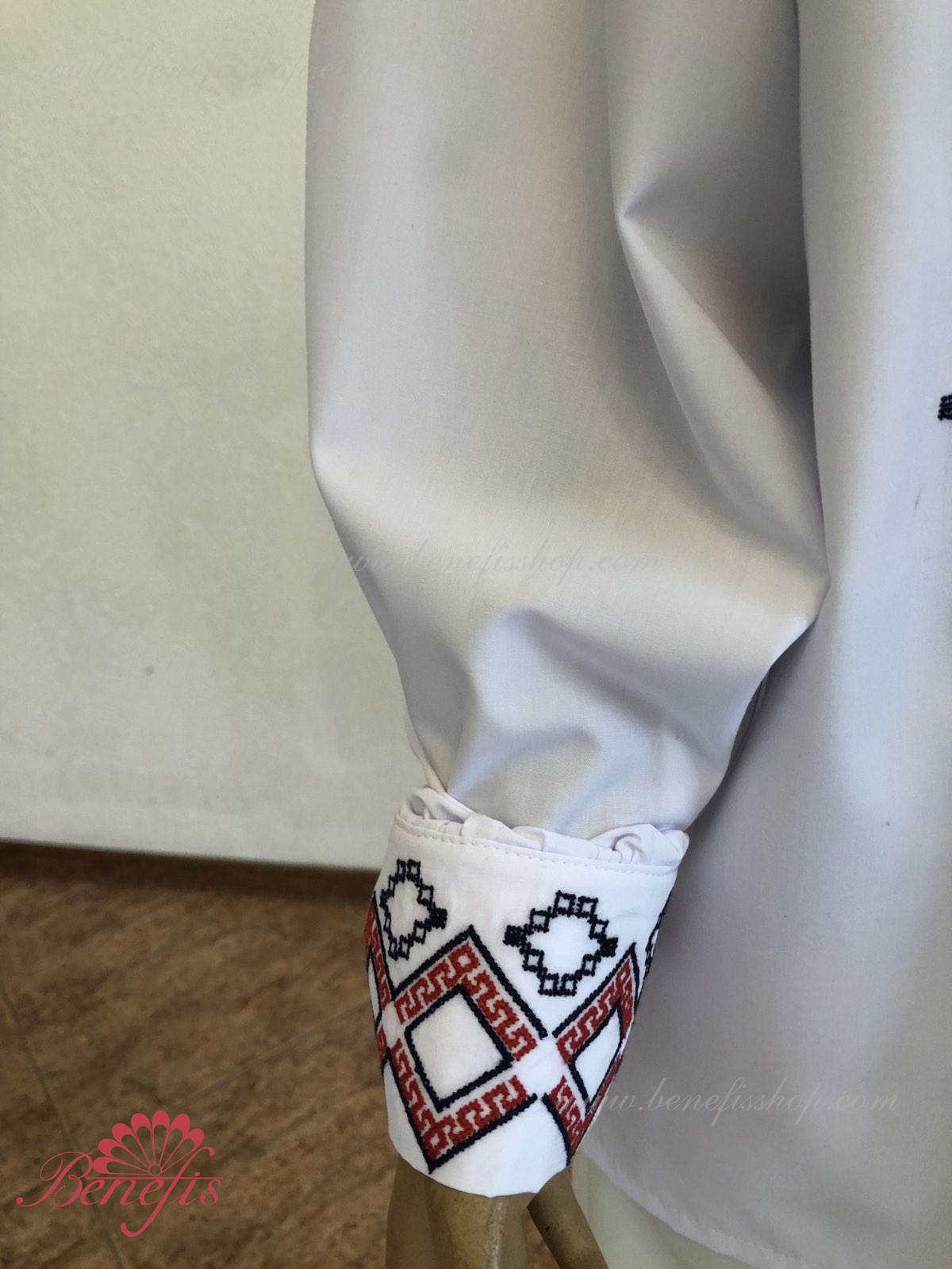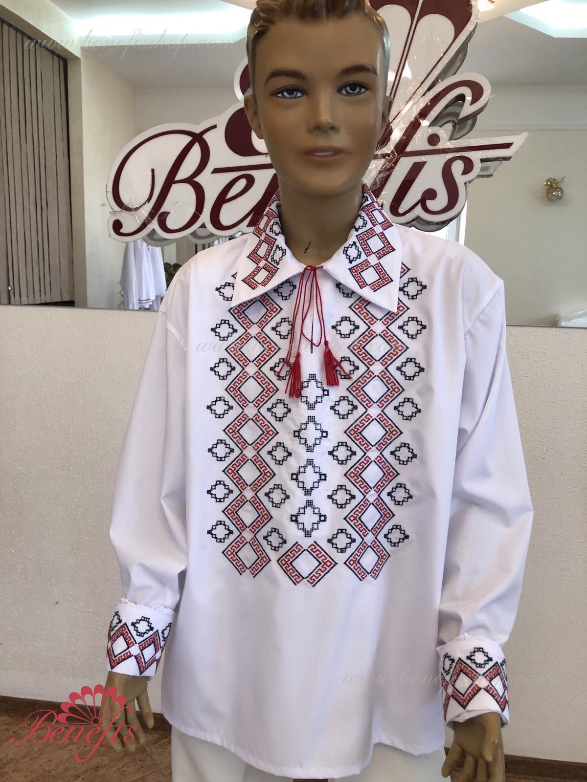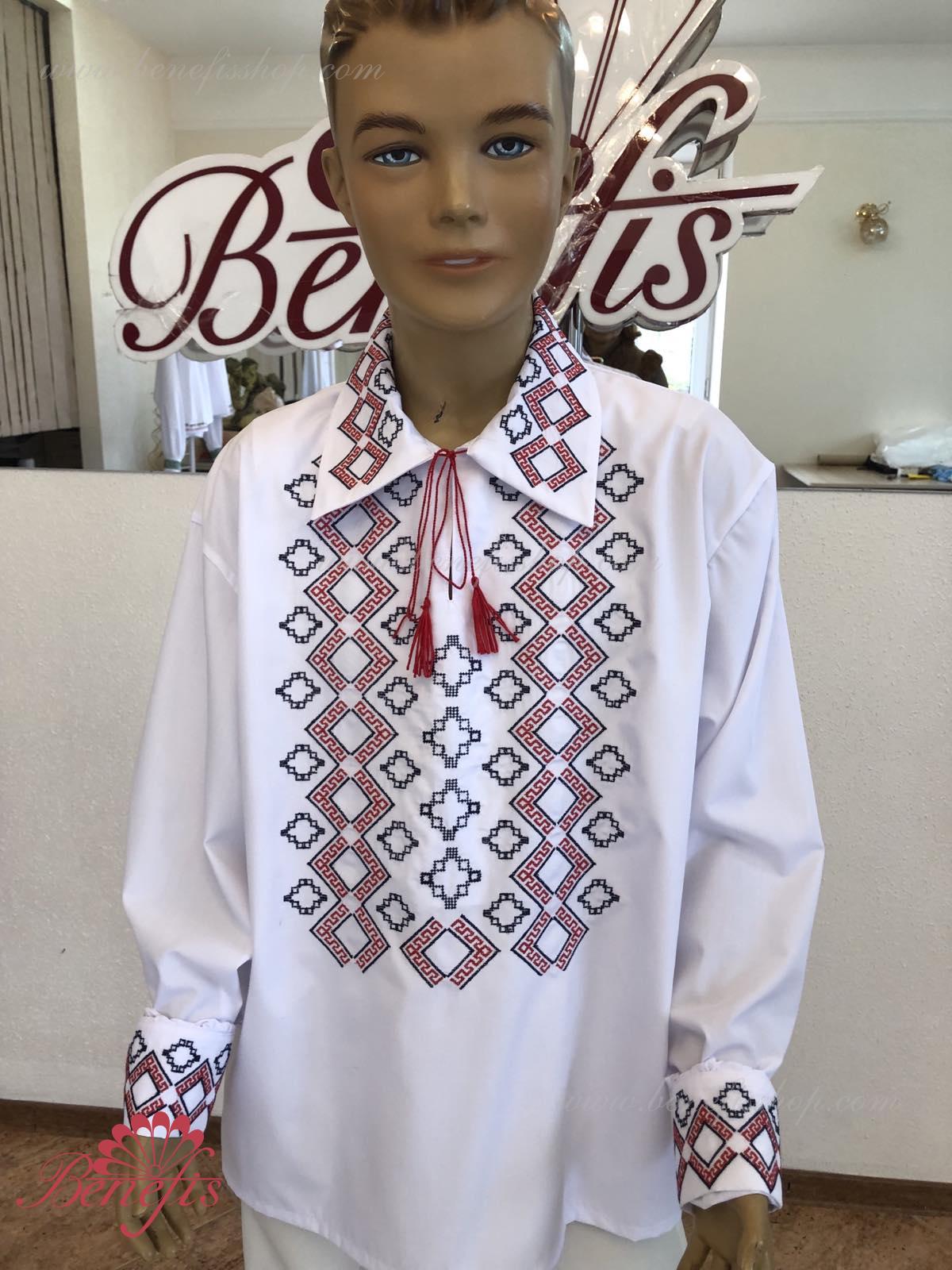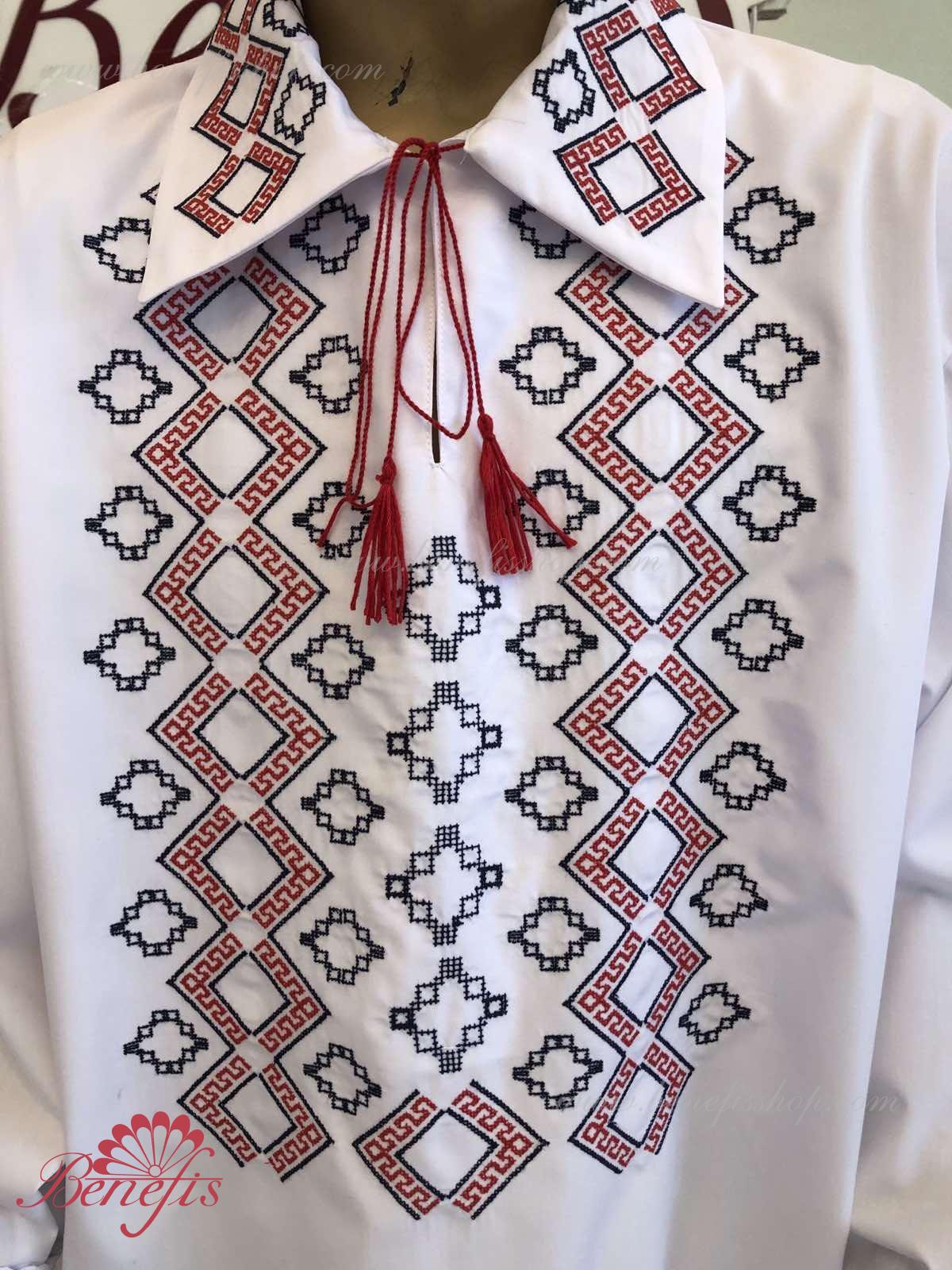 Детали: рубашка. Рубашка к национальному костюму для мальчика — это сорочка с длинным рукавом из сорочечной ткани. Воротник, низ и рукава сорочки декорированная нитками с национальными мотивами. Вышивка выполнена на специальной машине.