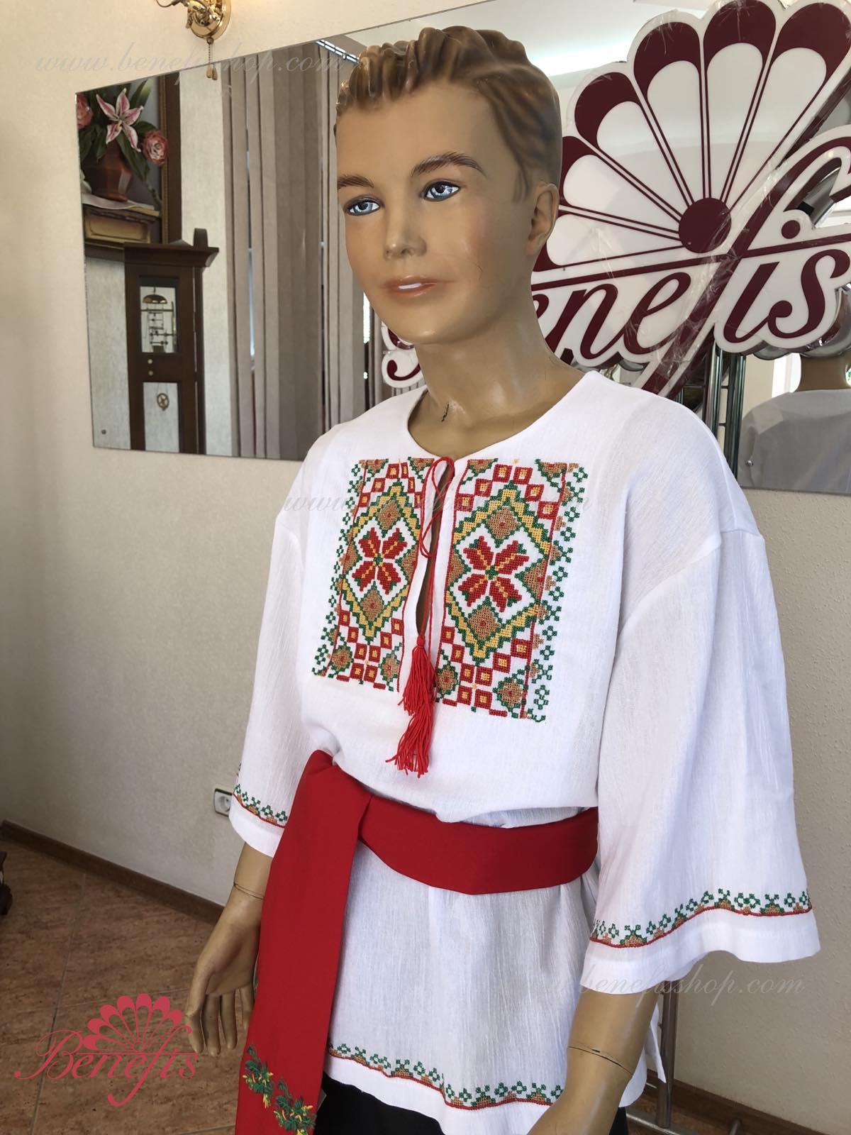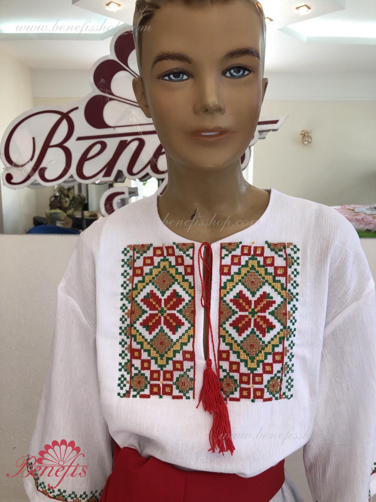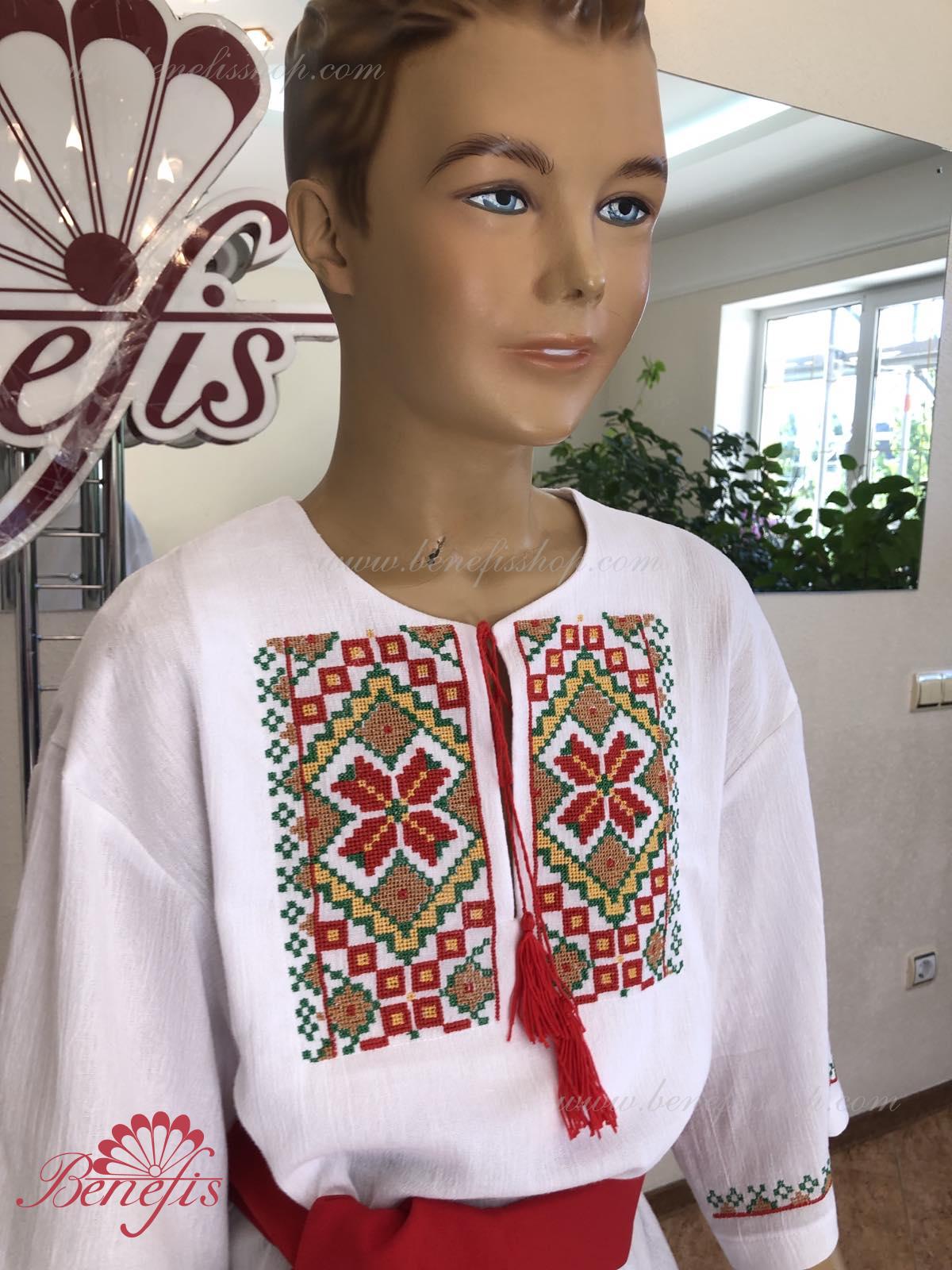 Детали: рубашка. Рубашка к национальному костюму для мальчика — это сорочка с длинным рукавом из натуральной хлопчатобумажной ткани. Воротник, низ и рукава сорочки декорированная нитками с национальными мотивами. Вышивка выполнена на специальной машине.