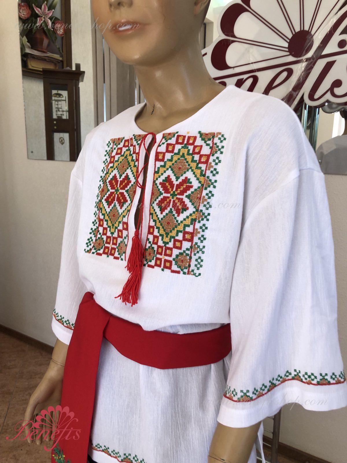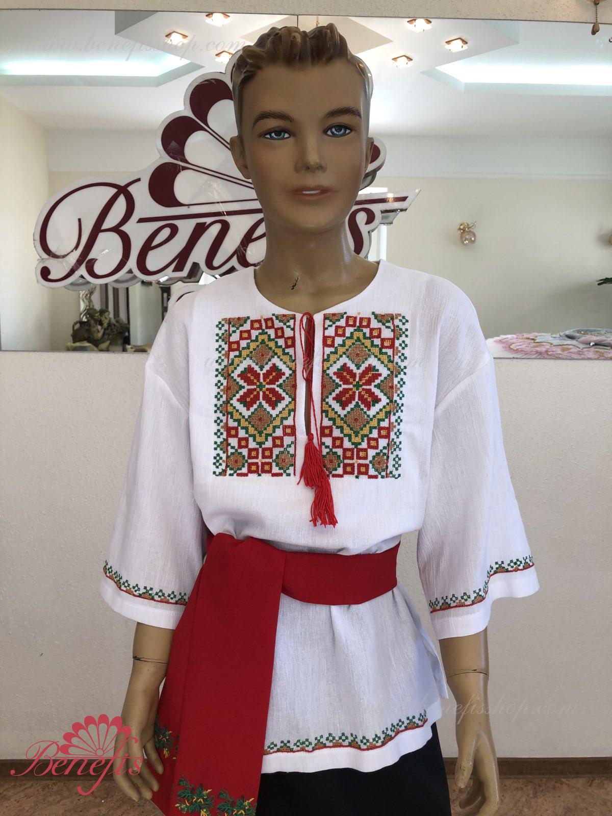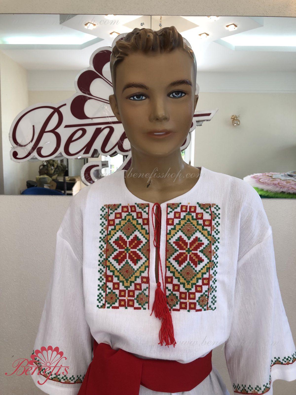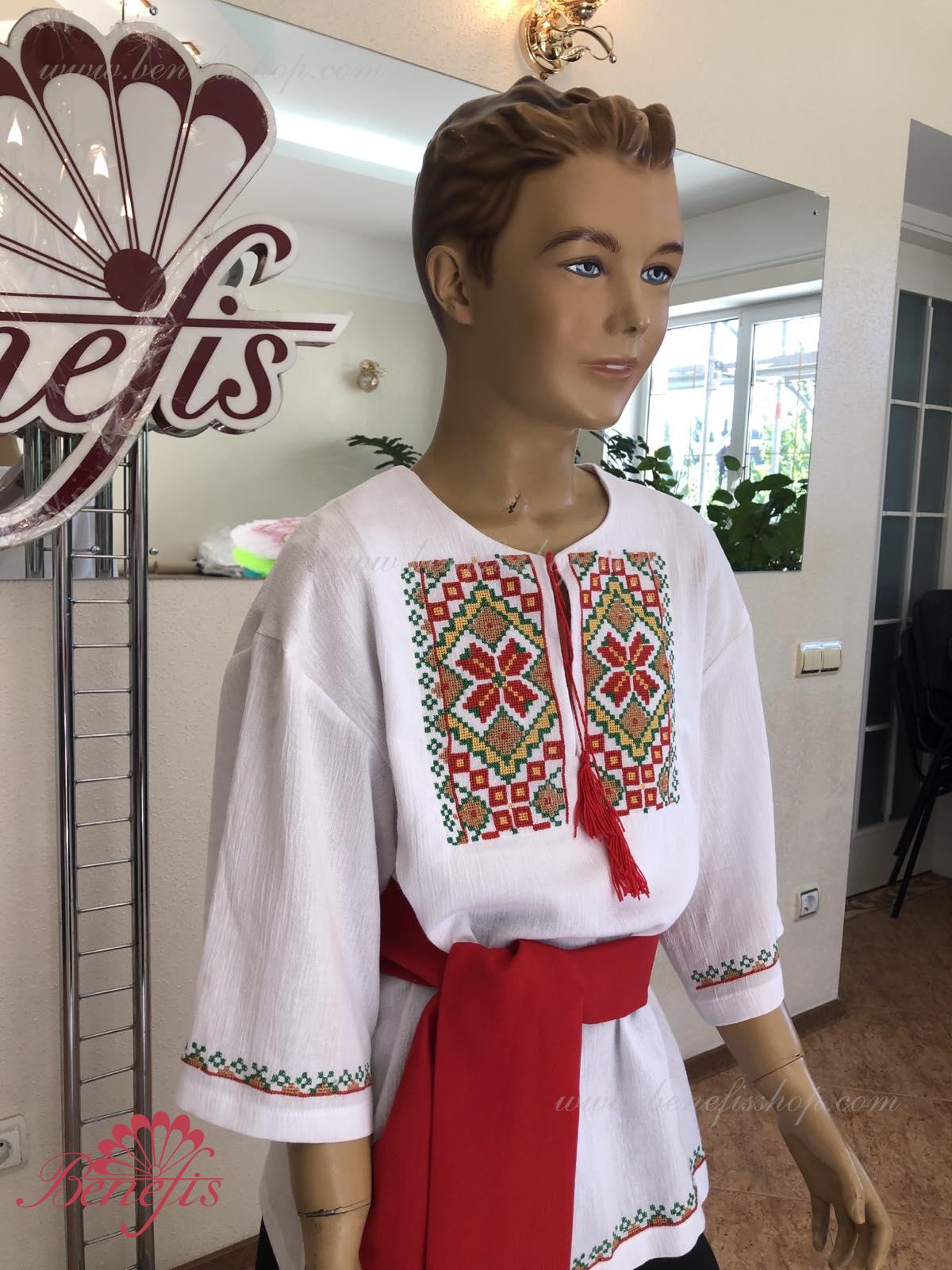 Детали: рубашка. Рубашка к национальному костюму для мальчика — это сорочка с длинным рукавом из натуральной хлопчатобумажной ткани. Воротник, низ и рукава сорочки декорированная нитками с национальными мотивами. Вышивка выполнена на специальной машине.