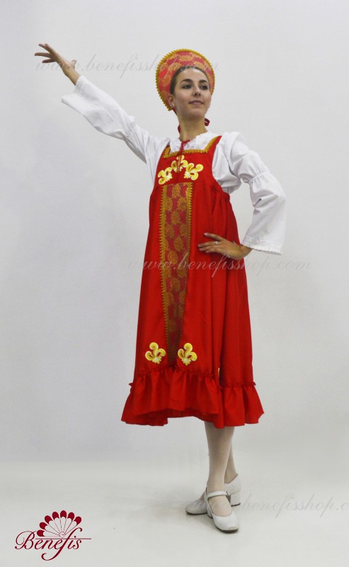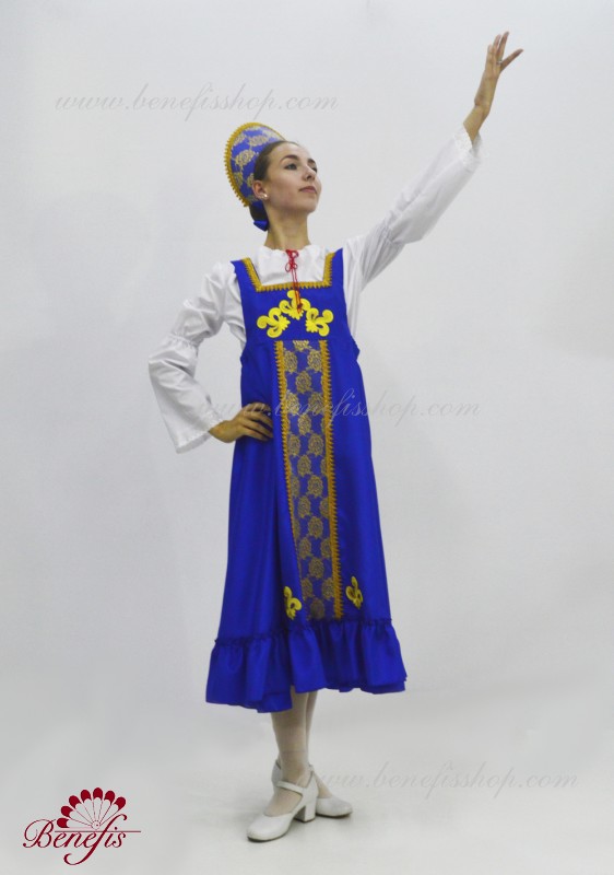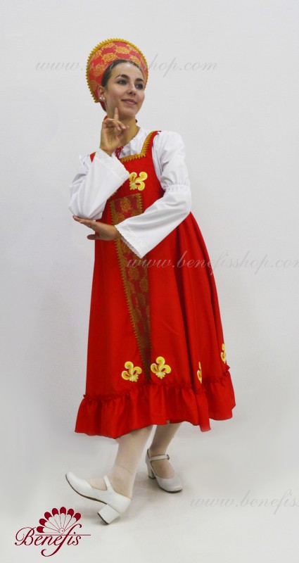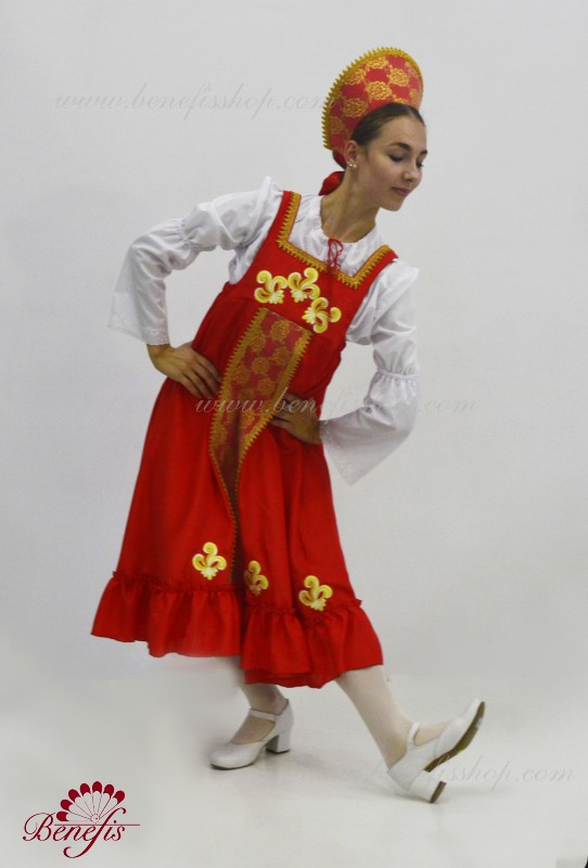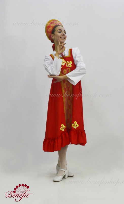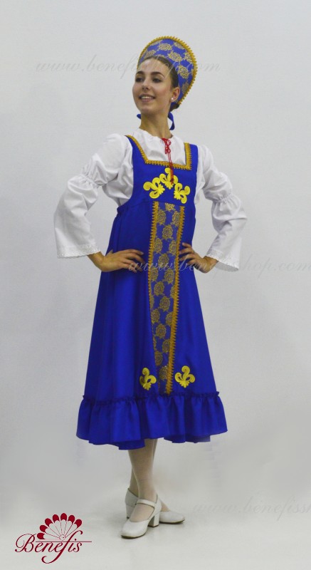 Костюм выполнен в стиле традиционного русского сарафана из атласа или тафты. Широкая расклешенная юбка начинается от груди, по низу расположена широкая рюша , впереди вставка из нежного гипюра. В качестве декора используются аппликации и тесьма. Сарафан выполнен без застежки и одевается поверх рубашки из тонкой ткани с расширяющимися рукавами. Кокошник обтянут тканью аналогичной сарафану и декорирован гипюром и тесьмой. Головной убор крепится за счет резинки на затылке замаскированной бантом из атласной ленты.