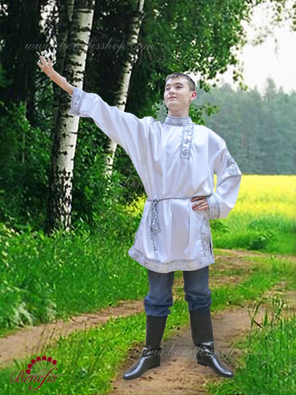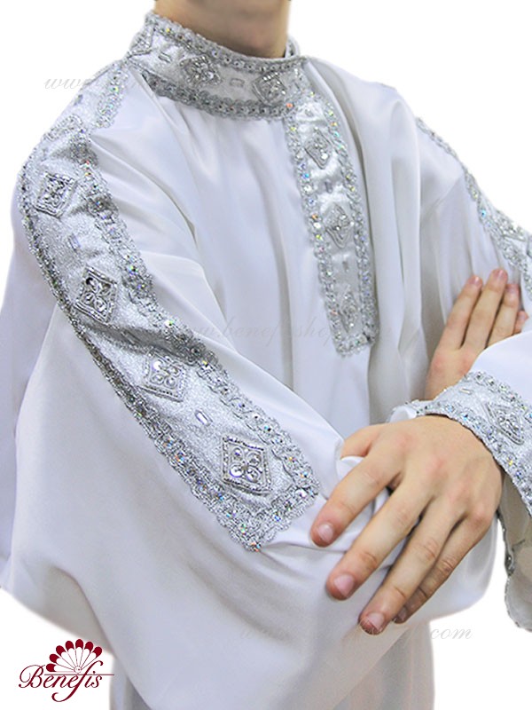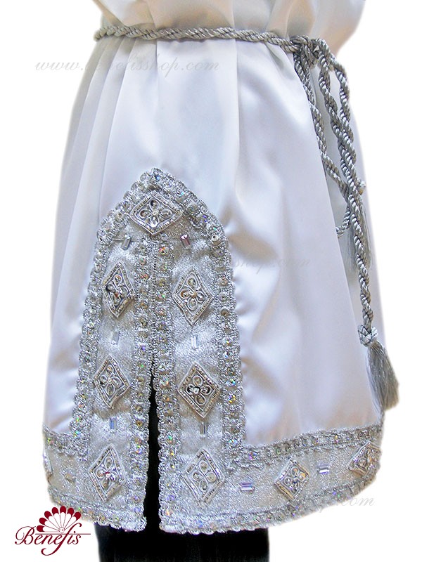 Широкая рубашка выполнена из атласа. Впереди вставка из серебряной парчи, очень богато расшита бусами, тесьмой и аппликациями. Низ pубашки оторочен широкой полосой из парчи.