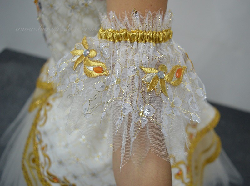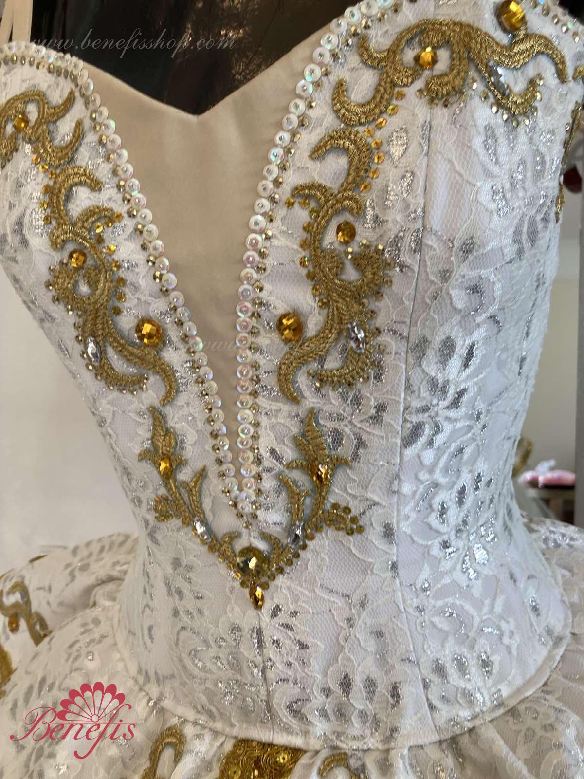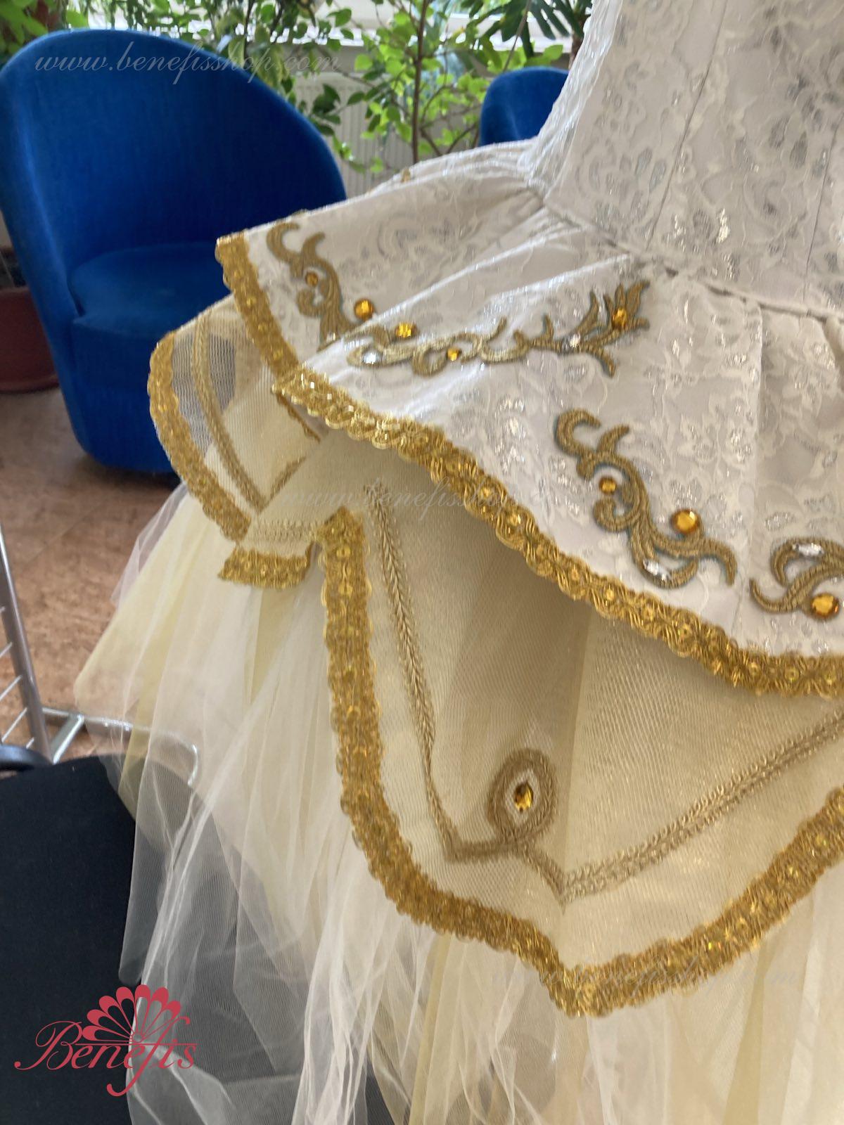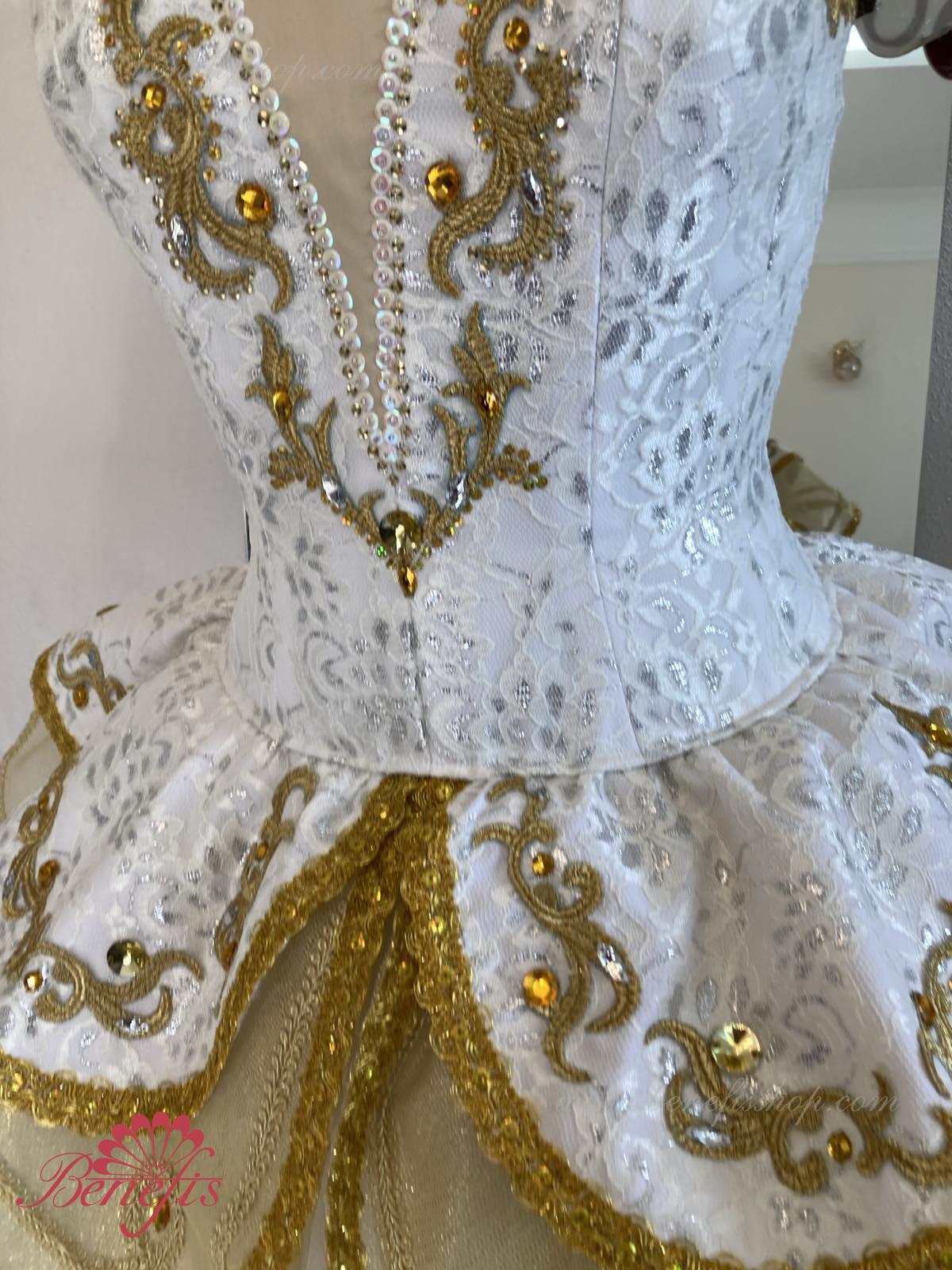 В качестве декора костюма использованы узоры из аппликаций, блёстки, удлинённые и круглой формы стразы золотистого цвета и цвета горного хрусталя.