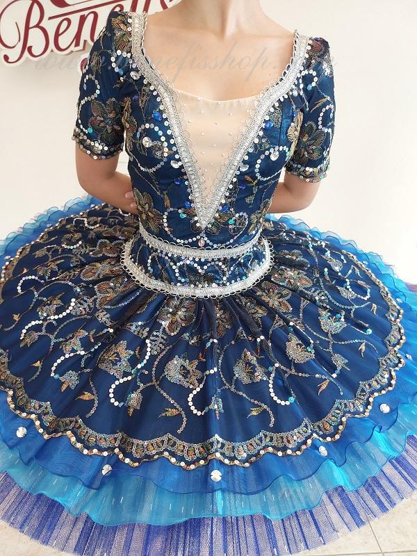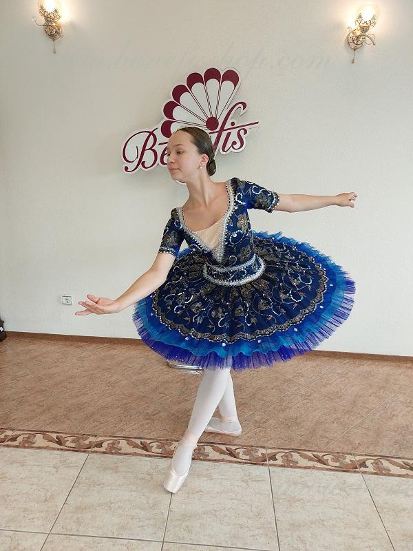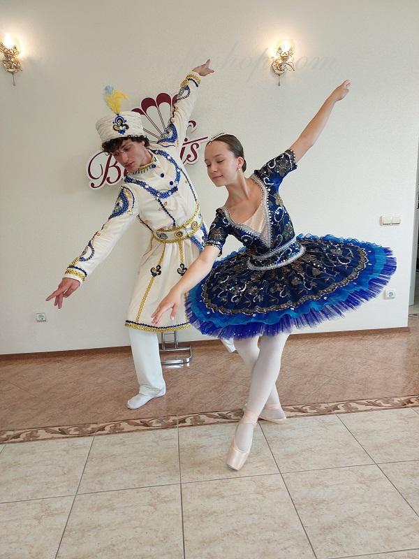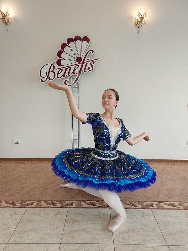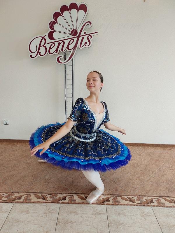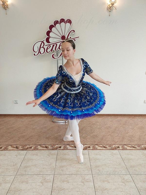 На юбке выполнена многослойная покрышка из ткани разной фактуры, поэтому костюм особо красочен и может быть использован для роли Одалиски в балете «Корсар» а также в балете «Баядерка».