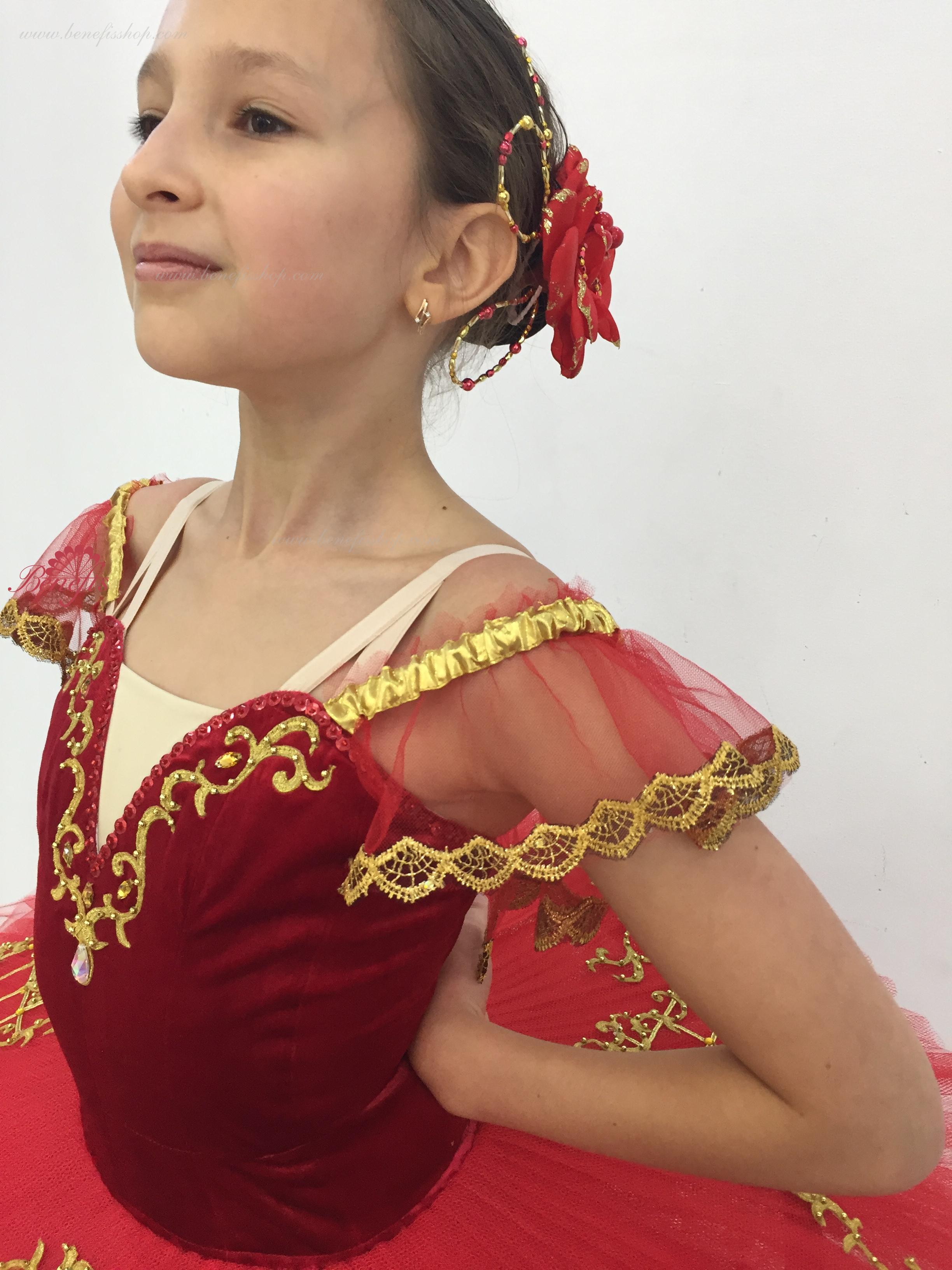 Детали: платье, рукава. Этот профессиональный балетный сценический костюм выполнен на основе профессиональной базовой пачки # T 0001B (см. раздел «Базовые и репетиционные балетные пачки»). Лиф, на эластичных лямках и с телесной вставкой на груди, выполнен из плотной полу эластичной ткани бархат.