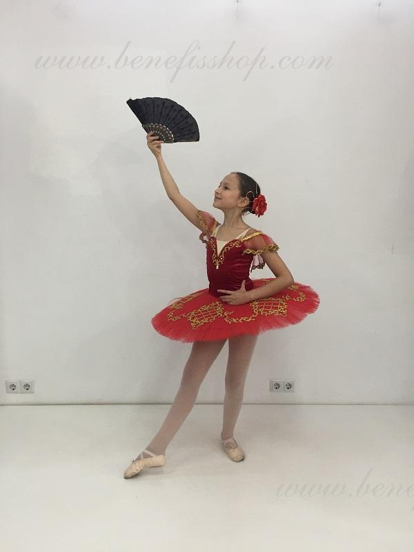 Лиф застегивается на крючки в два ряда для удобного регулирования, внутренний шнур служит для затягивания лифа в области груди. Восемь плиссированных градуированных слоёв полумягкого тюля- семь длинных и один короткий на трусиках из тюля с 10 см кокеткой, прикрепленной к эластичному поясу. Два кринолиновых обруча внедрены в средний слой с двумя дополнительными короткими оборками по краям. Длина верхнего слоя - 36-38 см, каждый следующий слой на 4 см короче. Пачка застегивается сзади на 6 больших крючков и петелек.