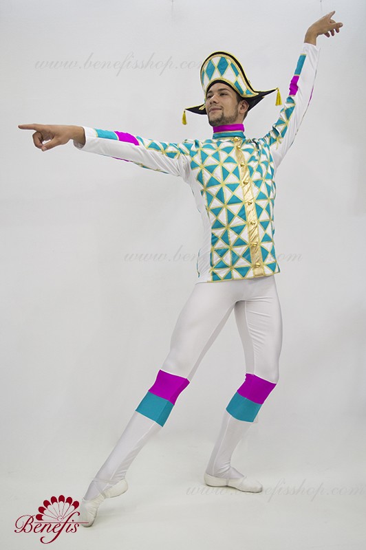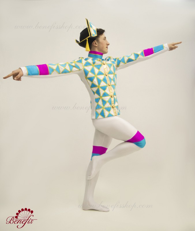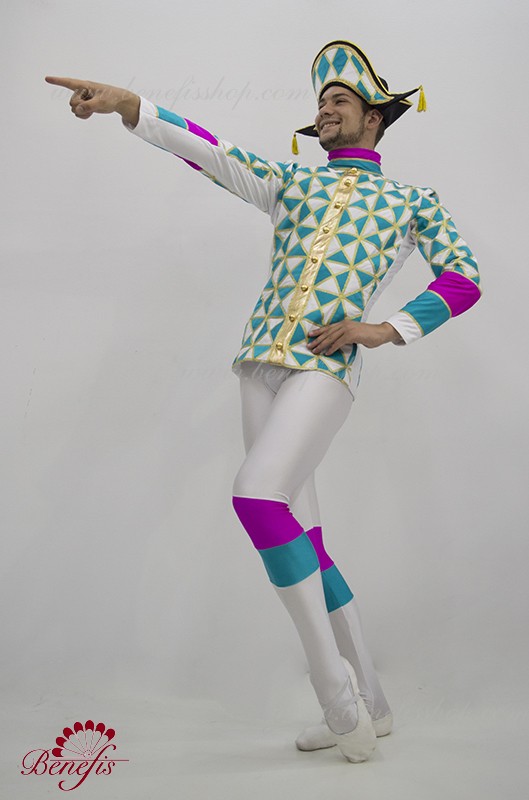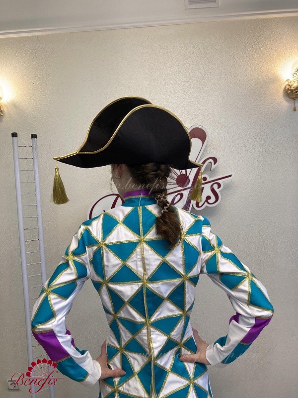 Этот профессиональный сценический костюм выполнен из эластичной ткани. Туника крепится на тыльной стороне одного ряда крючков. Воротник изготовлен из органзы. Костюм украшен треугольниками, отделанными золотой тесьмой и декоративными пуговицами. Бриджи выполнены из эластичной ткани с декоративными вставками 2-х цветов.