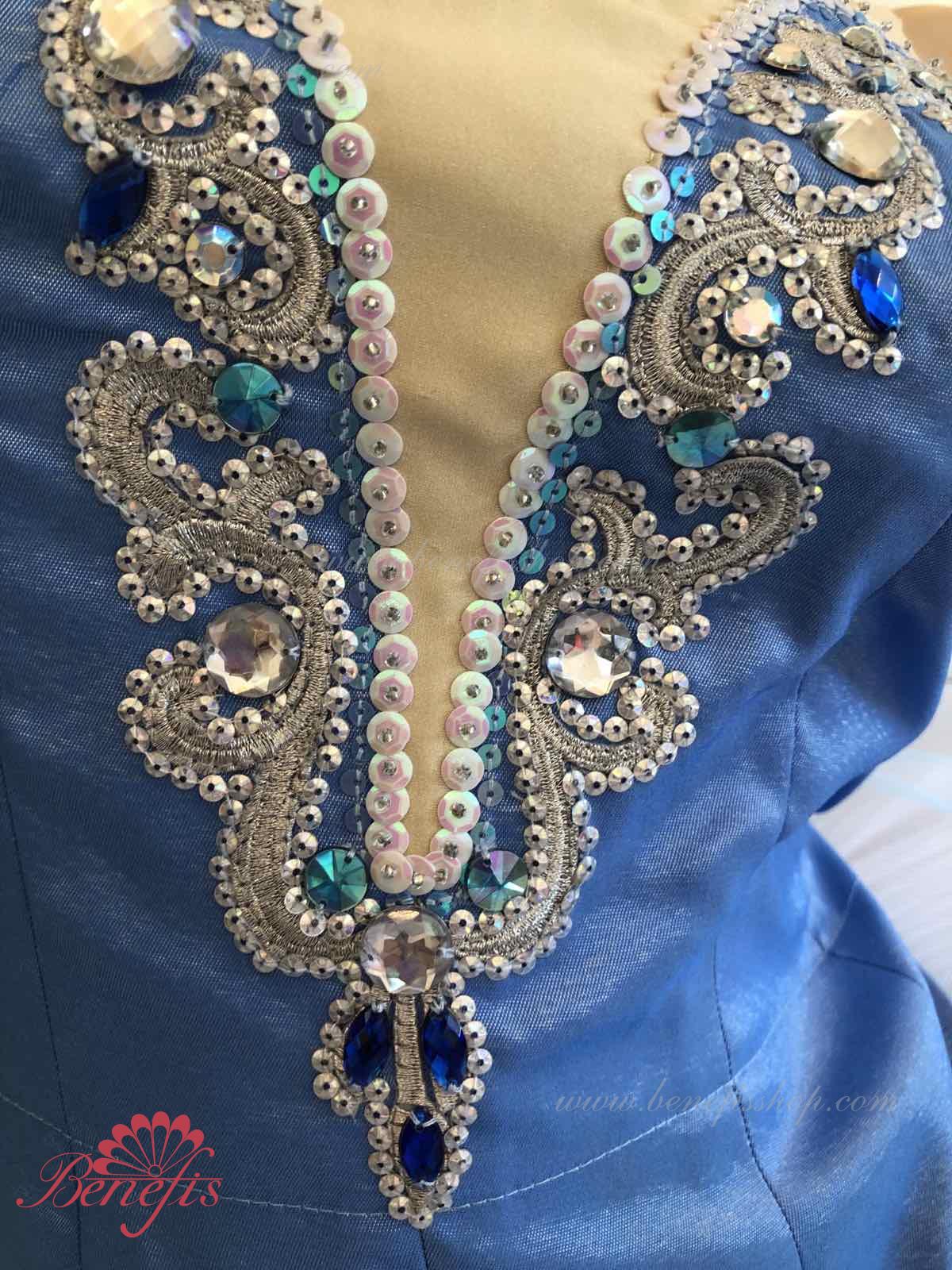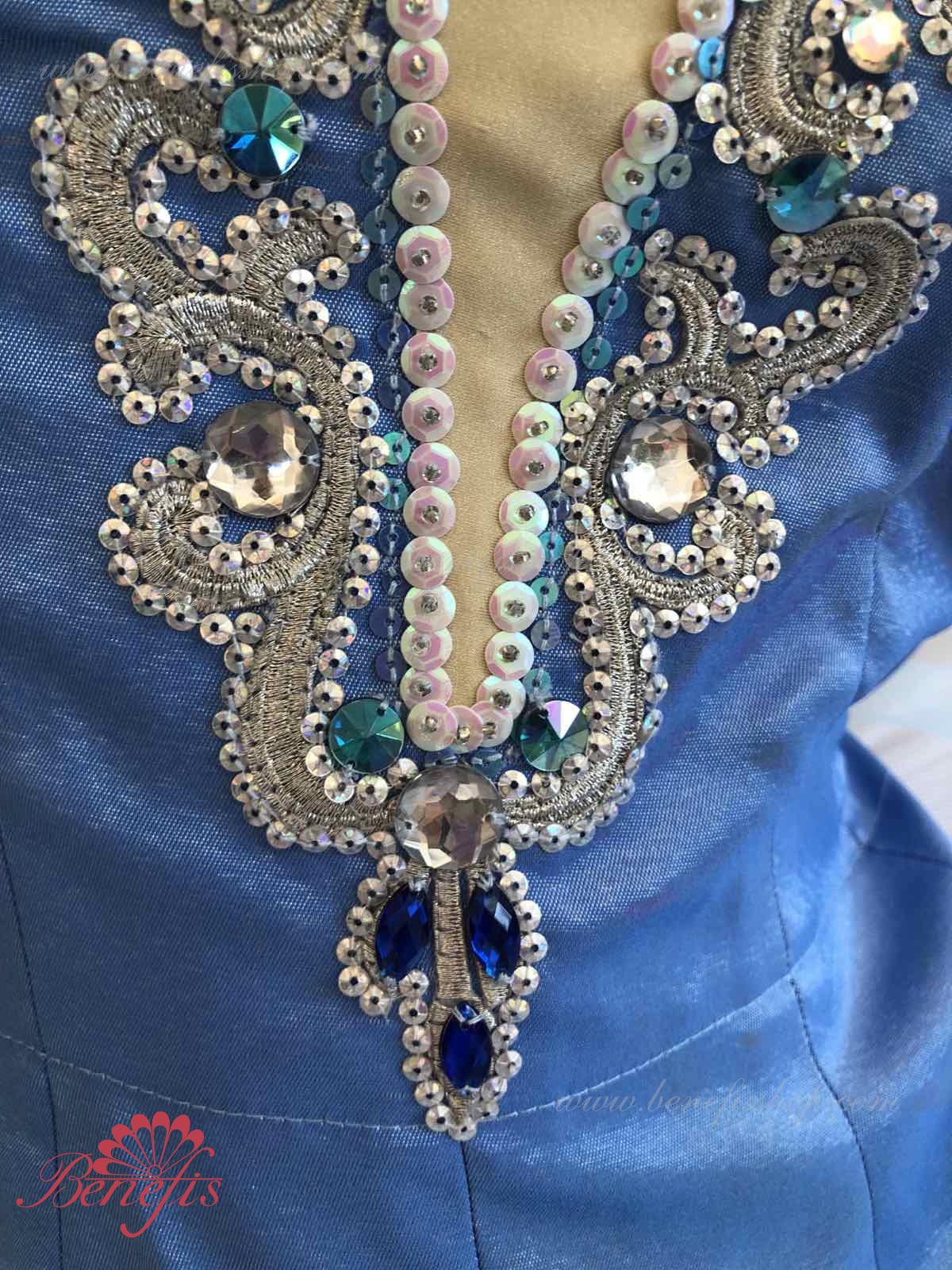 Блёстки, стразы разной величины и формы, бисер, и аппликации используются для создания искусной узорной композиции на лифе по линии вставки и по краю покрышки. Элементы декора, тщательно подобранные в тон костюма, придают костюму изысканный и роскошный вид.