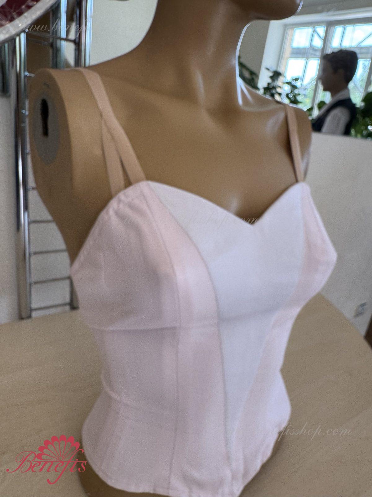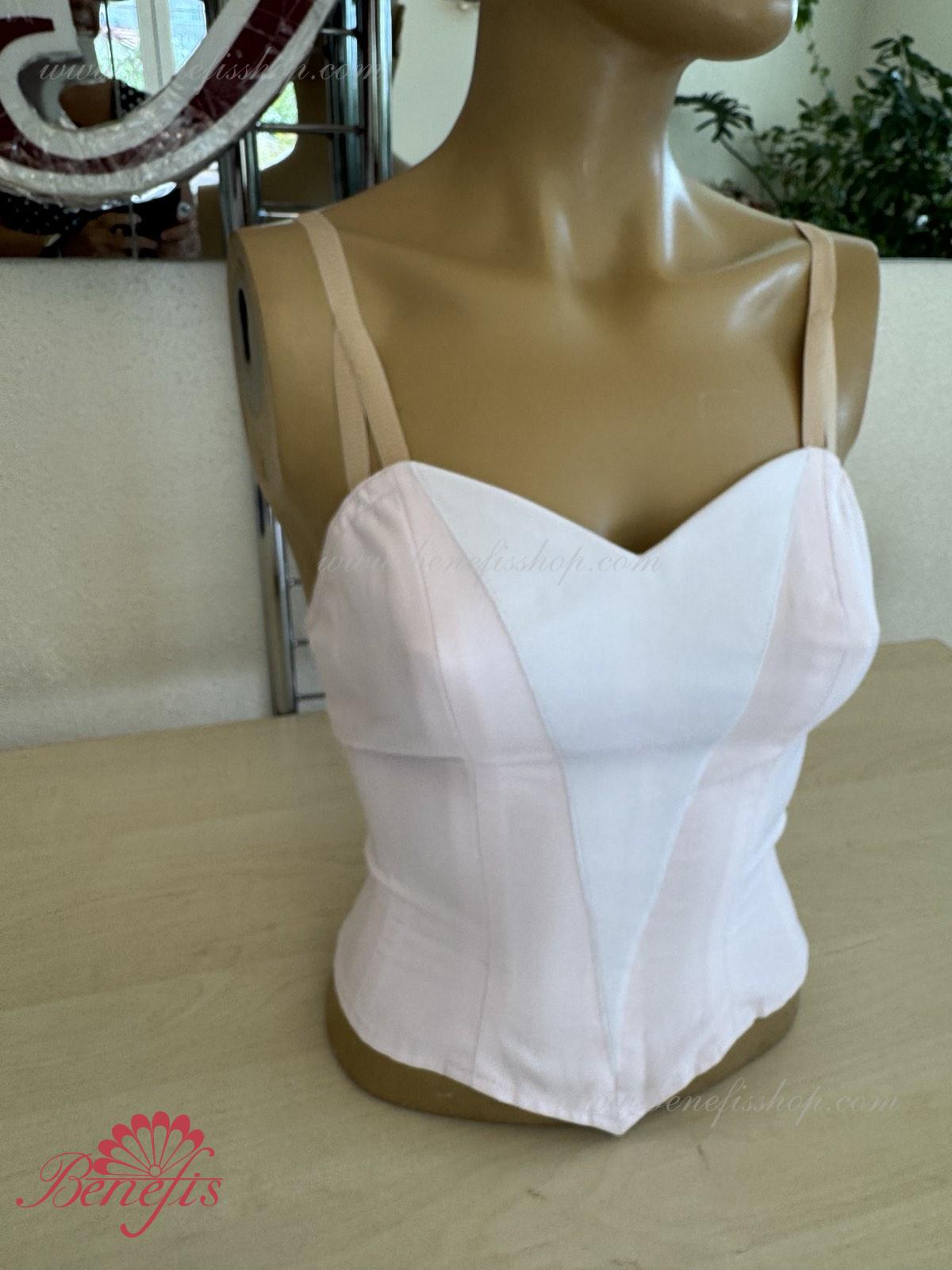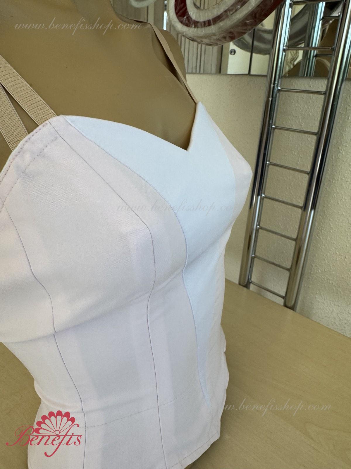 Лиф, на эластичных лямках и с белой вставкой на груди, выполнен из плотной полу эластичной ткани.