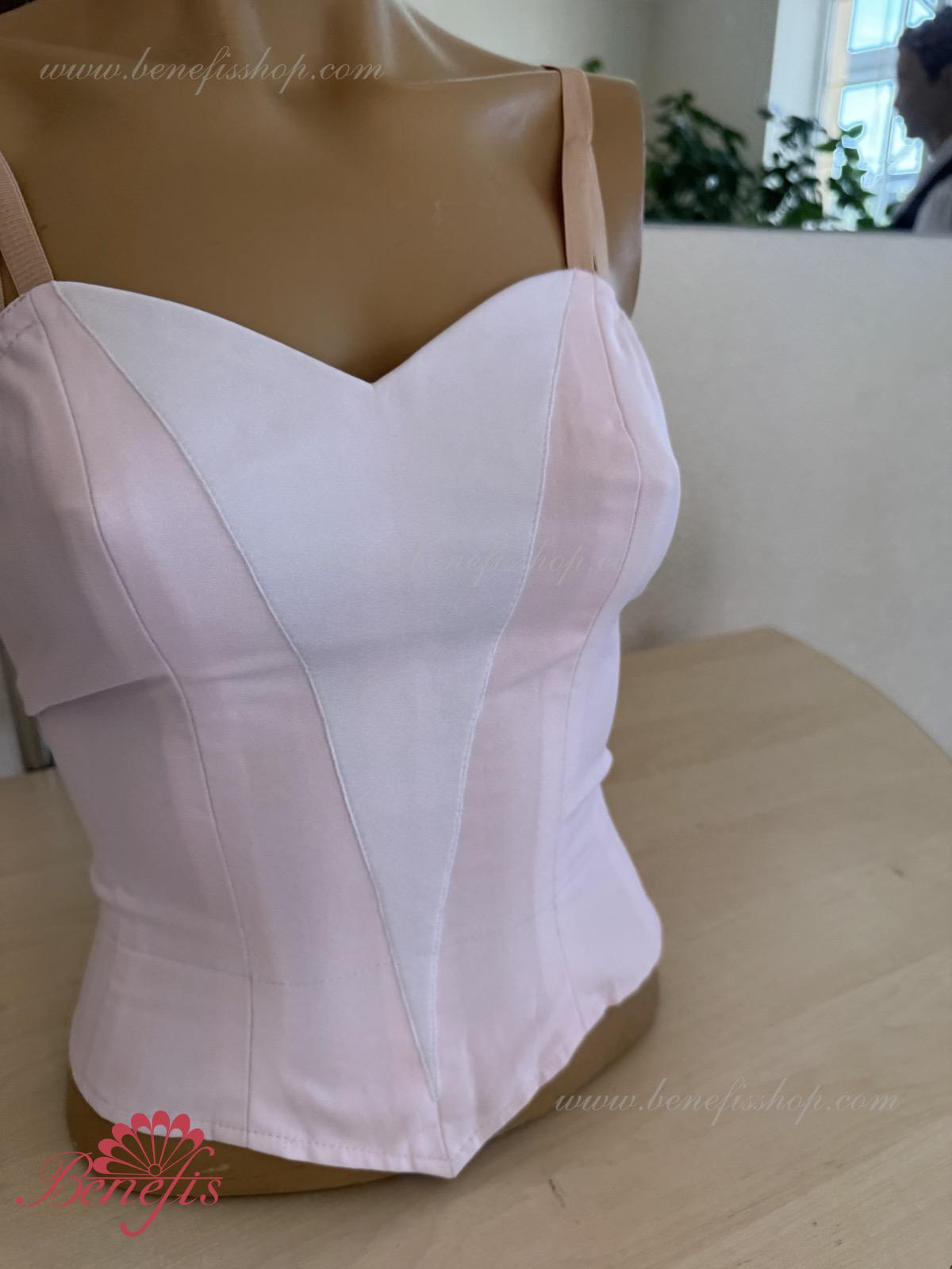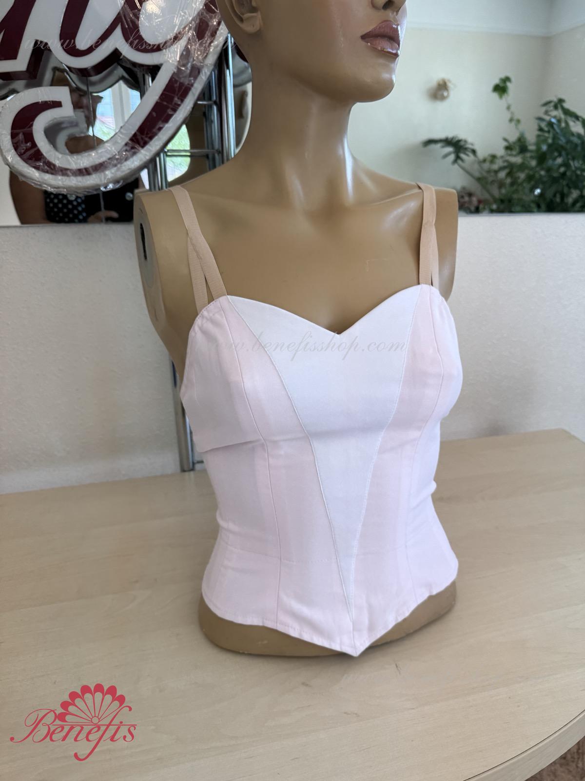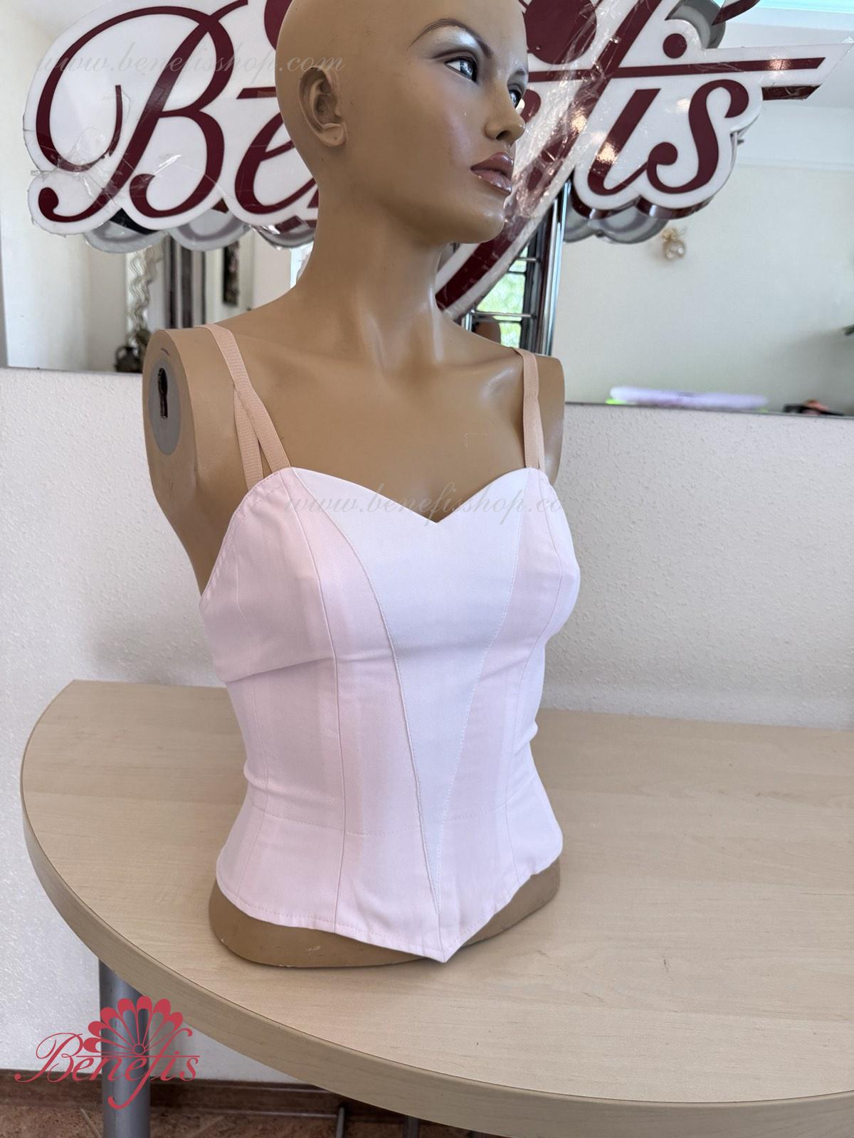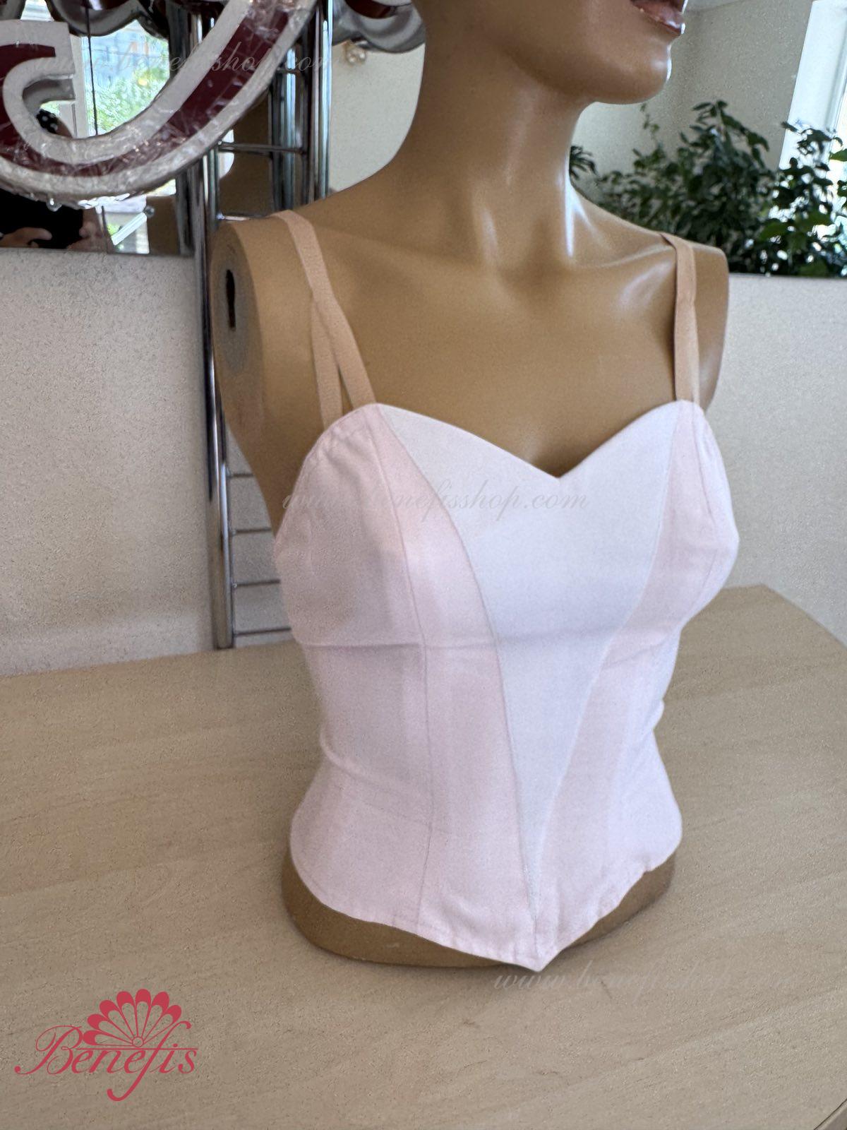 Лиф, на эластичных лямках и с белой вставкой на груди, выполнен из плотной полу эластичной ткани.