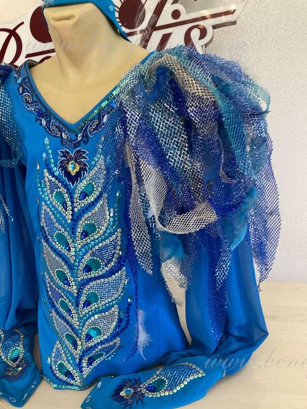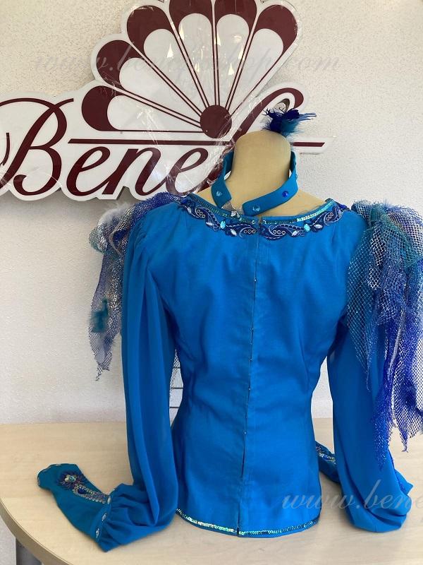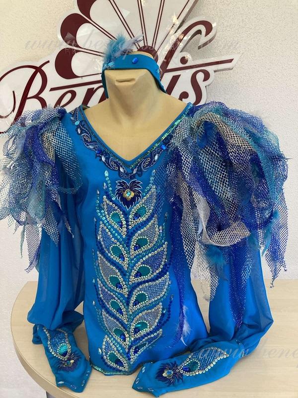 Костюм выполнен из плотной полуэластичной голубой ткани.