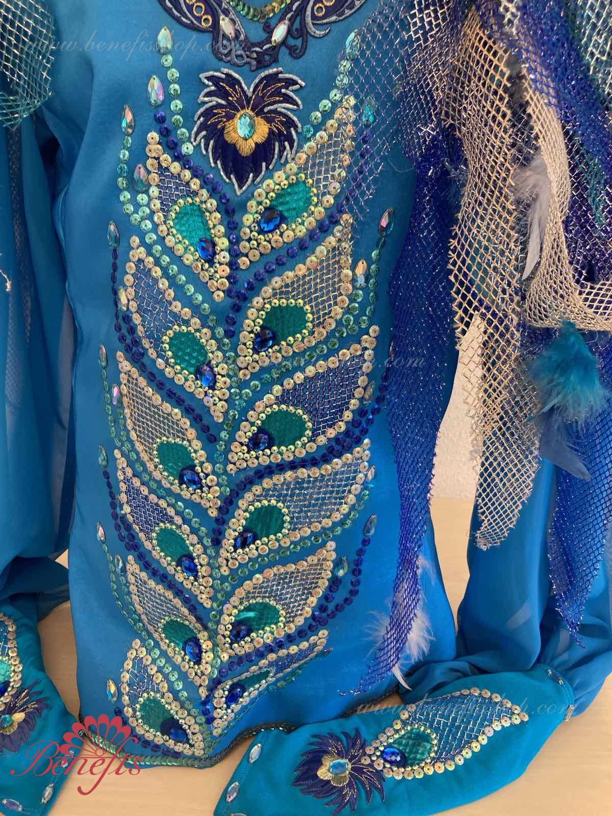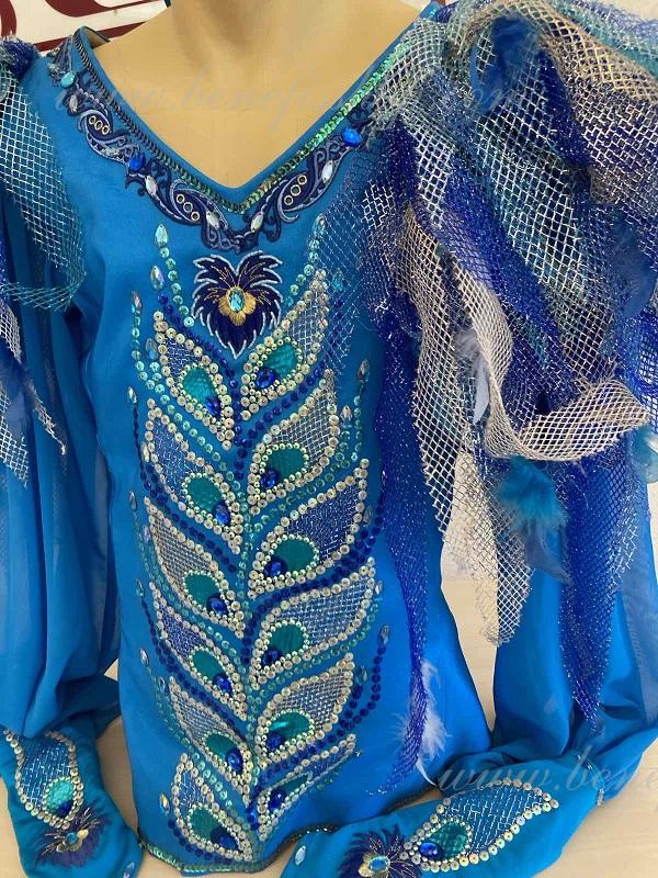 Костюм украшен натуральными перьями разных оттенков, аппликациями, блестками и стразами.