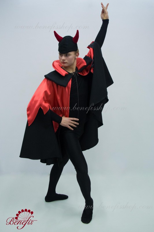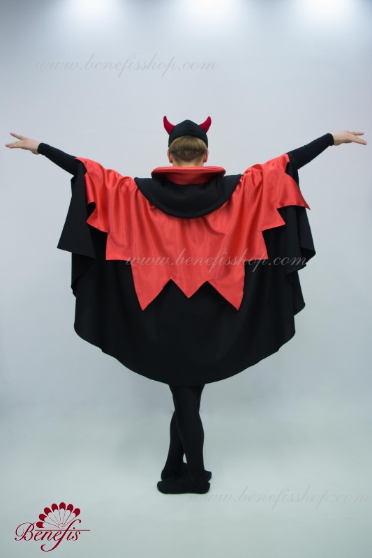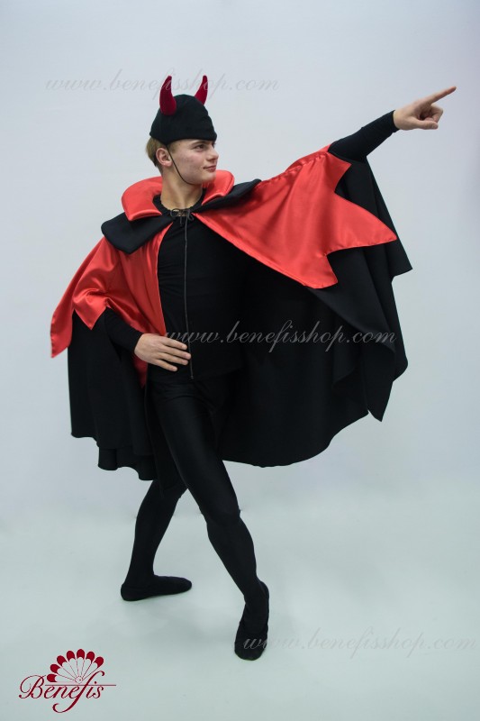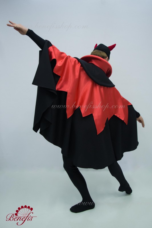 Широкая пелерина выполнена в двух слоях: один длинный – из черной легкой ткани, и верхний слой – из красного атласа. Чтобы подчеркнуть характер данного персонажа, верхний слой плаща пошит в форме зигзага имитирующий языки пламени, а стойкий за счет поролона воротник выполнен в два уровня. Плащ завязывается шнурком, который вшит под воротником.