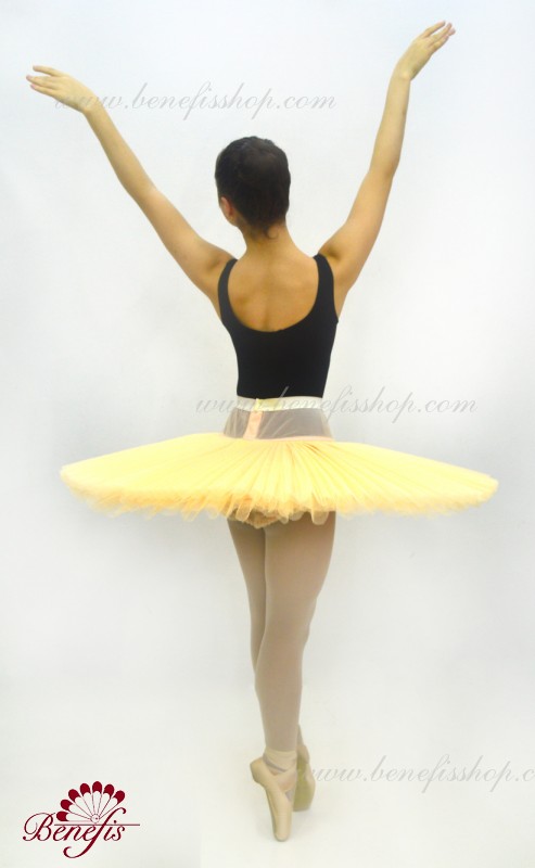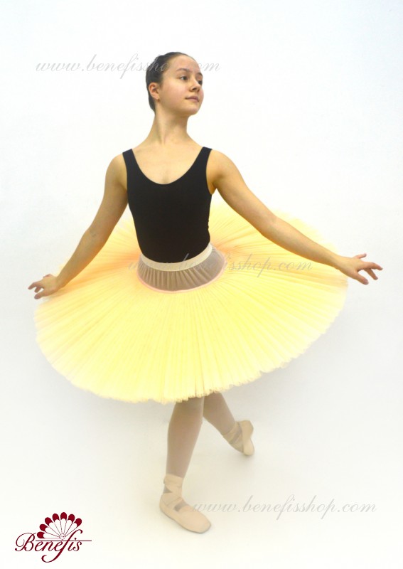 Восемь плиссированных градуированных слоёв полумягкого тюля- семь длинных и один короткий на трусиках из тюля с 10 см кокеткой, прикрепленной к эластичному поясу. Два кринолиновых обруча внедрёны в средний слой с двумя дополнительными короткими оборками по краям. Длина верхнего слоя - 36-38 см, каждый следующий слой на 4 см короче. Пачка застегивается сзади на 6 больших крючков и петелек. Эта балетная репетиционная пачка может быть выполнена как на взрослого, так и на ребёнка.