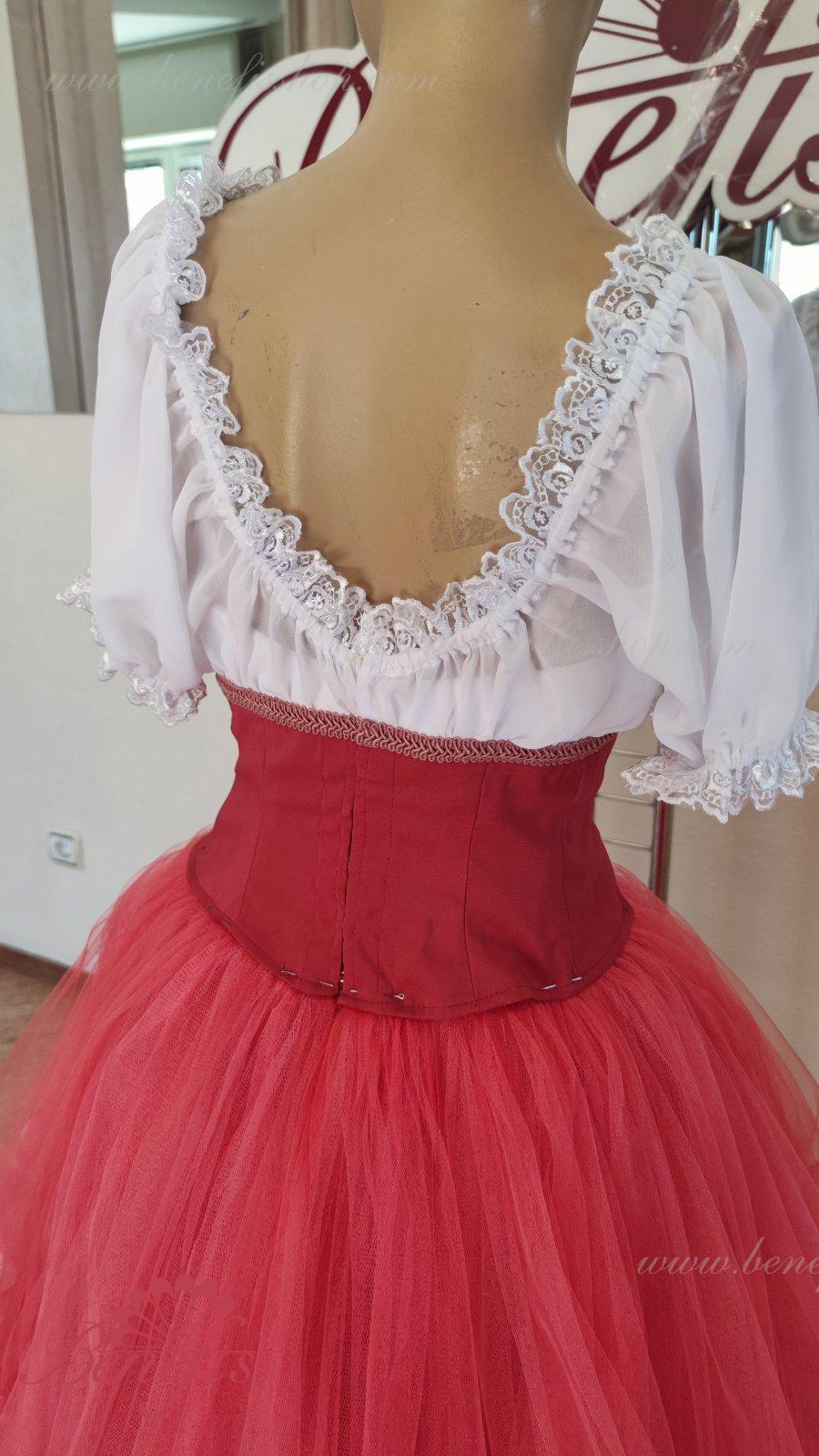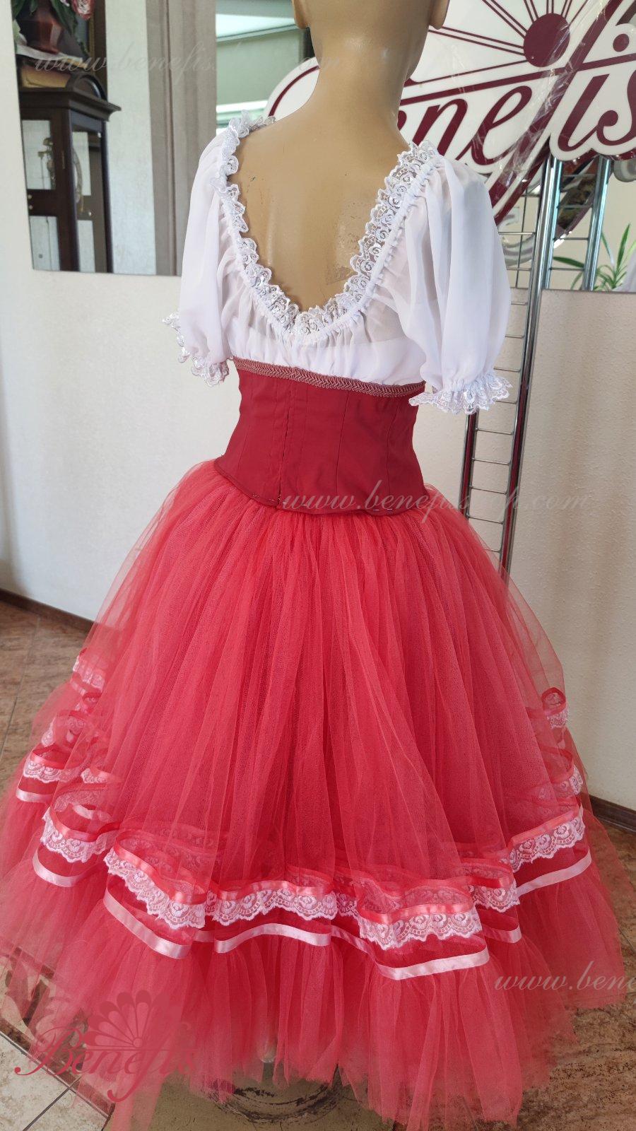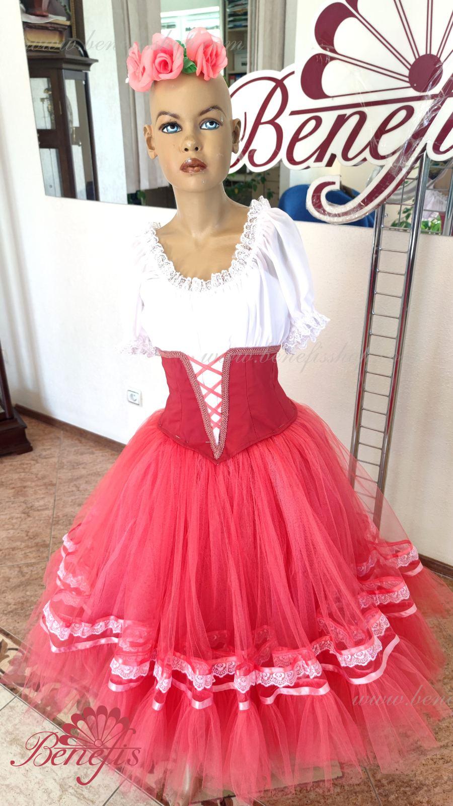 Костюм выполняется в крестьянском стиле с маленьким фартуком спереди и атласной тесьмой и кружевом по нижней части верхнего слоя юбки.