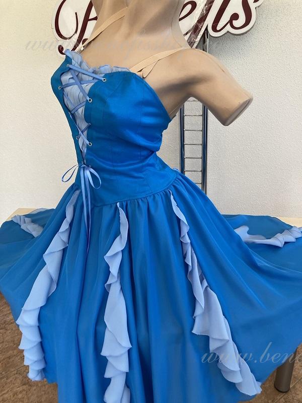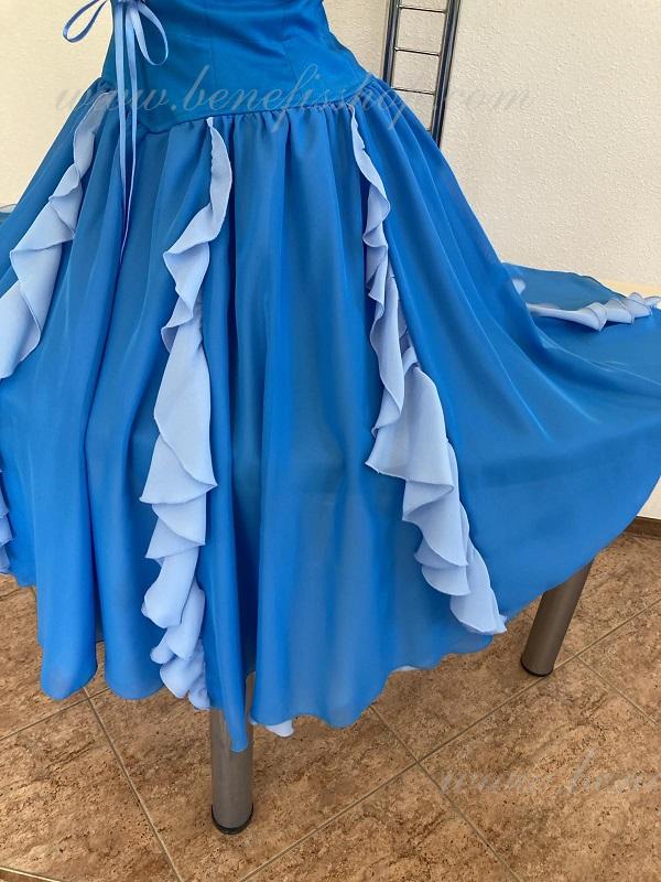 Юбка состоит из двух слоёв ткани и выполнена из клиньев. Оборки из ткани контрастного цвета расположены вертикально вдоль клиньев.