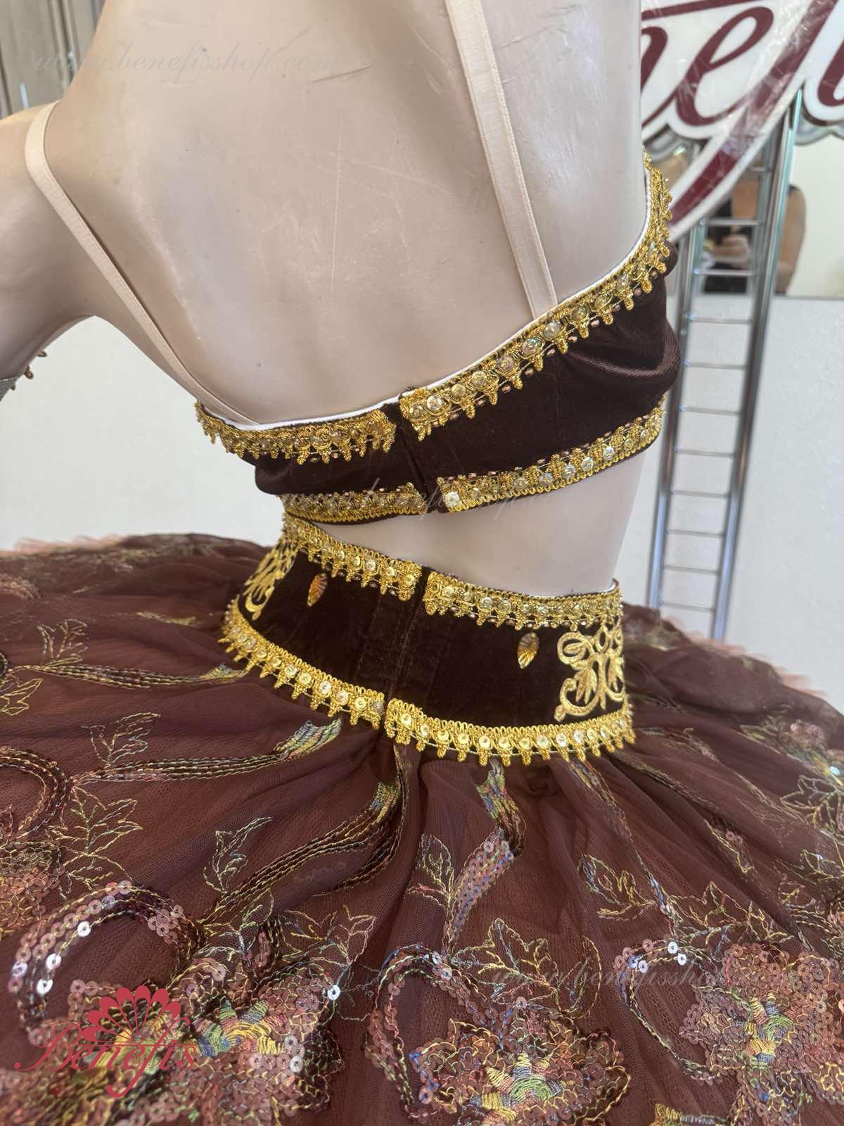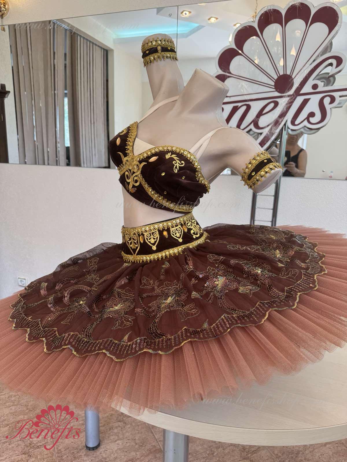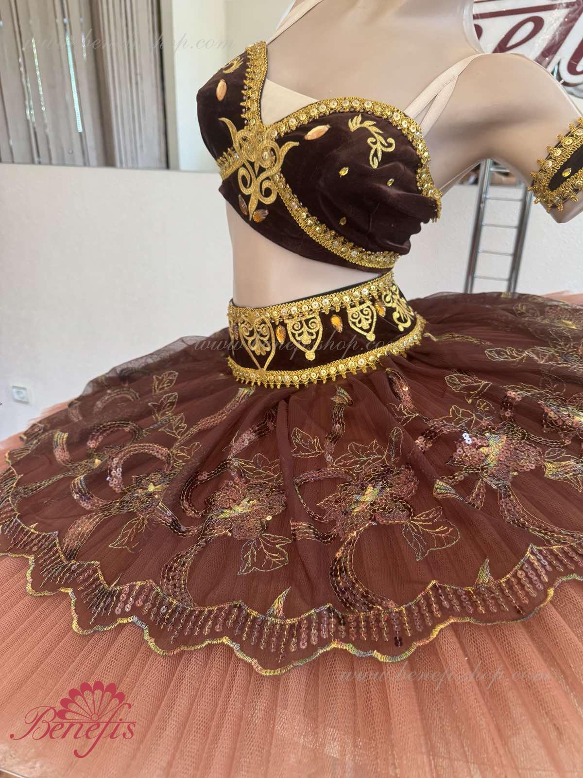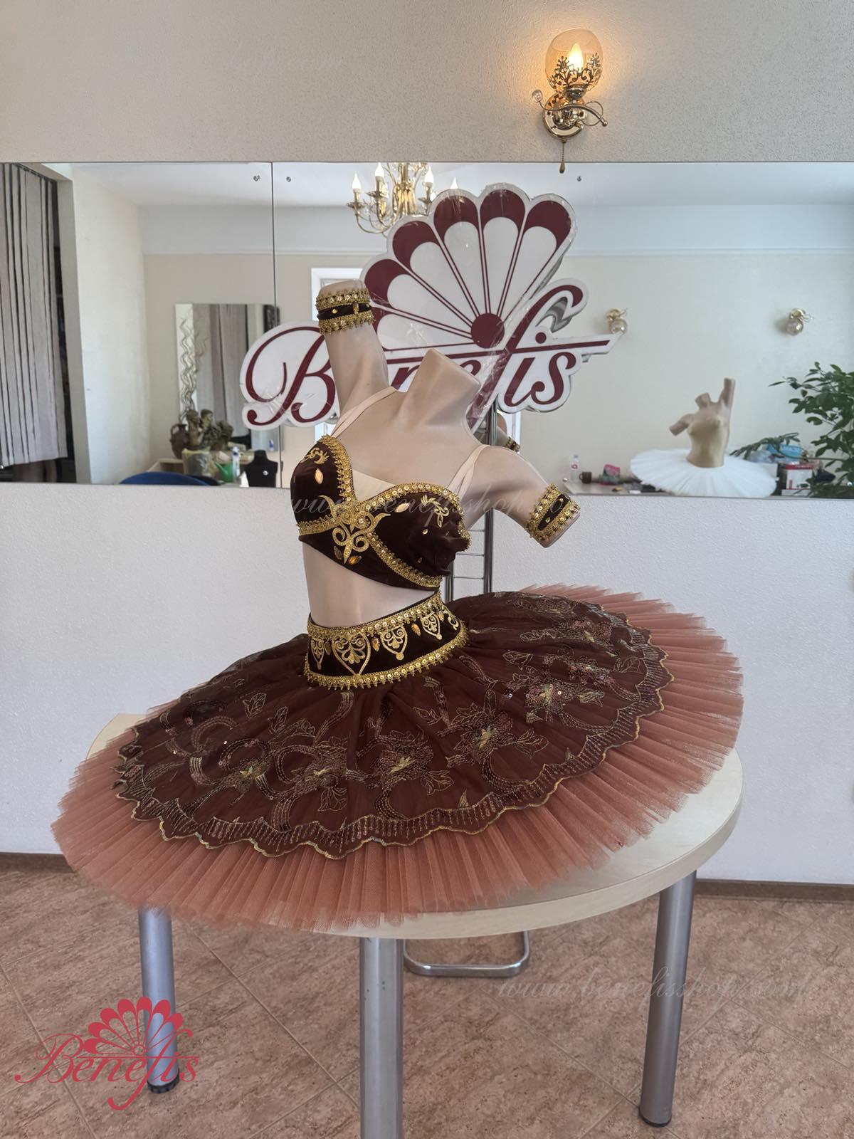 Детали: костюм. Лиф короткий и кокетка от декорированы аппликациями, бусами, стразами и тесьмой, базик T0001B слегка опущен украшен покрышкой из гипюра. Восемь плиссированных градуированных слоёв полумягкого тюля- семь длинных и один короткий на трусиках из тюля с 10 см кокеткой, прикрепленной к эластичному поясу. Два кринолиновых обруча внедрены в средний слой с двумя дополнительными короткими оборками по краям. Длина верхнего слоя - 36-38 см, каждый следующий слой на 4 см короче. Пачка застегивается сзади на 6 больших крючков и петелек.