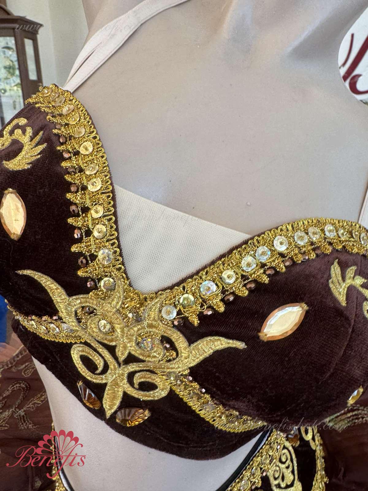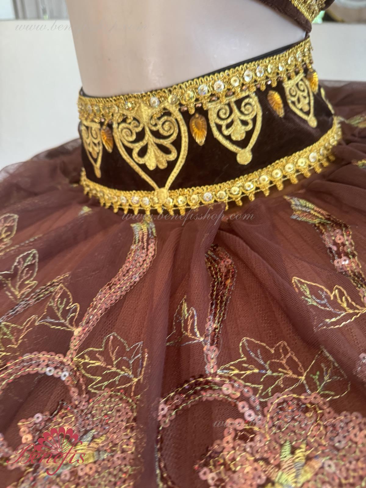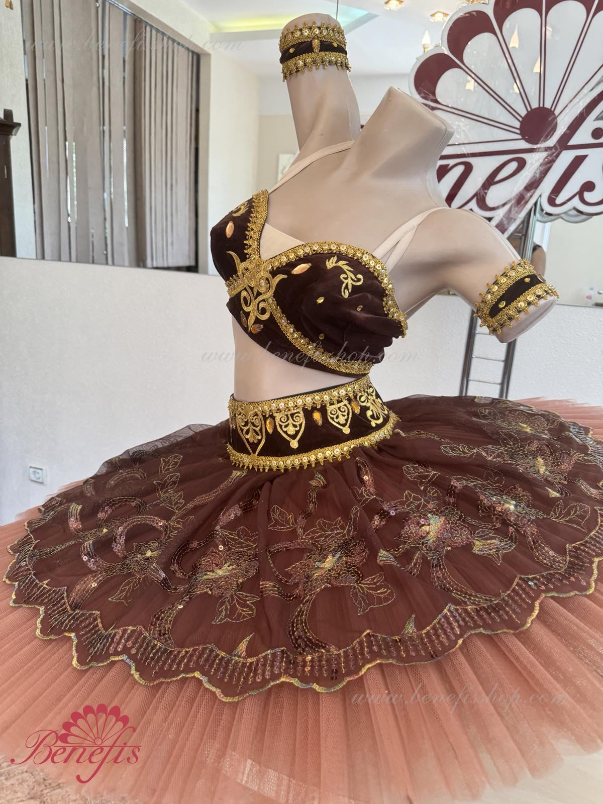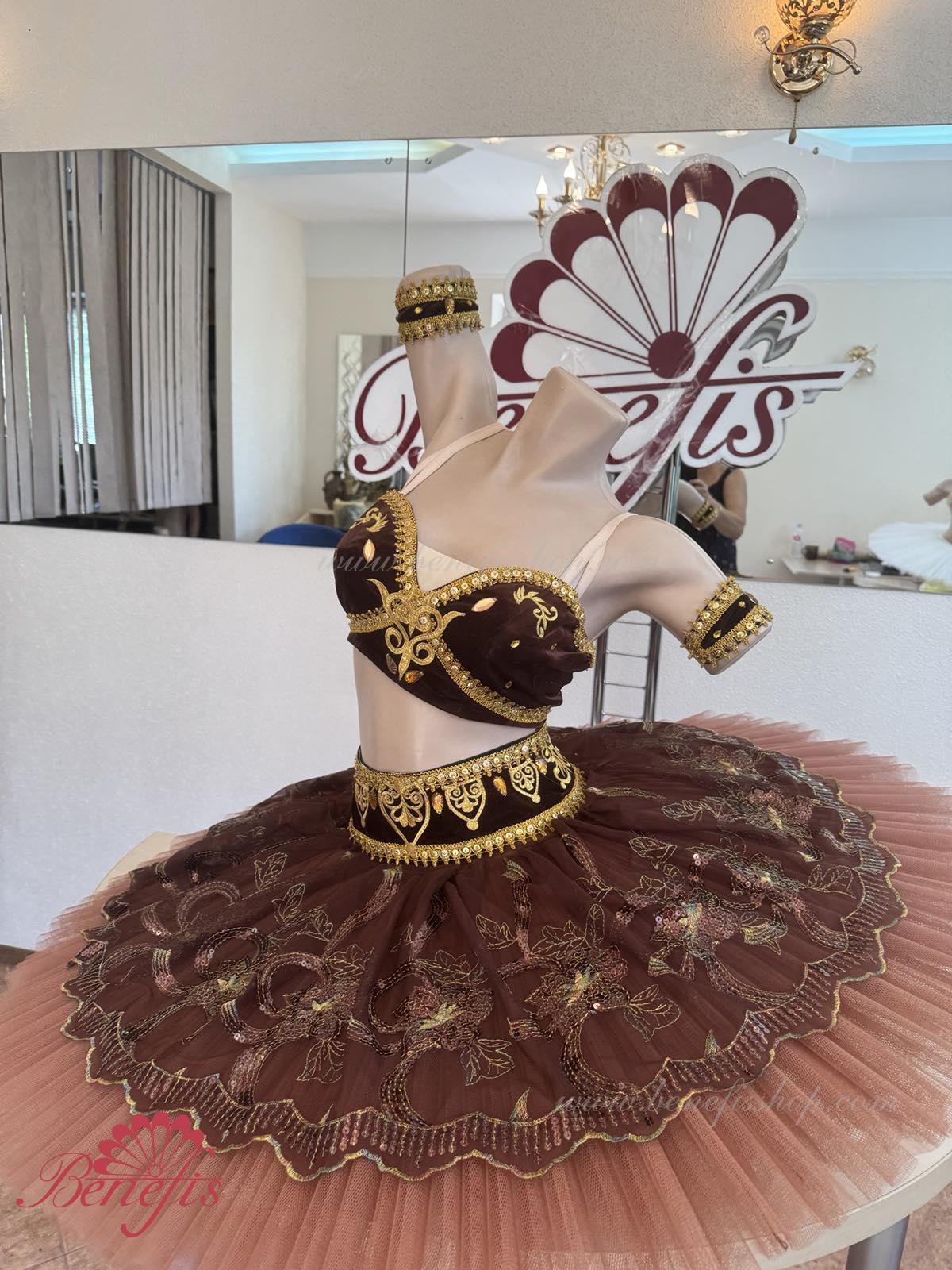 Детали: костюм. Лиф короткий и кокетка от декорированы аппликациями, бусами, стразами и тесьмой, базик T0001B слегка опущен украшен покрышкой из гипюра. Восемь плиссированных градуированных слоёв полумягкого тюля- семь длинных и один короткий на трусиках из тюля с 10 см кокеткой, прикрепленной к эластичному поясу. Два кринолиновых обруча внедрены в средний слой с двумя дополнительными короткими оборками по краям. Длина верхнего слоя - 36-38 см, каждый следующий слой на 4 см короче. Пачка застегивается сзади на 6 больших крючков и петелек.