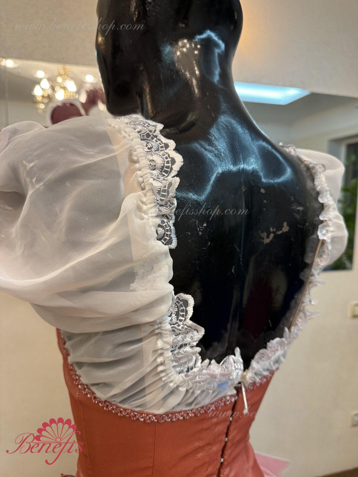 Сложный лиф выполняется из плотной полуэластичной ткани с декоративной шнуровкой спереди. Лиф переходит в легкую шифоновую блузку с рукавами – фонариками на резинках.