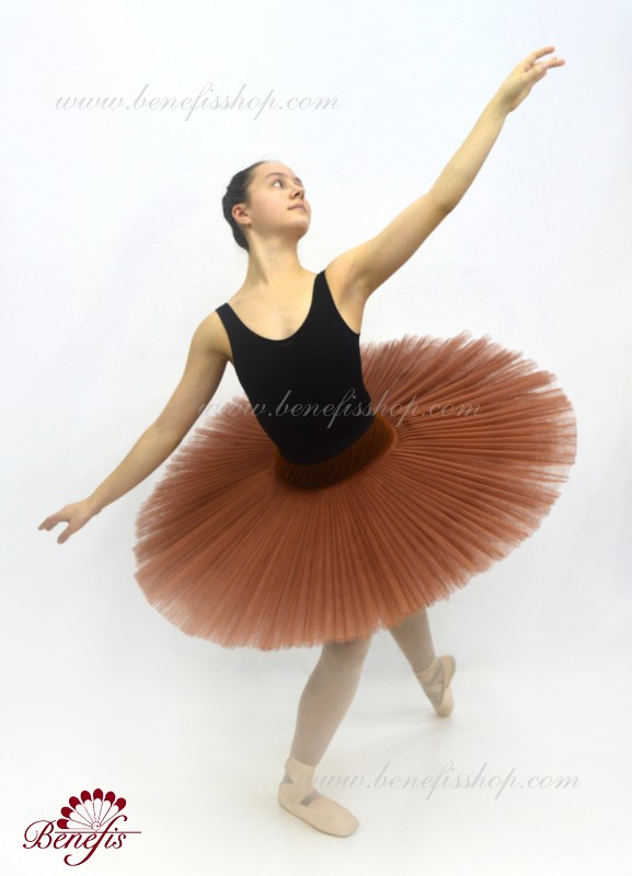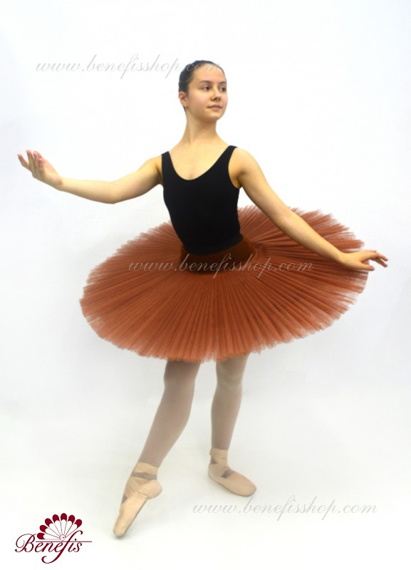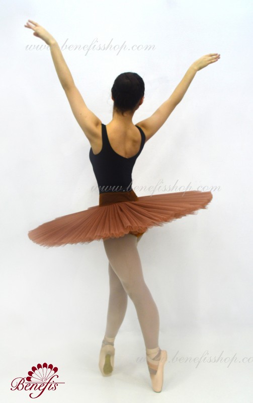 Восемь плиссированных градуированных слоёв из жесткого тюля - семь длинных и один короткий на трусиках из тюля с 10 см кокеткой, прикрепленной к эластичному поясу. Два кринолиновых обруча внедрёны в средний слой с одной дополнительной короткой оборкой по краям. Длина верхнего слоя - 36 см. Первые два слоя на 2 см короче, каждые последующий слой на 5 см короче предыдущего. Пачка застегивается сзади на 6 больших крючков и петелек.
