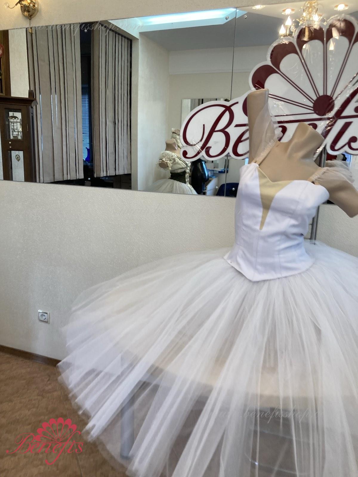 Воздушный костюм выполнен на основе лифа из полуэластичной ткани и пышной юбки.