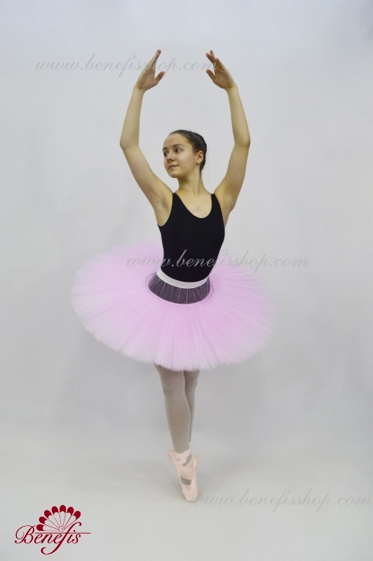 Балетная пачка состоит из мягкого фатина и 5-ти слоёв. Верхний слой заложен в складки, остальные в сборку. Слои посажены на трусики с рюшами и с кокеткой на эластичной резинке. Для плоской формы пачка состоит на первом кринолине.