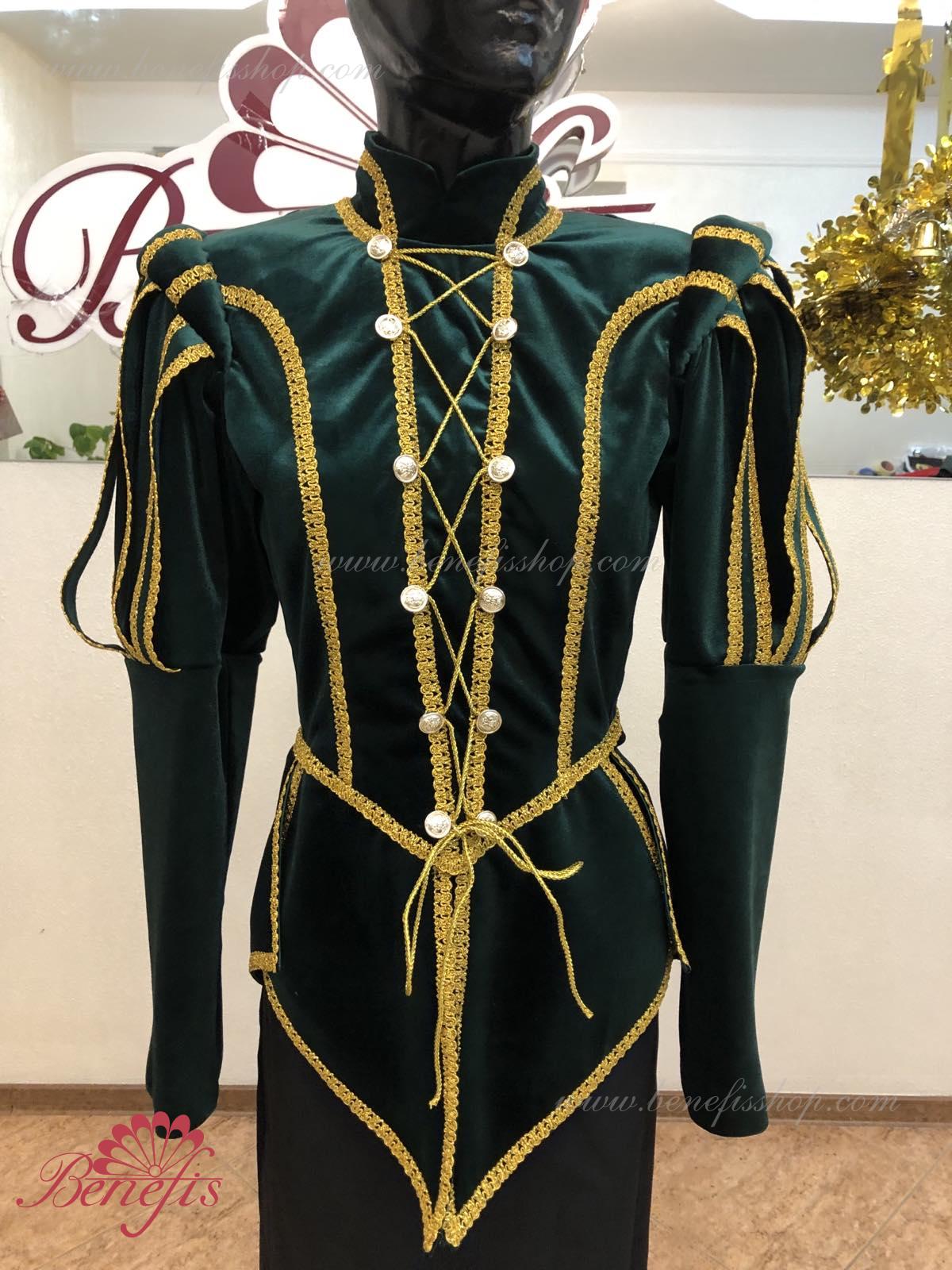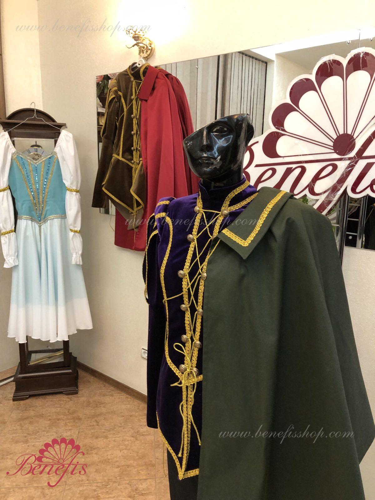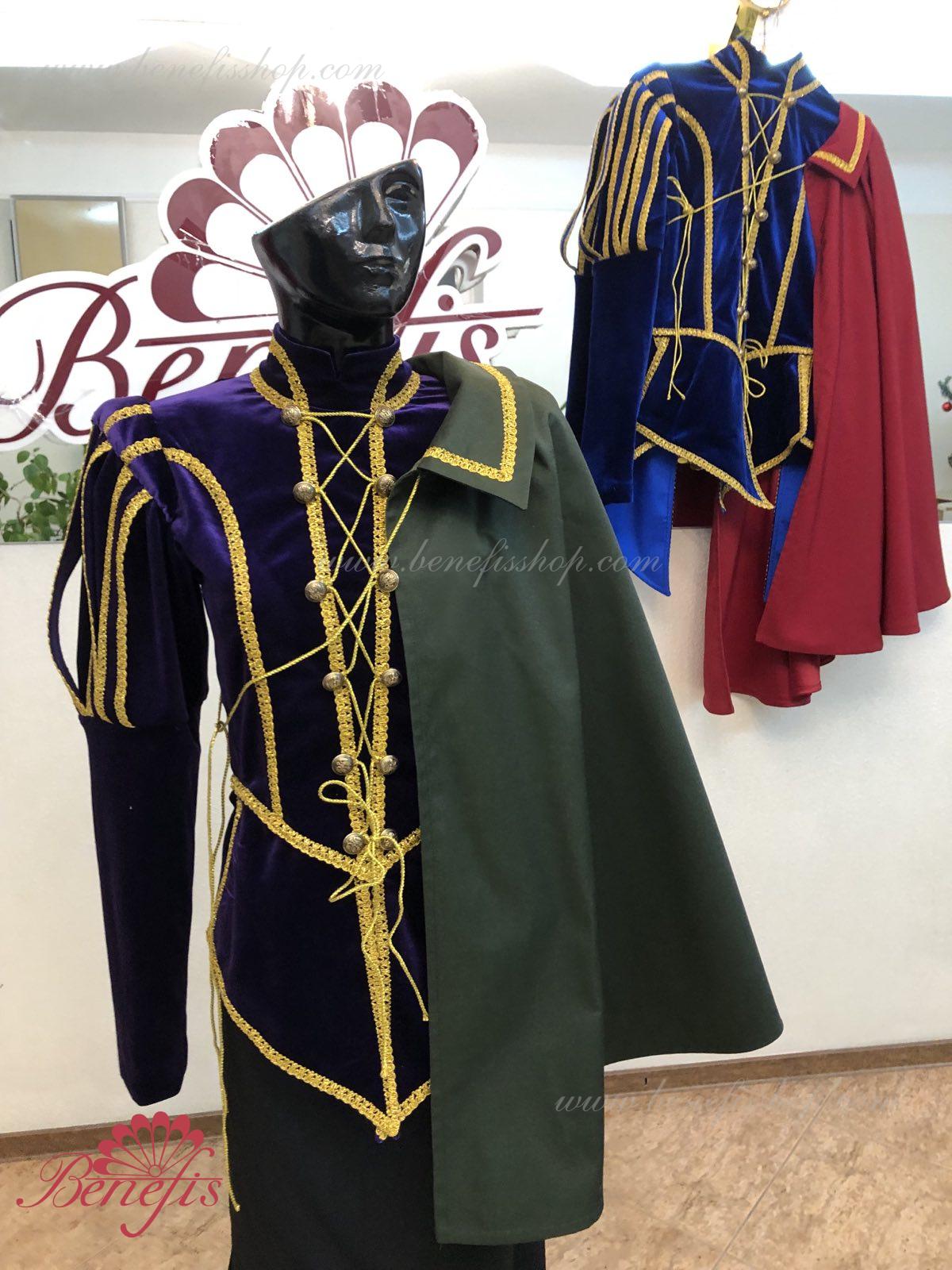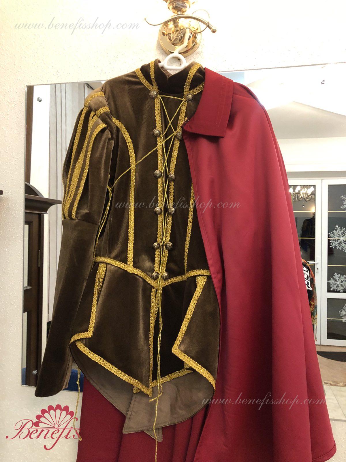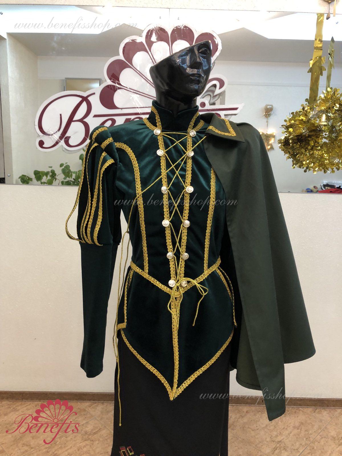 Детали : колет, накидка. Это профессиональный сценический костюм изготовленный из основе полу эластичной плотной ткани. Колет застегивается сзади на крючки и петли. В качестве декора используется пуговицы впереди колета. Костюм может быть выполнен в любом цвете по выбору заказчика. Над изделием работают только профессиональные швеи и конструктора.