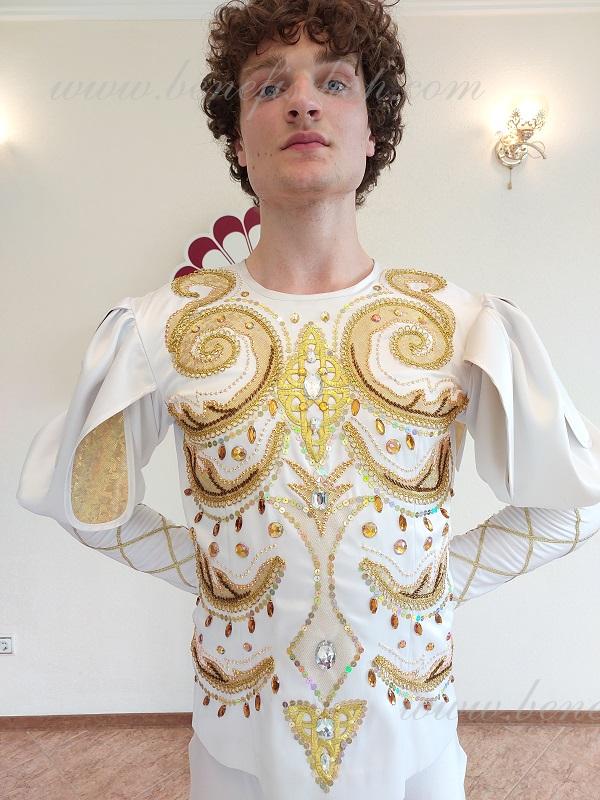 Этот профессиональный сценический костюм выполнен в средневековом стиле из полуэластичной белой и плотной серебряной ткани.