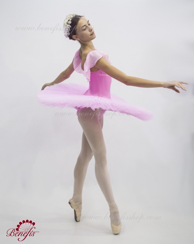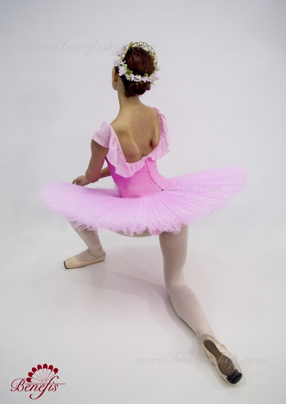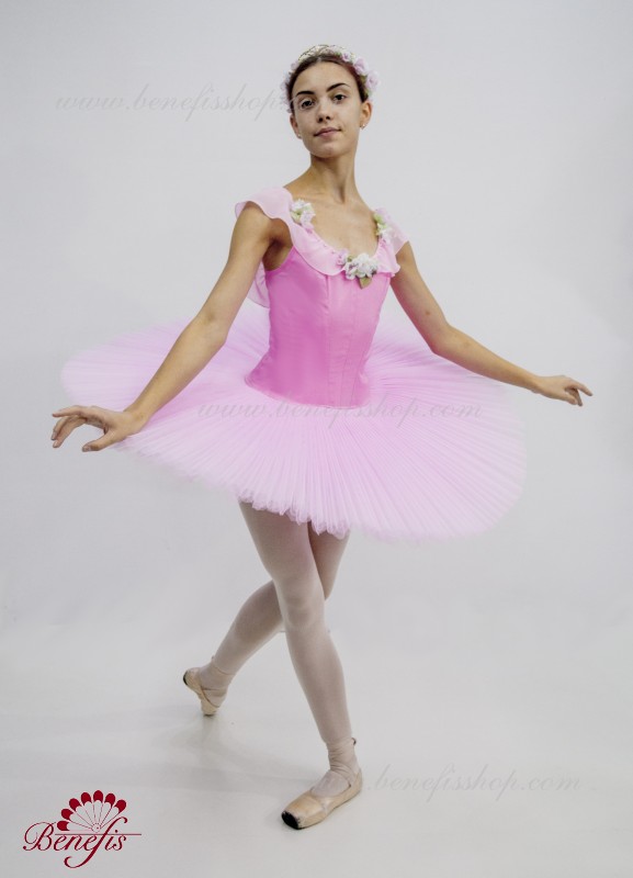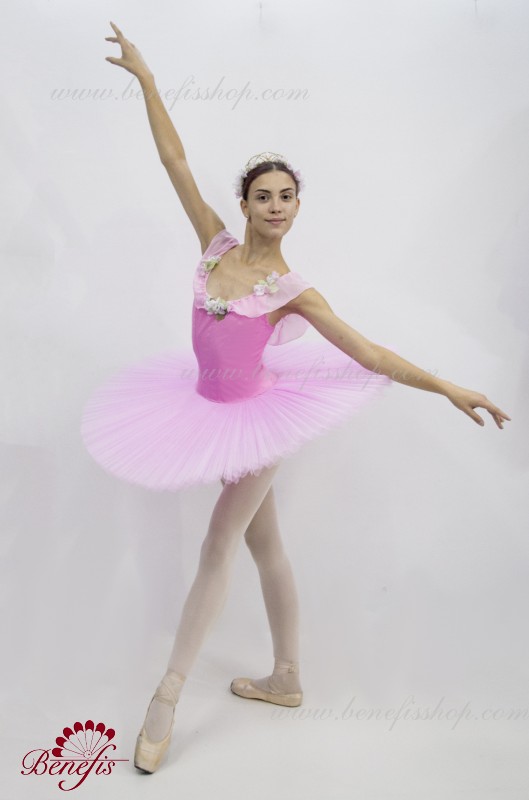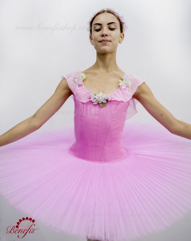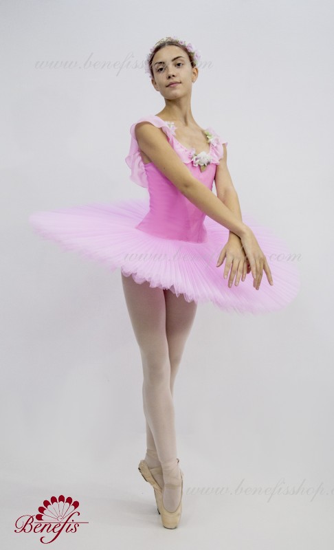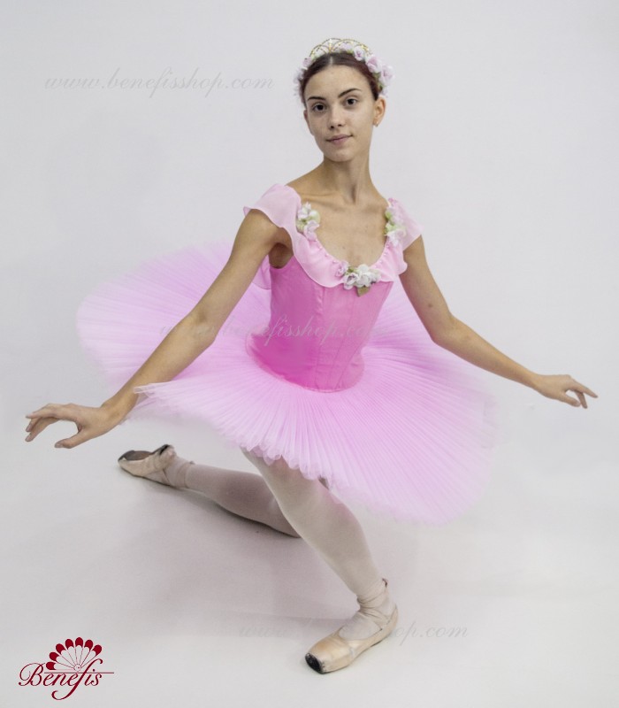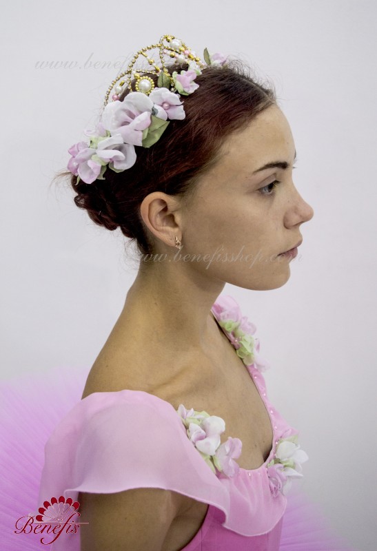 Сценический костюм выполнен из лифа, с рюшей переходящей в рукава и украшен цветами и бусинками. Пачка на основе T0001B. Головной убор можете приобрести за отдельную плату.