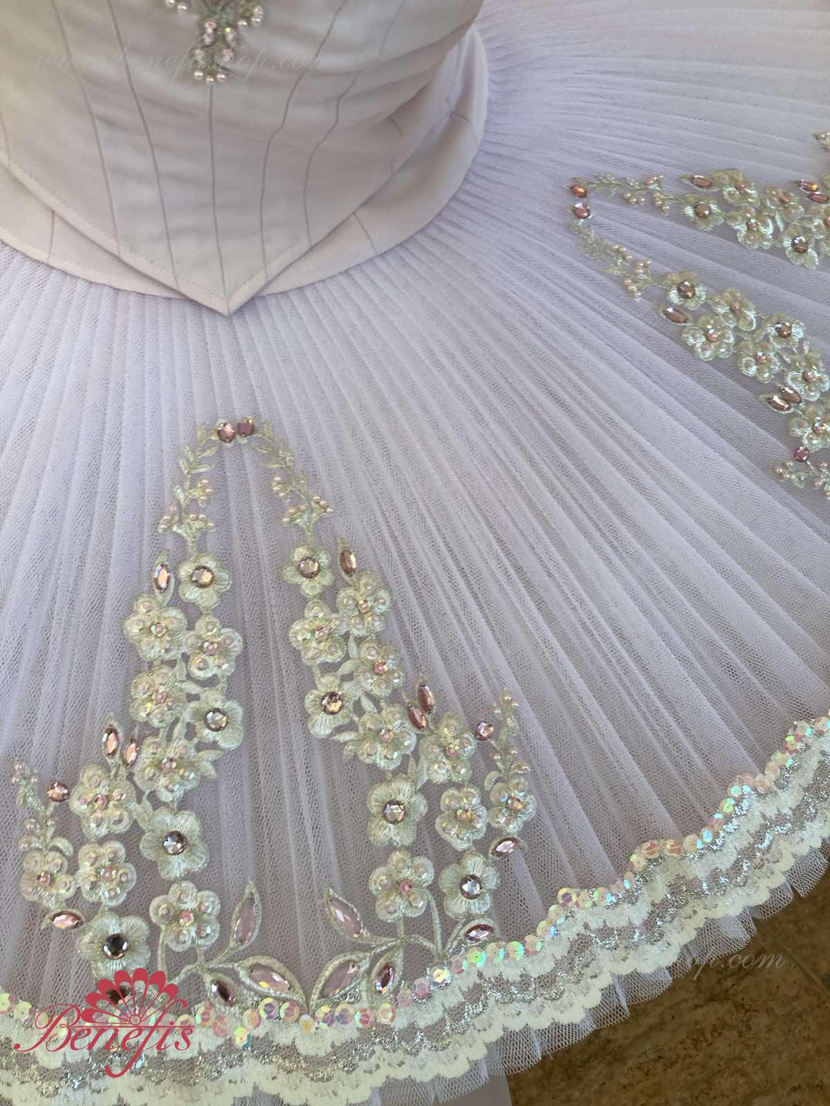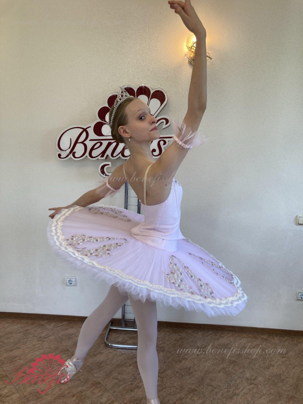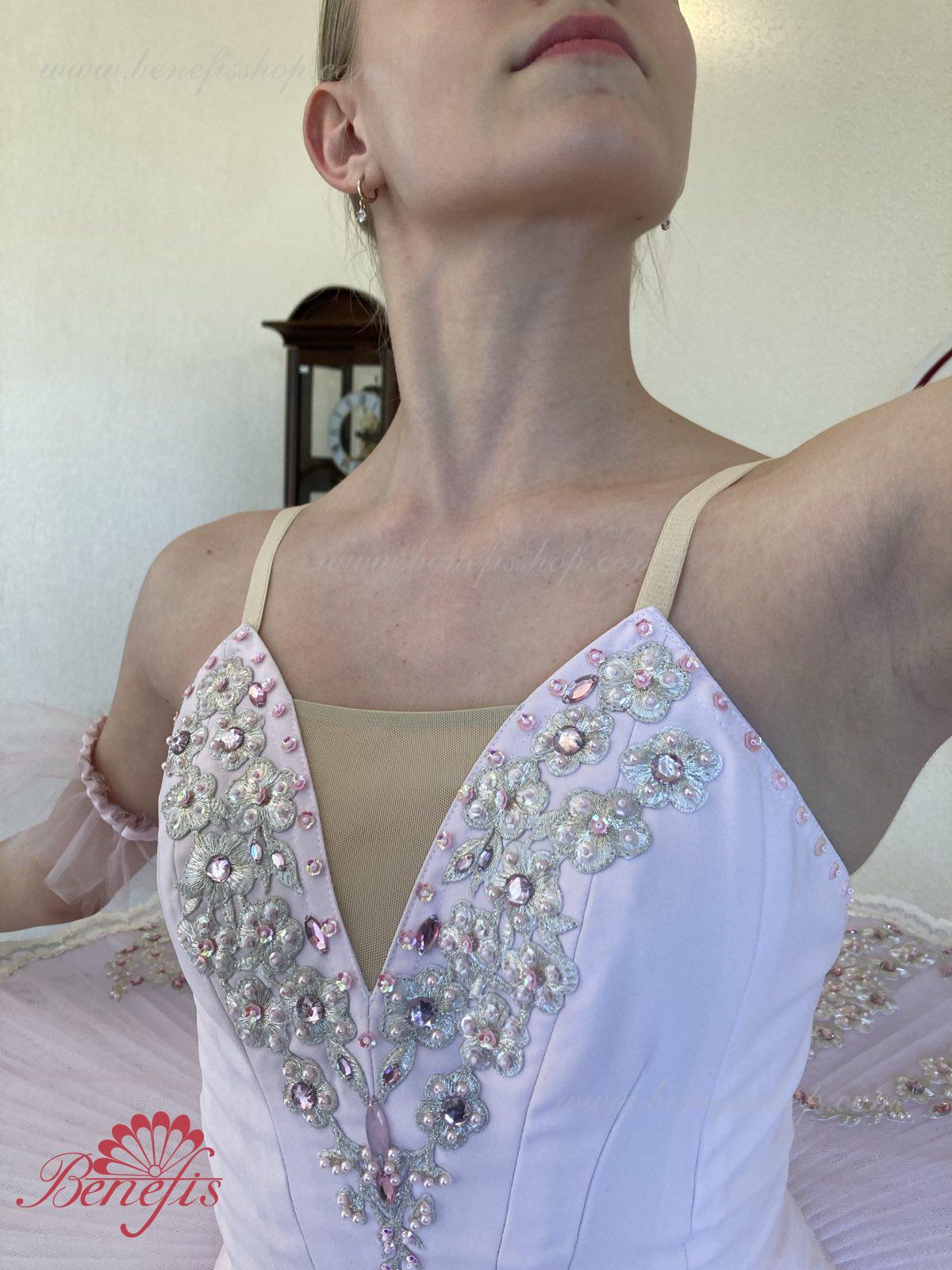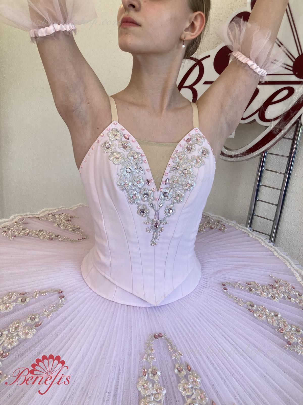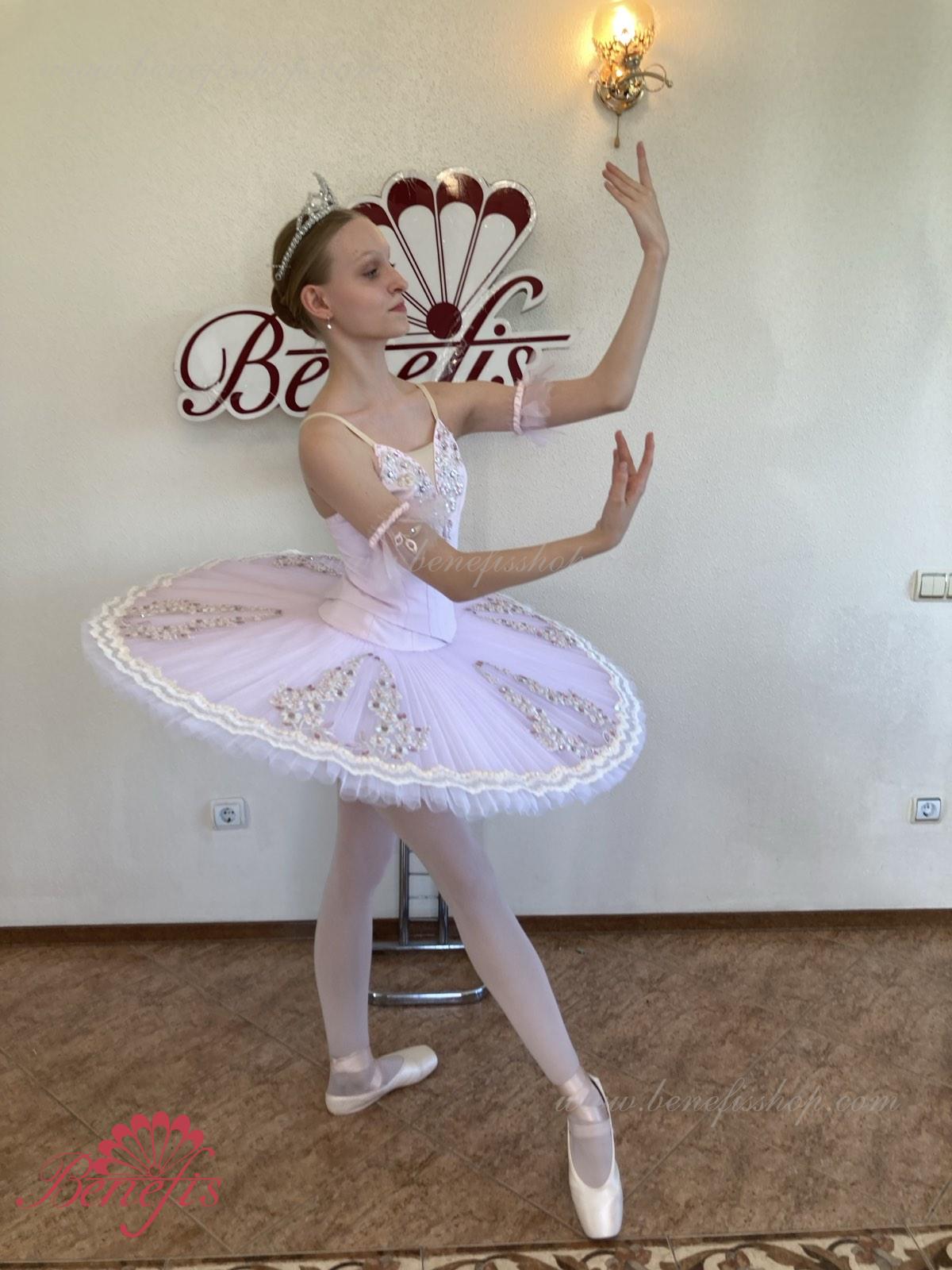 Детали: костюм, покрышка, рукава. Лиф на эластичных лямках, выполнен из плотной полу эластичной ткани. Данная модель выполнена из двух частей, которые крепятся между собой с помощью резинок, в области талии. Нижняя часть пришивается к пачке или юбке. Верхняя часть накладывается на нижнюю что позволяет регулировать длину лифа в зависимости от роста балерины, и придает лифу большую подвижность.Лиф застегивается на крючки в два ряда для удобного регулирования, внутренний шнур служит для затягивания лифа в области груди.Восемь плиссированных градуированных слоёв полумягкого тюля- семь длинных и один короткий на трусиках из тюля с 10 см кокеткой, прикрепленной к эластичному поясу. Два кринолиновых обруча внедрены в средний слой с двумя дополнительными короткими оборками по краям. Длина верхнего слоя - 36-38 см, каждый следующий слой на 4 см короче. Пачка застегивается сзади на 6 больших крючков и петелек.