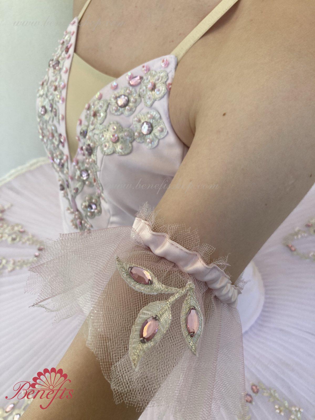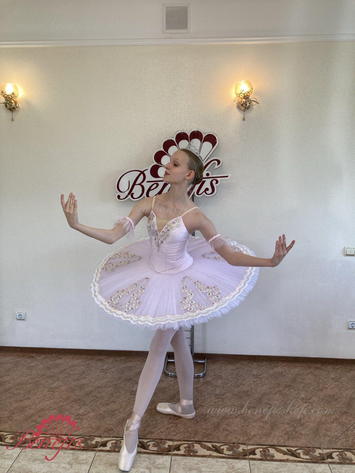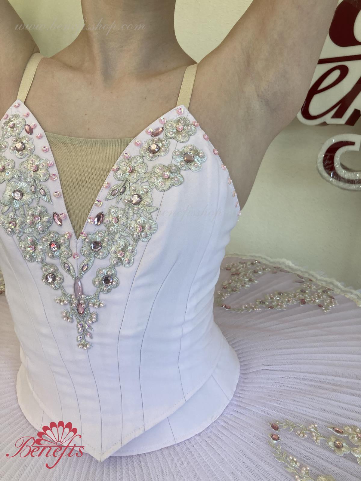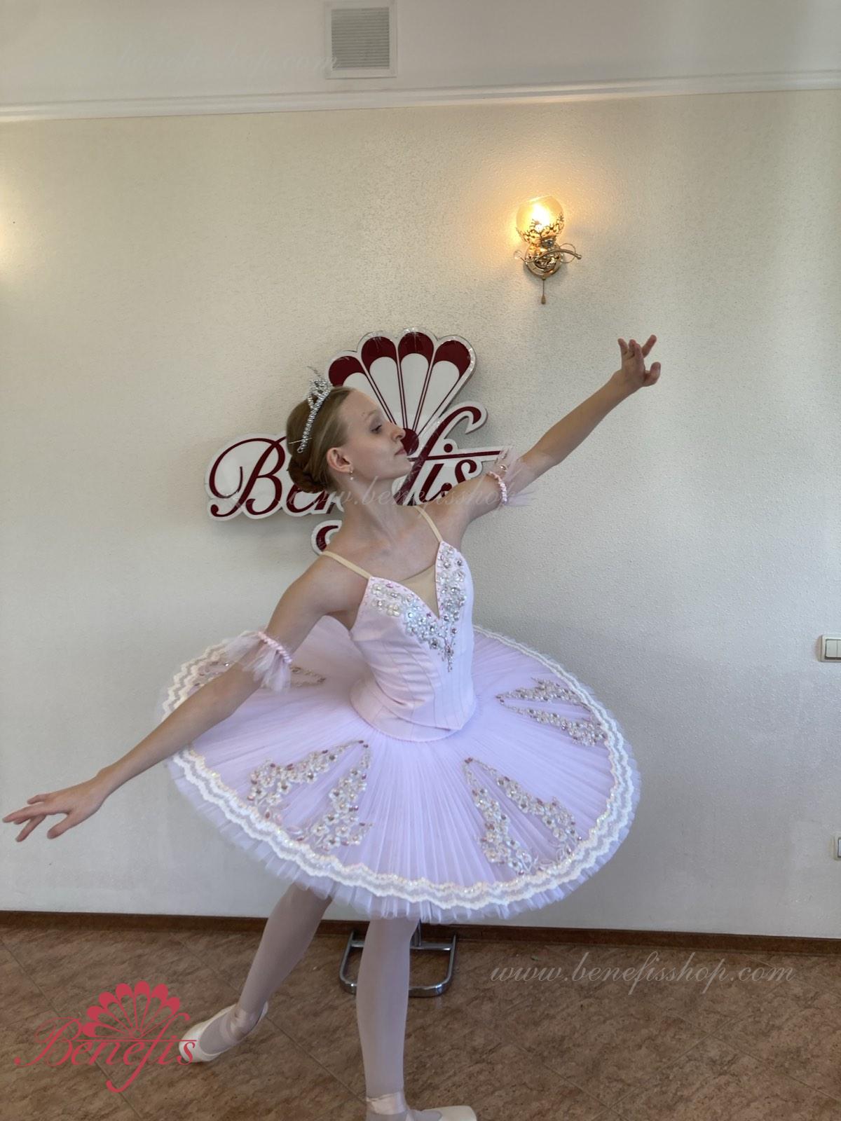 Детали: костюм, покрышка, рукава. Лиф на эластичных лямках, выполнен из плотной полу эластичной ткани. Данная модель выполнена из двух частей, которые крепятся между собой с помощью резинок, в области талии. Нижняя часть пришивается к пачке или юбке. Верхняя часть накладывается на нижнюю что позволяет регулировать длину лифа в зависимости от роста балерины, и придает лифу большую подвижность.Лиф застегивается на крючки в два ряда для удобного регулирования, внутренний шнур служит для затягивания лифа в области груди.Восемь плиссированных градуированных слоёв полумягкого тюля- семь длинных и один короткий на трусиках из тюля с 10 см кокеткой, прикрепленной к эластичному поясу. Два кринолиновых обруча внедрены в средний слой с двумя дополнительными короткими оборками по краям. Длина верхнего слоя - 36-38 см, каждый следующий слой на 4 см короче. Пачка застегивается сзади на 6 больших крючков и петелек.