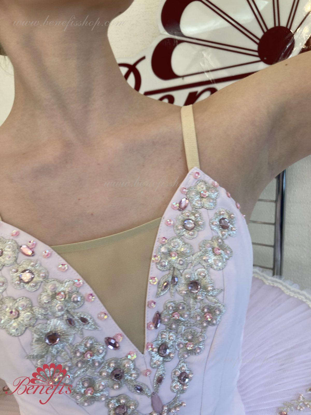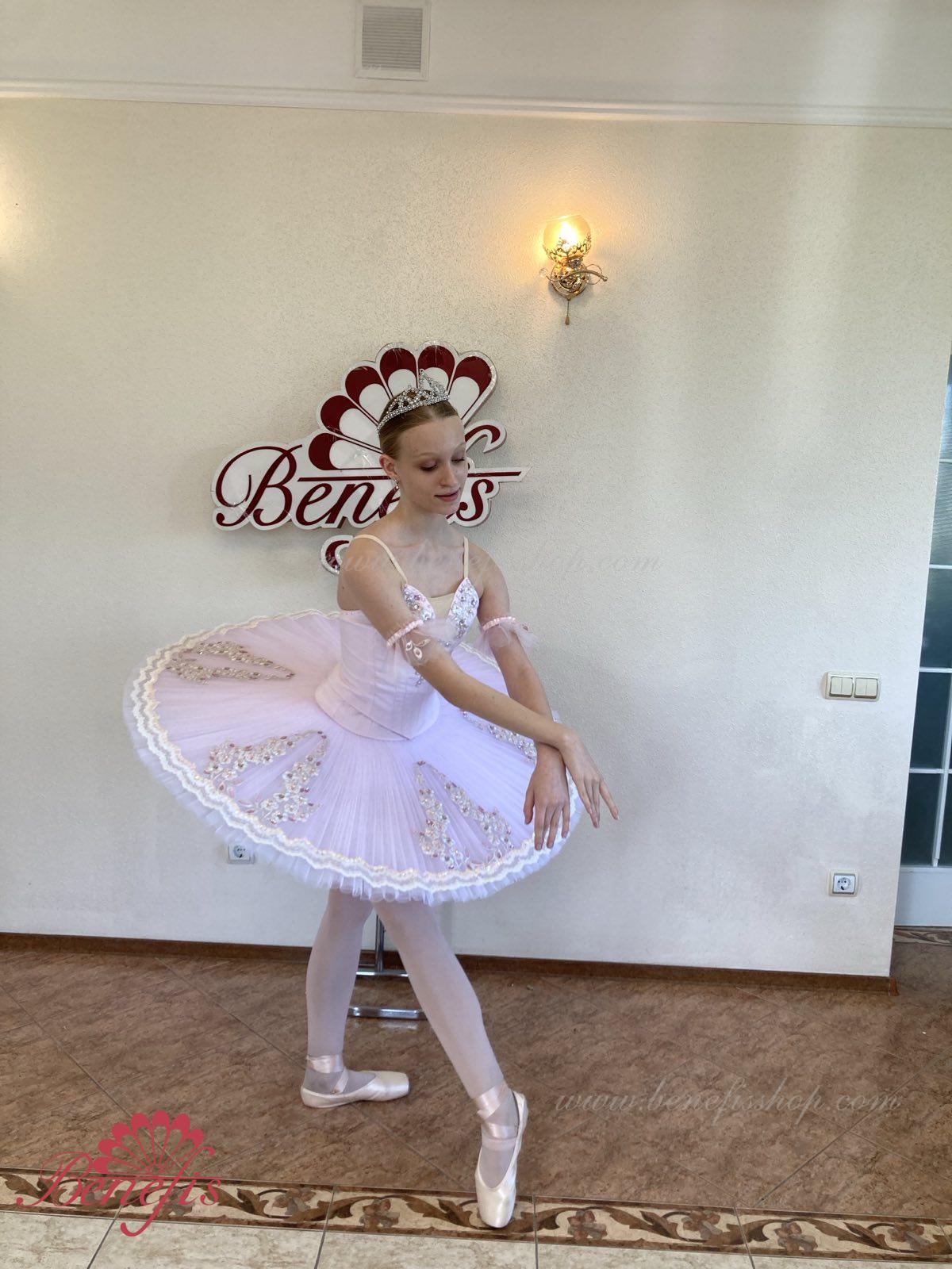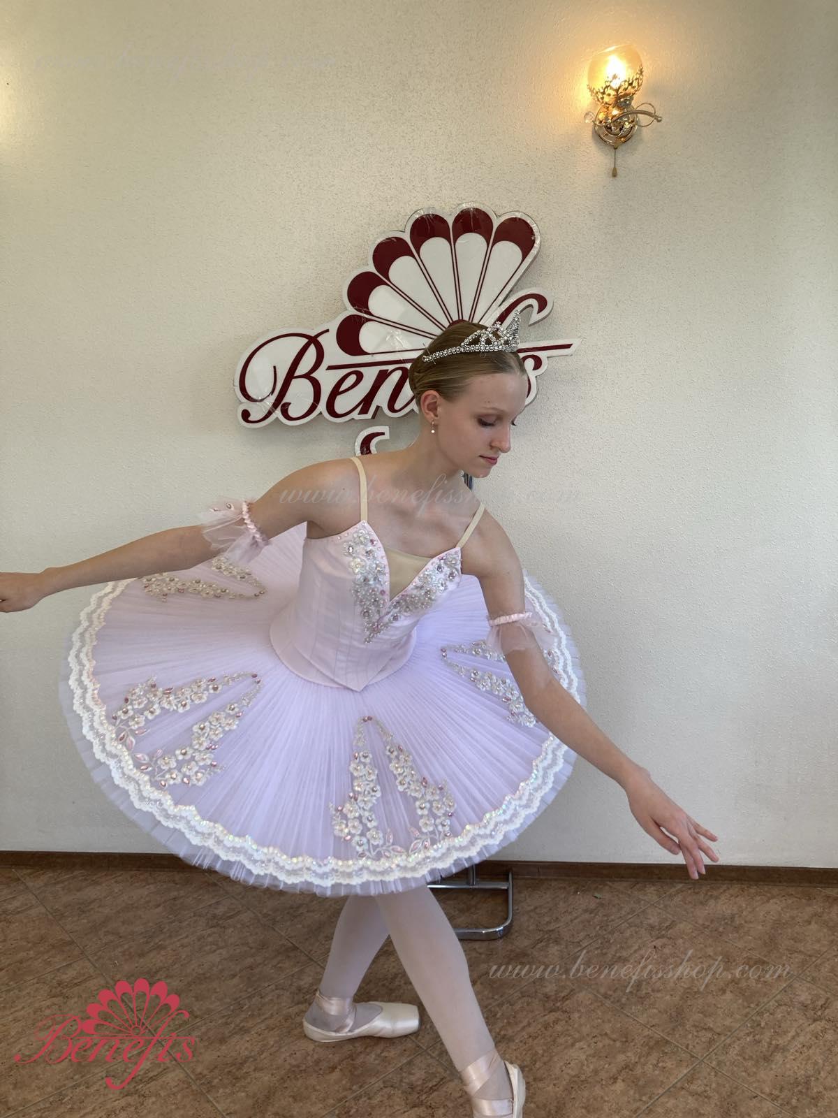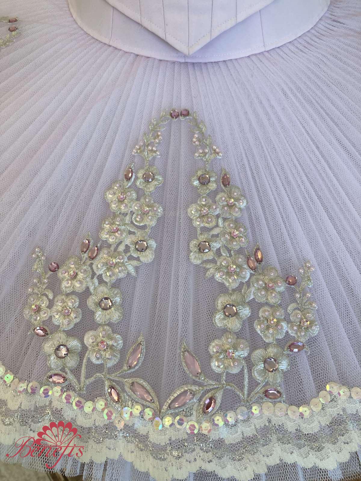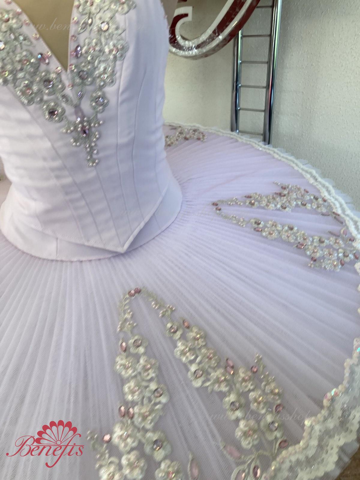 Детали: костюм, покрышка, рукава. Лиф на эластичных лямках, выполнен из плотной полу эластичной ткани. Данная модель выполнена из двух частей, которые крепятся между собой с помощью резинок, в области талии. Нижняя часть пришивается к пачке или юбке. Верхняя часть накладывается на нижнюю что позволяет регулировать длину лифа в зависимости от роста балерины, и придает лифу большую подвижность.Лиф застегивается на крючки в два ряда для удобного регулирования, внутренний шнур служит для затягивания лифа в области груди.Восемь плиссированных градуированных слоёв полумягкого тюля- семь длинных и один короткий на трусиках из тюля с 10 см кокеткой, прикрепленной к эластичному поясу. Два кринолиновых обруча внедрены в средний слой с двумя дополнительными короткими оборками по краям. Длина верхнего слоя - 36-38 см, каждый следующий слой на 4 см короче. Пачка застегивается сзади на 6 больших крючков и петелек.