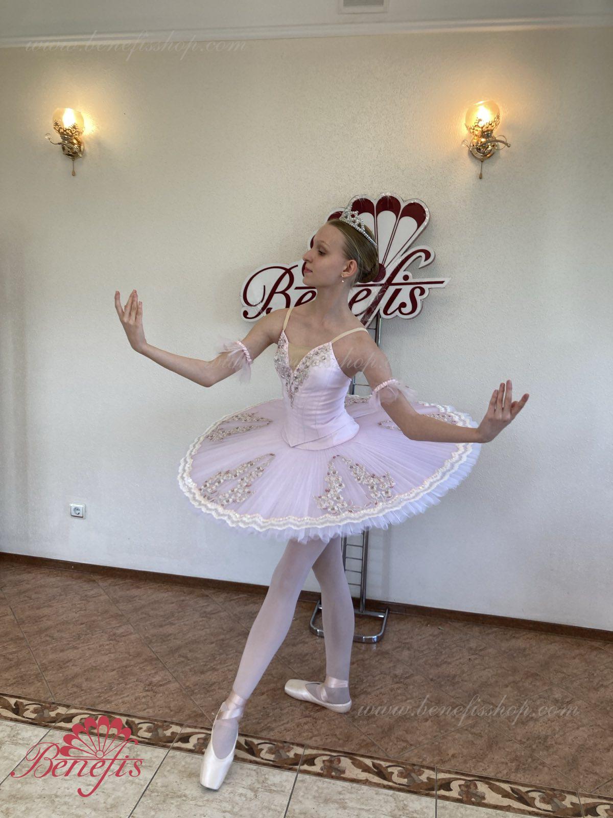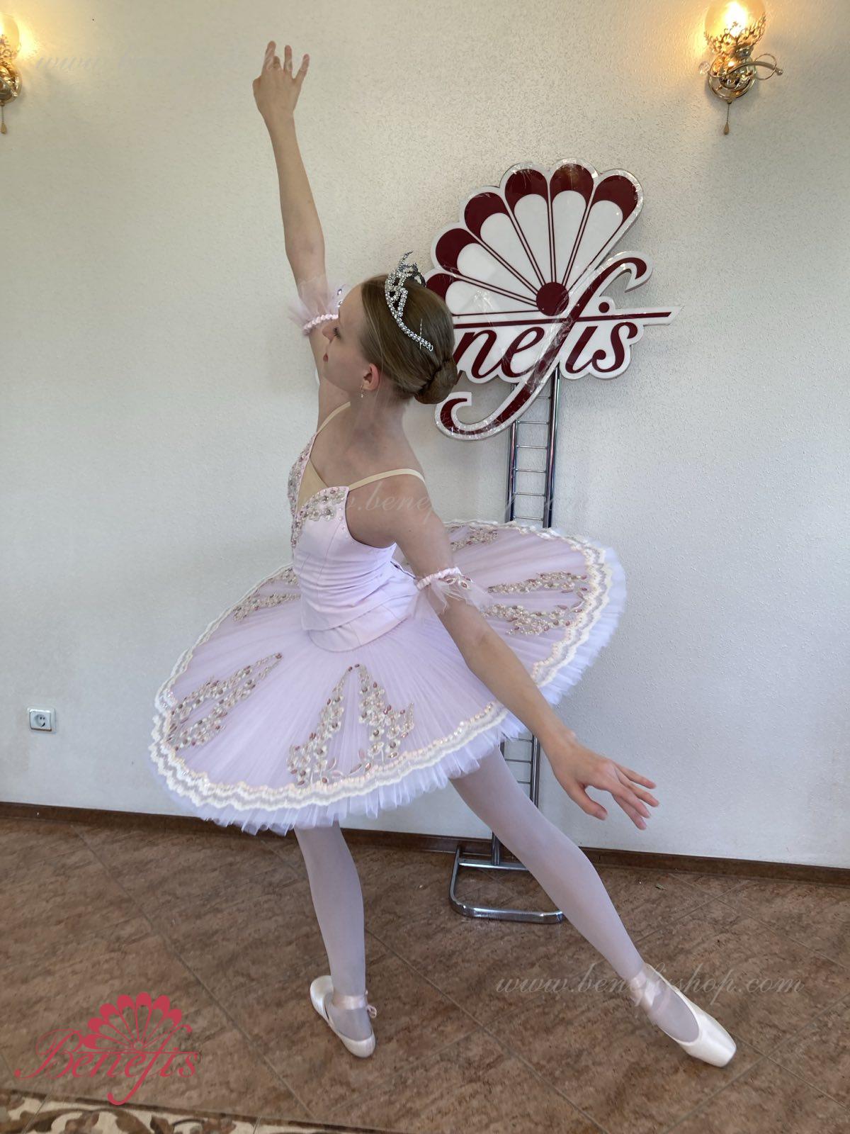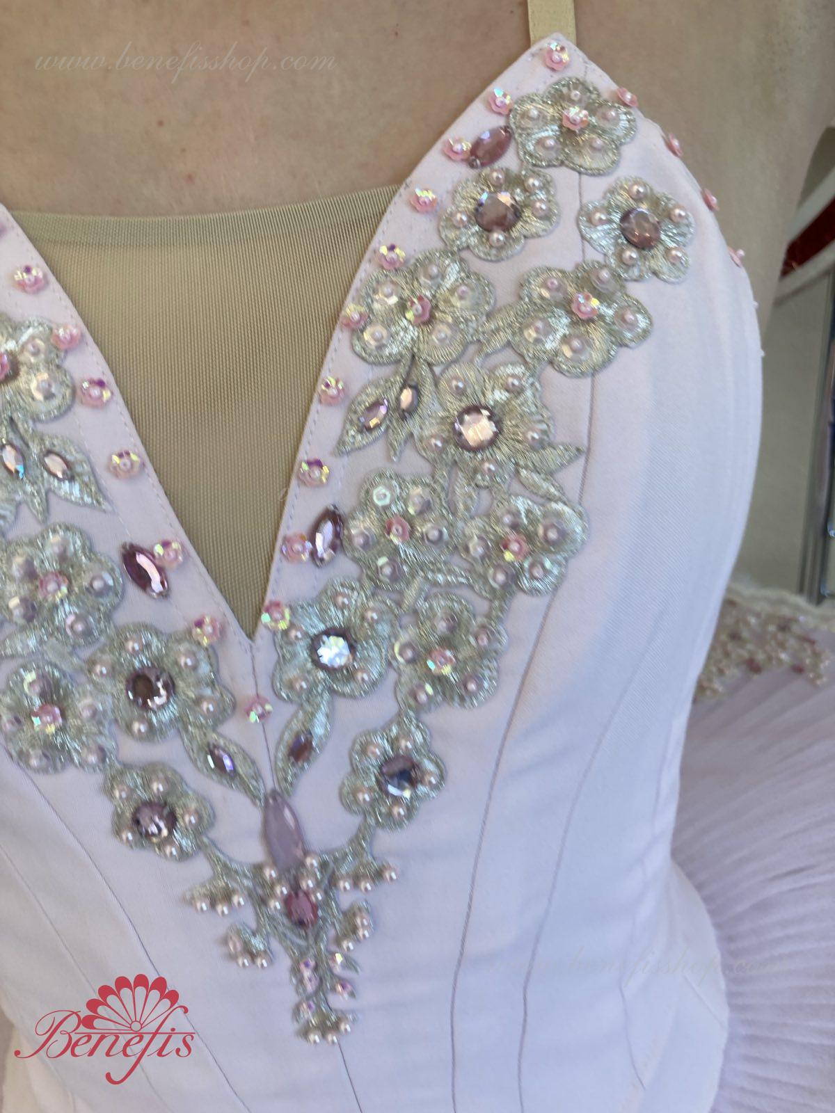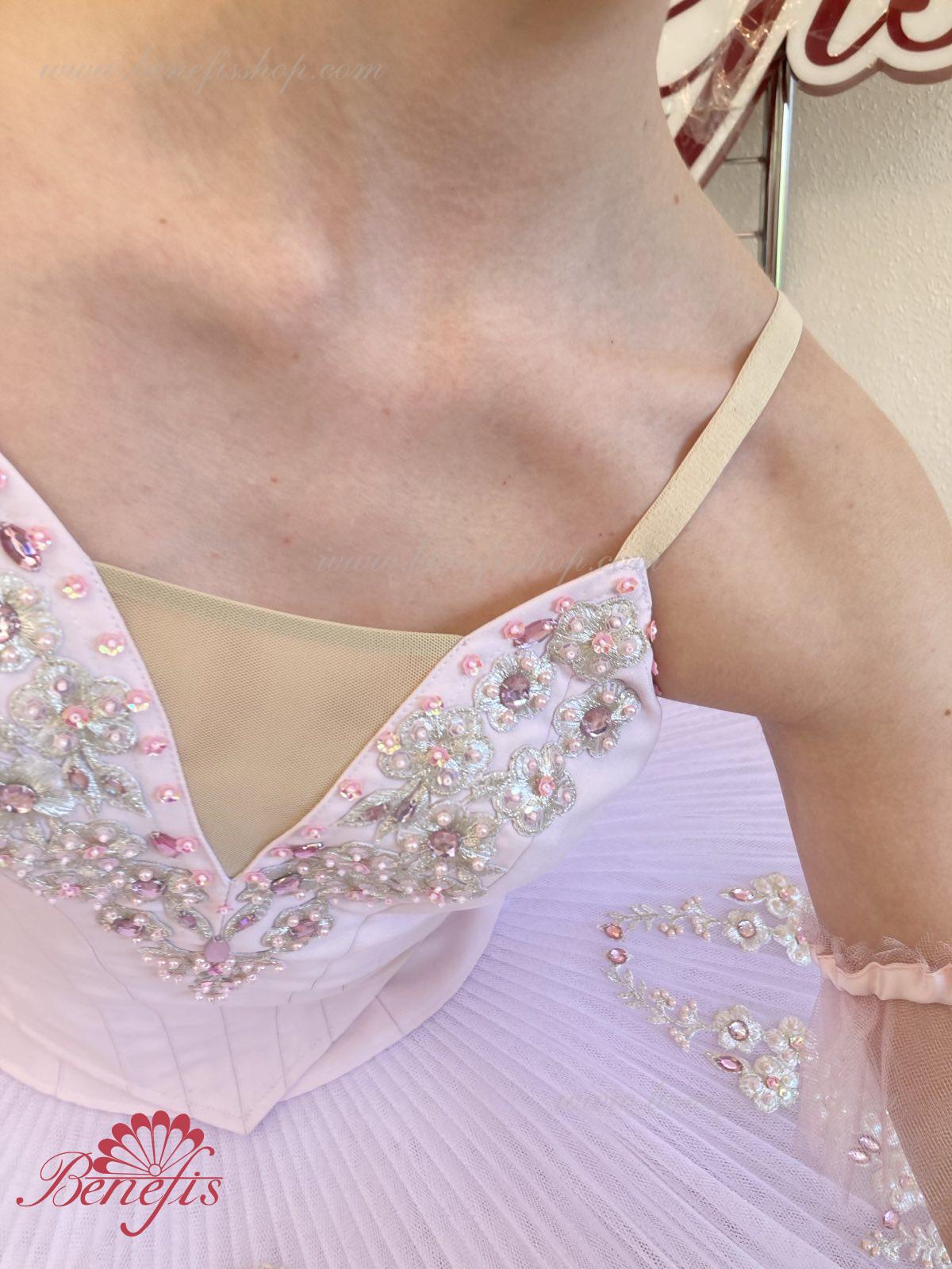 Детали: костюм, покрышка, рукава. Лиф на эластичных лямках, выполнен из плотной полу эластичной ткани. Данная модель выполнена из двух частей, которые крепятся между собой с помощью резинок, в области талии. Нижняя часть пришивается к пачке или юбке. Верхняя часть накладывается на нижнюю что позволяет регулировать длину лифа в зависимости от роста балерины, и придает лифу большую подвижность.Лиф застегивается на крючки в два ряда для удобного регулирования, внутренний шнур служит для затягивания лифа в области груди.Восемь плиссированных градуированных слоёв полумягкого тюля- семь длинных и один короткий на трусиках из тюля с 10 см кокеткой, прикрепленной к эластичному поясу. Два кринолиновых обруча внедрены в средний слой с двумя дополнительными короткими оборками по краям. Длина верхнего слоя - 36-38 см, каждый следующий слой на 4 см короче. Пачка застегивается сзади на 6 больших крючков и петелек.