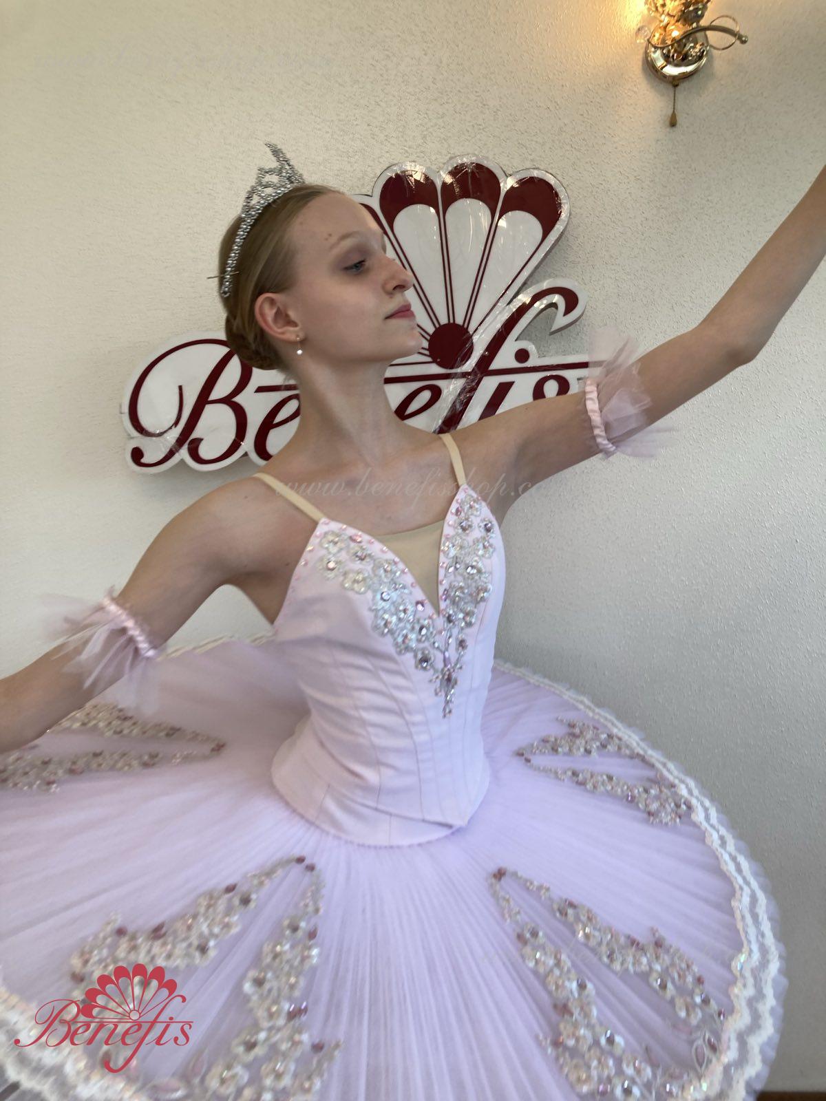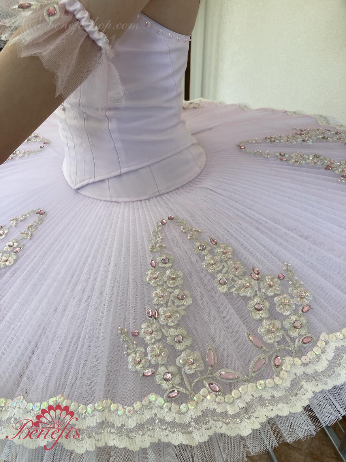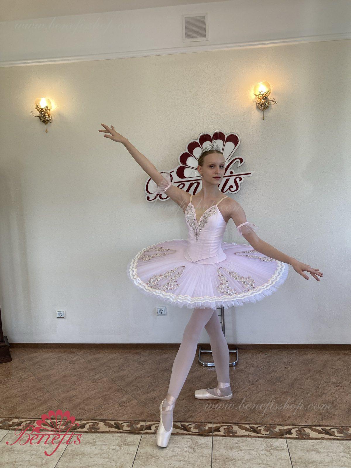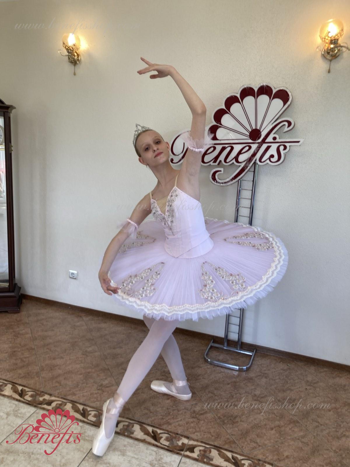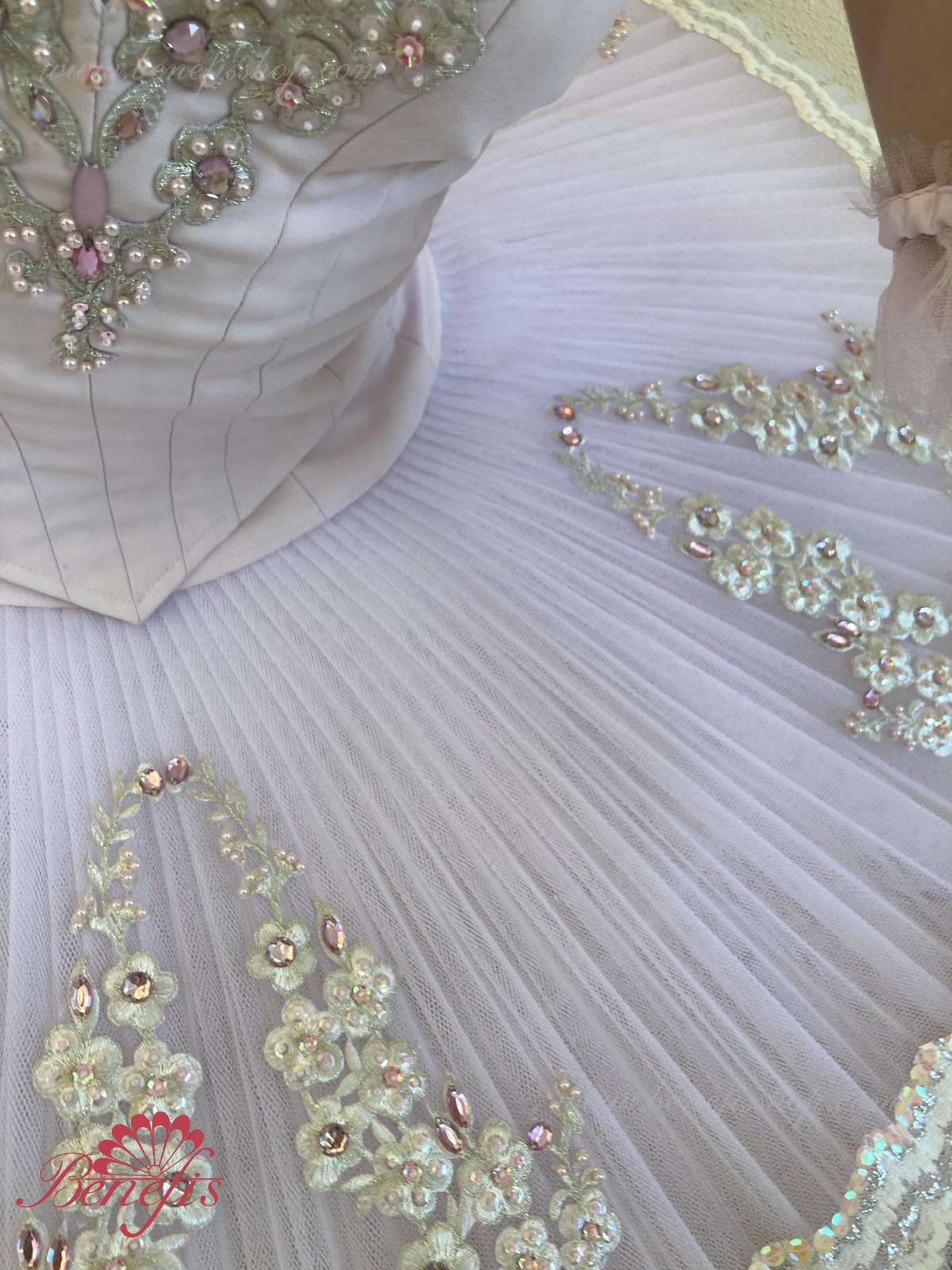 Детали: костюм, покрышка, рукава. Лиф на эластичных лямках, выполнен из плотной полу эластичной ткани. Данная модель выполнена из двух частей, которые крепятся между собой с помощью резинок, в области талии. Нижняя часть пришивается к пачке или юбке. Верхняя часть накладывается на нижнюю что позволяет регулировать длину лифа в зависимости от роста балерины, и придает лифу большую подвижность.Лиф застегивается на крючки в два ряда для удобного регулирования, внутренний шнур служит для затягивания лифа в области груди.Восемь плиссированных градуированных слоёв полумягкого тюля- семь длинных и один короткий на трусиках из тюля с 10 см кокеткой, прикрепленной к эластичному поясу. Два кринолиновых обруча внедрены в средний слой с двумя дополнительными короткими оборками по краям. Длина верхнего слоя - 36-38 см, каждый следующий слой на 4 см короче. Пачка застегивается сзади на 6 больших крючков и петелек.