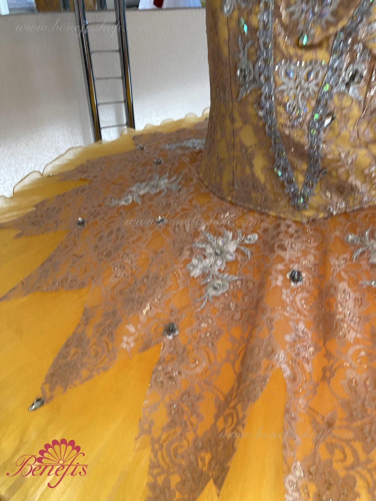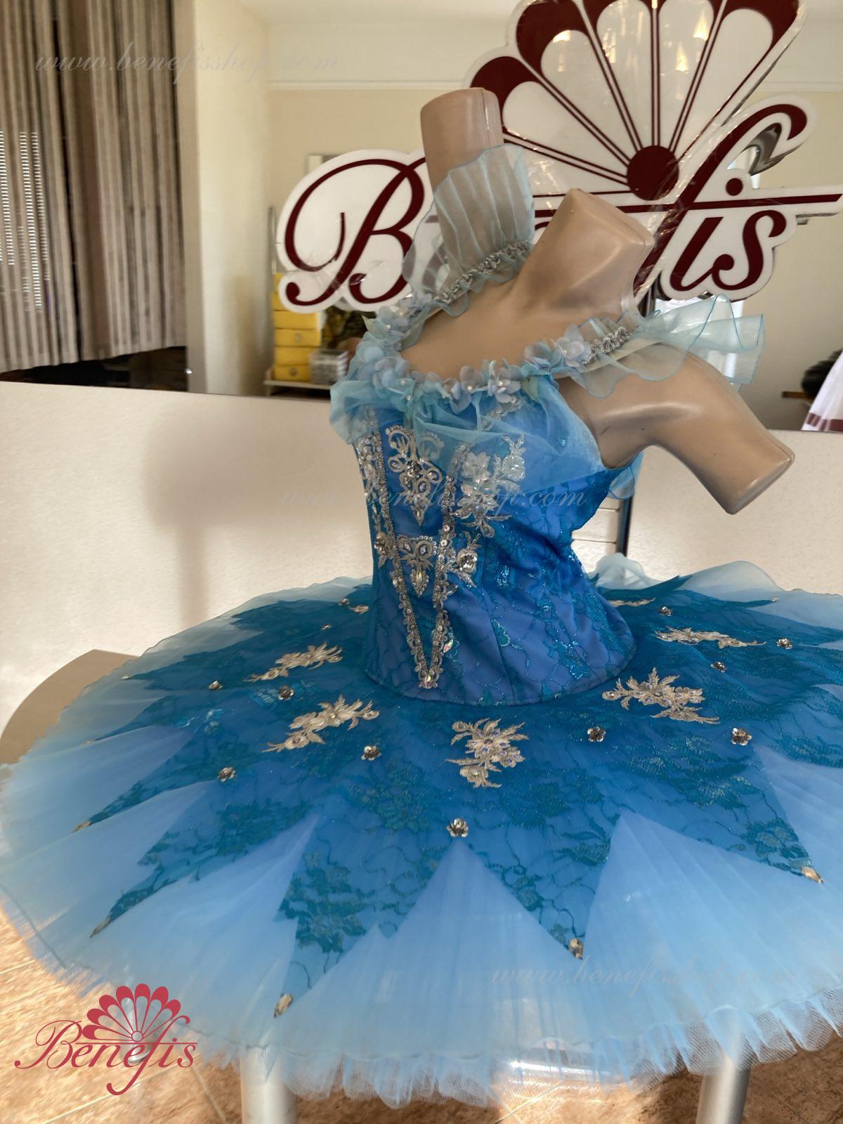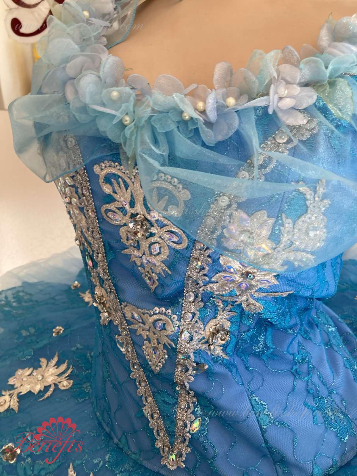 Лиф застегивается на крючки в два ряда для удобного регулирования, внутренний шнур служит для затягивания лифа в области груди. Восемь плиссированных градуированных слоёв полумягкого тюля- семь длинных и один короткий на трусиках из тюля с 10 см кокеткой, прикрепленной к эластичному поясу. Два кринолиновых обруча внедрены в средний слой с двумя дополнительными короткими оборками по краям. Длина верхнего слоя - 36-38 см, каждый следующий слой на 4 см короче. Пачка застегивается сзади на 6 больших крючков и петелек. Лиф декорирован и украшен бисером, блёстками, аппликациями, цветочки из атласа, тесьма.