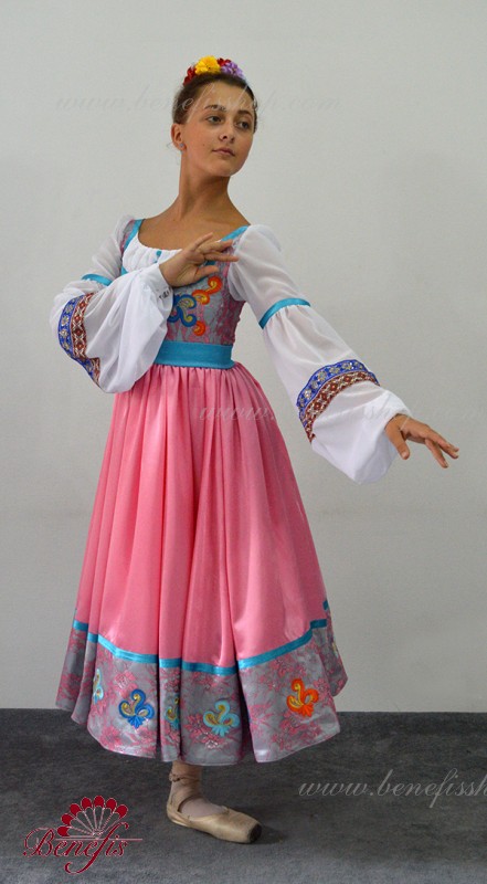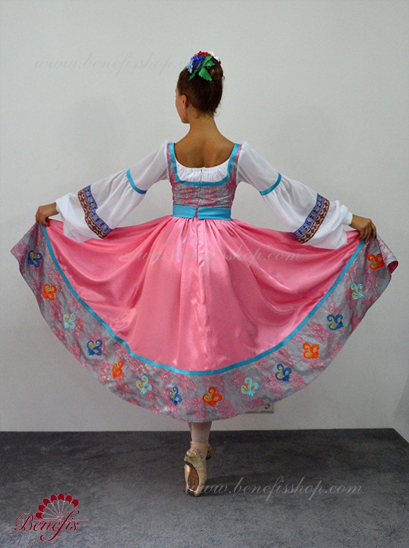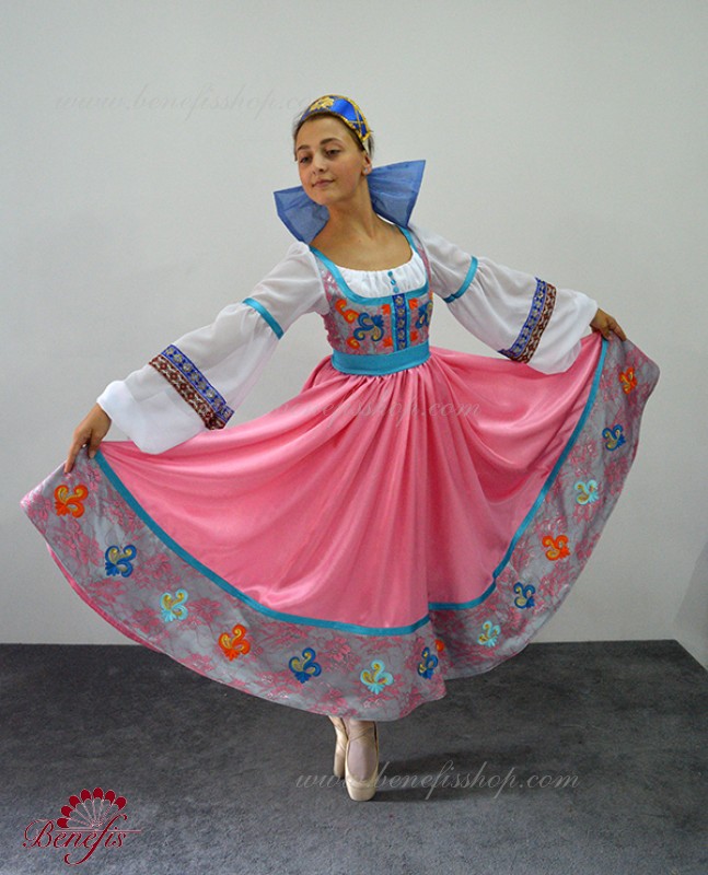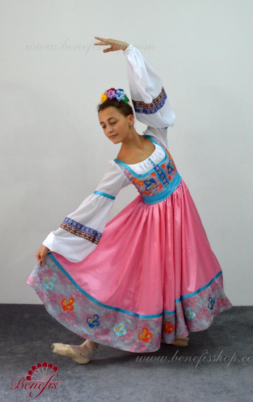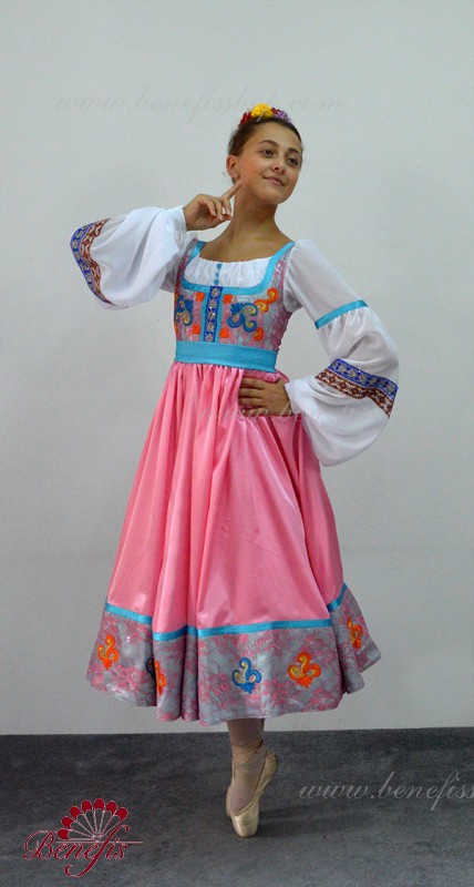 Этот сценический костюм выполнен из полу эластичной ткани. Лиф застегивается на крючки в два ряда для удобного регулирования, a внутренний шнур служит для затягивания лифа в области груди. Спереди есть вставка из шифона. Рукава выполнены из шифона, украшены декоративной тесьмой. Юбка выполнена из полу эластичной ткани с декоративной вставкой из гипюра по низу.