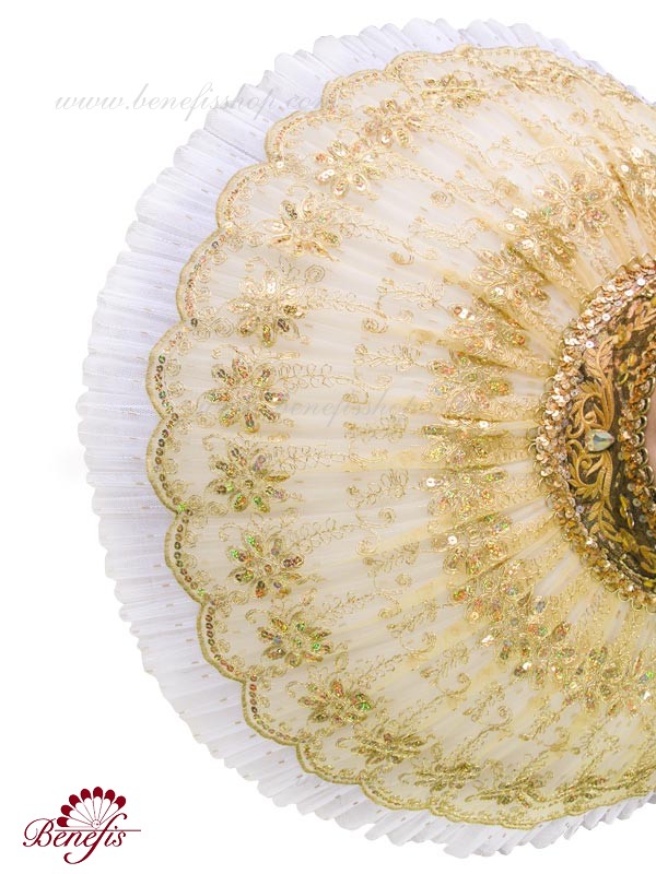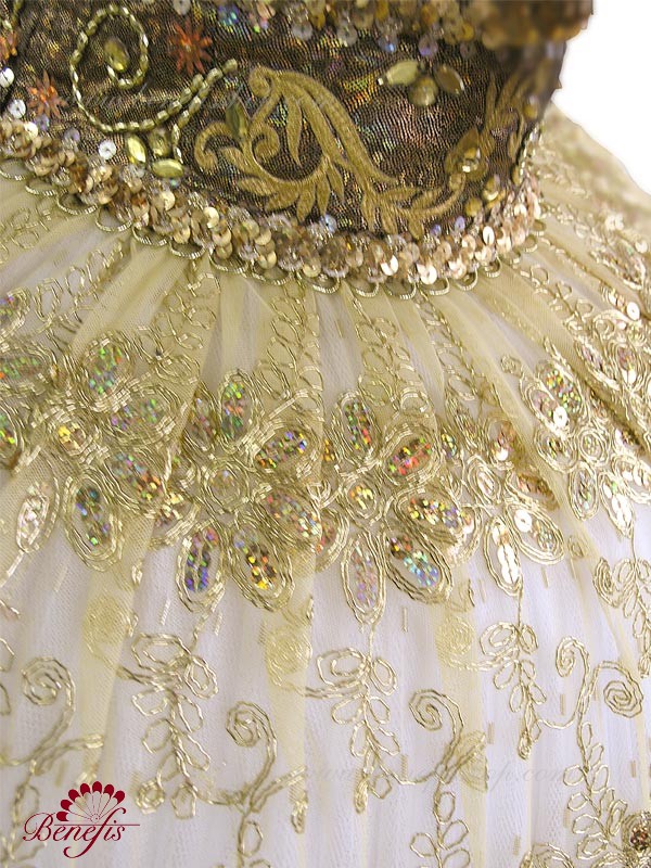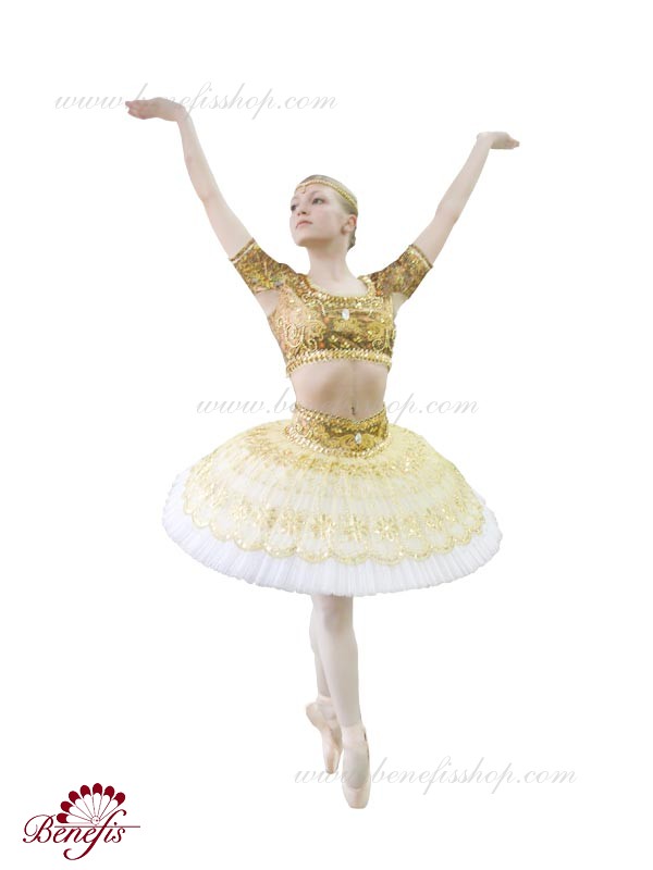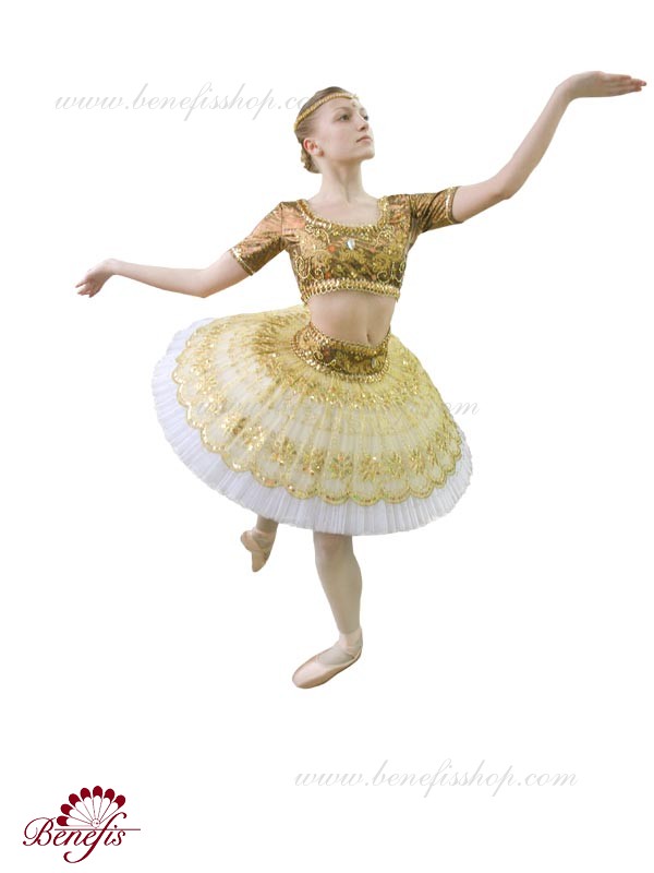 Роскошный балетный костюм выполнен в лучших восточных традициях. Укороченный лиф выполняется отдельно от юбки пачки, которая одевается на бёдра.