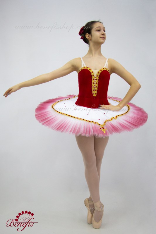 Лиф застегивается на крючки в два ряда для удобного регулирования, внутренний шнур служит для затягивания лифа в области груди. Восемь плиссированных градуированных слоёв полумягкого тюля- семь длинных и один короткий на трусиках из тюля с 10 см кокеткой, прикрепленной к эластичному поясу. Два кринолиновых обруча внедрены в средний слой с двумя дополнительными короткими оборками по краям. Длина верхнего слоя - 36-38 см, каждый следующий слой на 4 см короче. Пачка застегивается сзади на 6 больших крючков и петелек. Декор: тесьма, аппликации, стразы, блестки.
