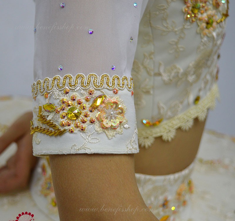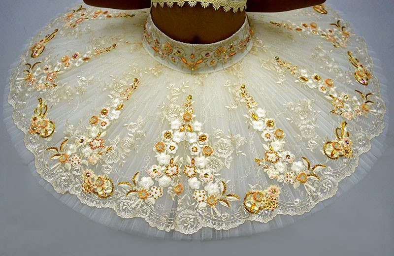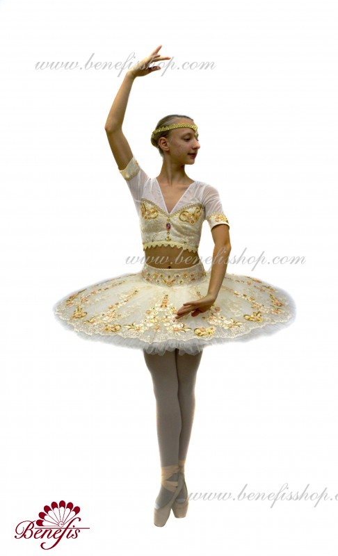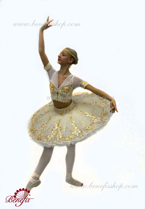 Сценический профессиональный балетный костюм выполнен на основе базовой пачки T 0001. Укороченный лиф выполнен из полуэластичной ткани, дублирован гипюром, переходящий в тонкую блузку с рукавами из сетки. Лиф застёгивается на два ряда крючков. Для удобного регулирования в области груди используют шнуровку.