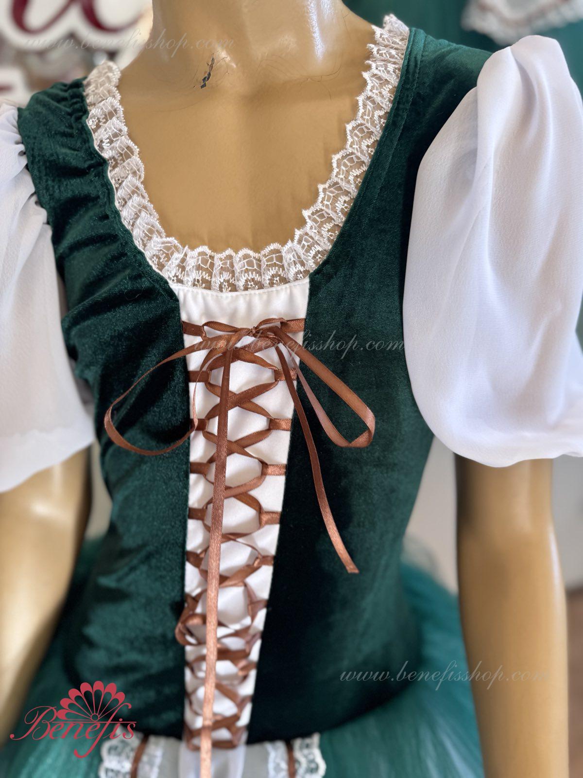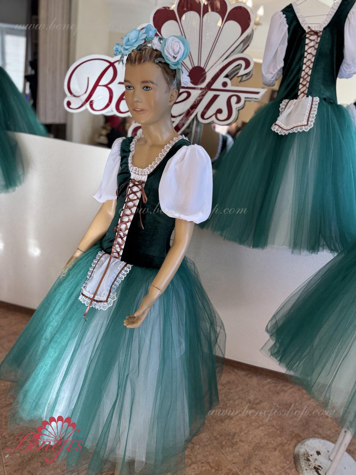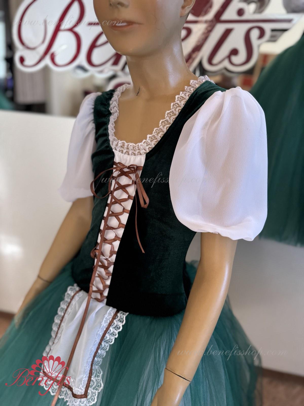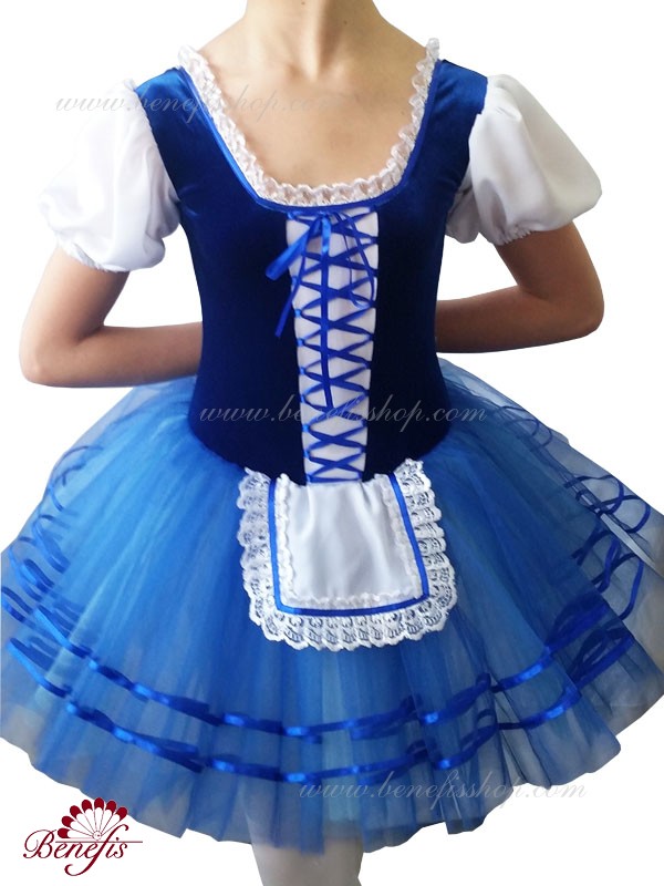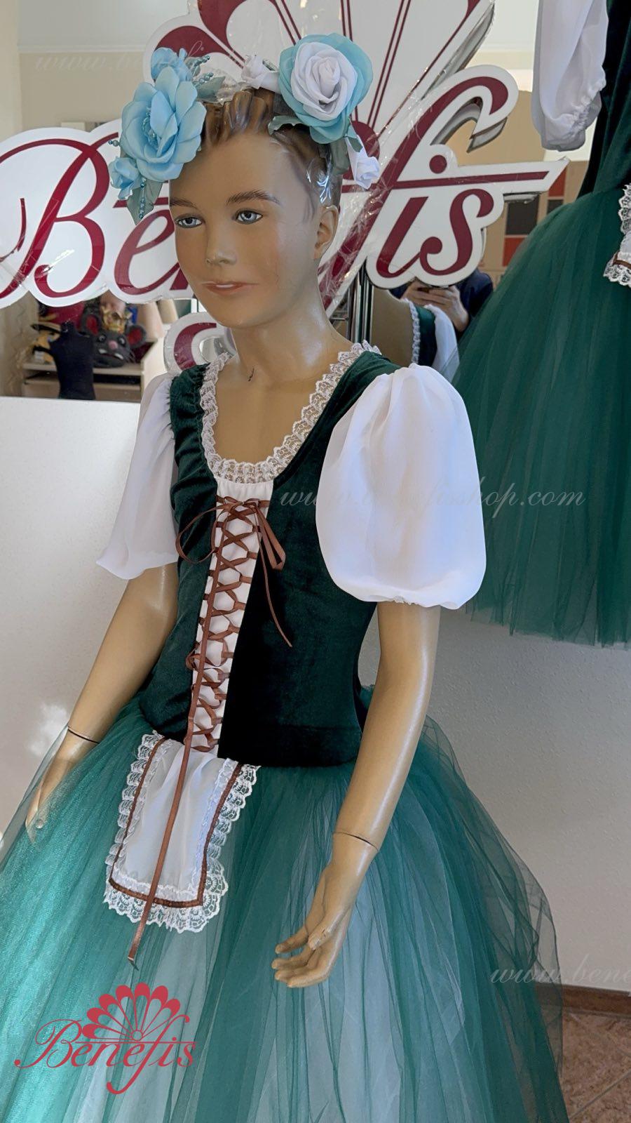 Костюм выполняется в крестьянском стиле с маленьким фартуком спереди и кружевной тесьмой по нижней части верхнего слоя юбки.Также в декоре платья использованы маленькие цветочки.