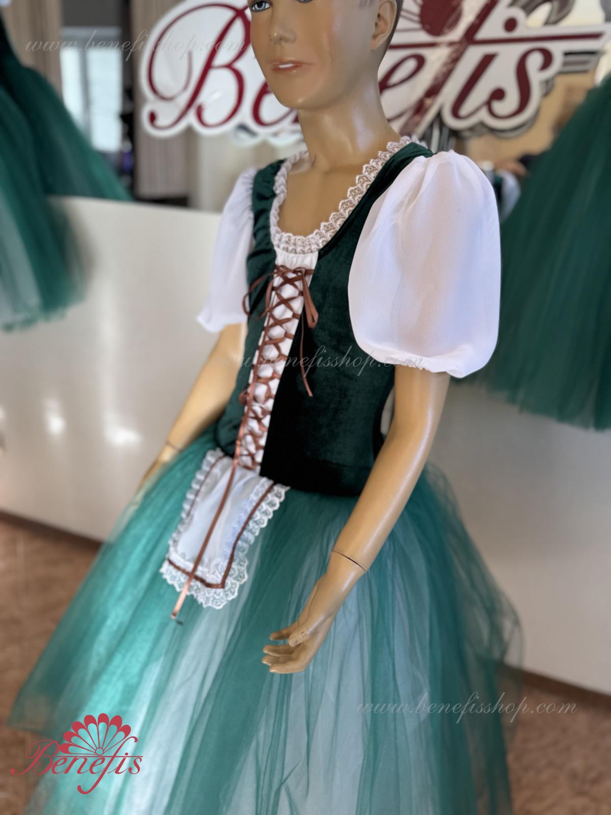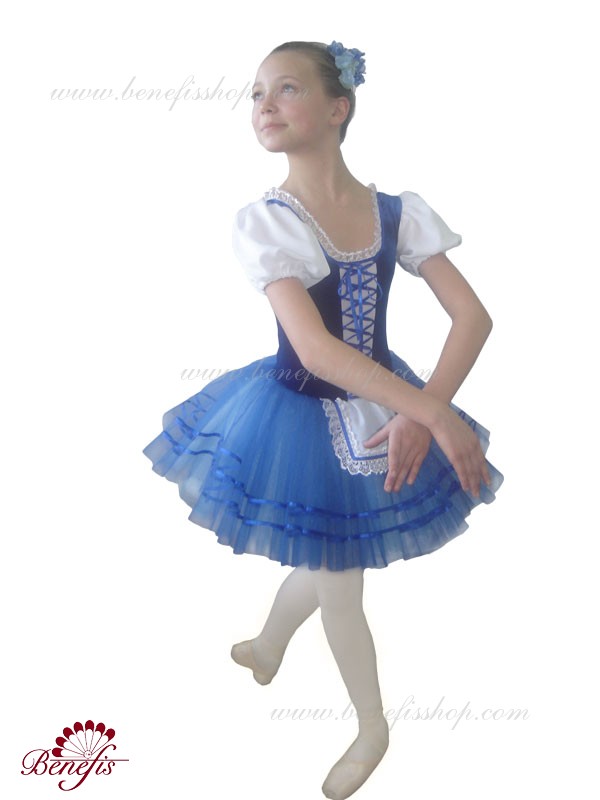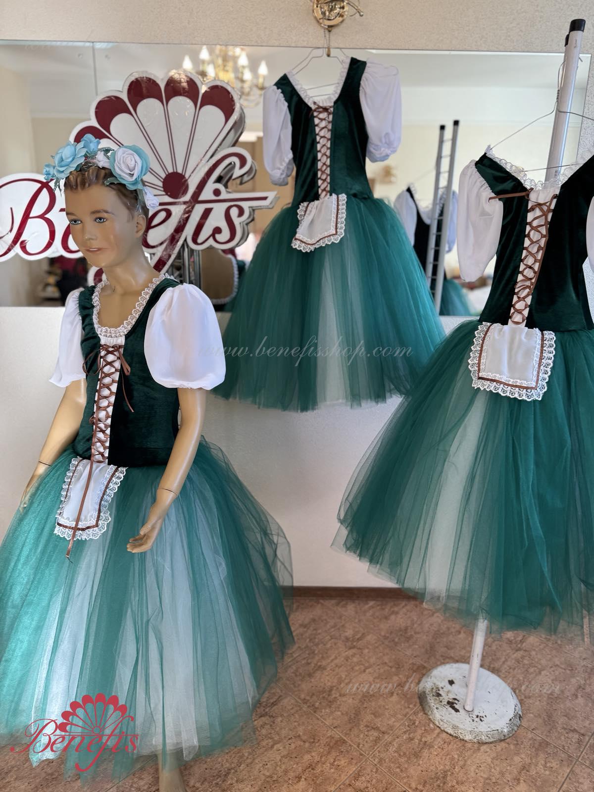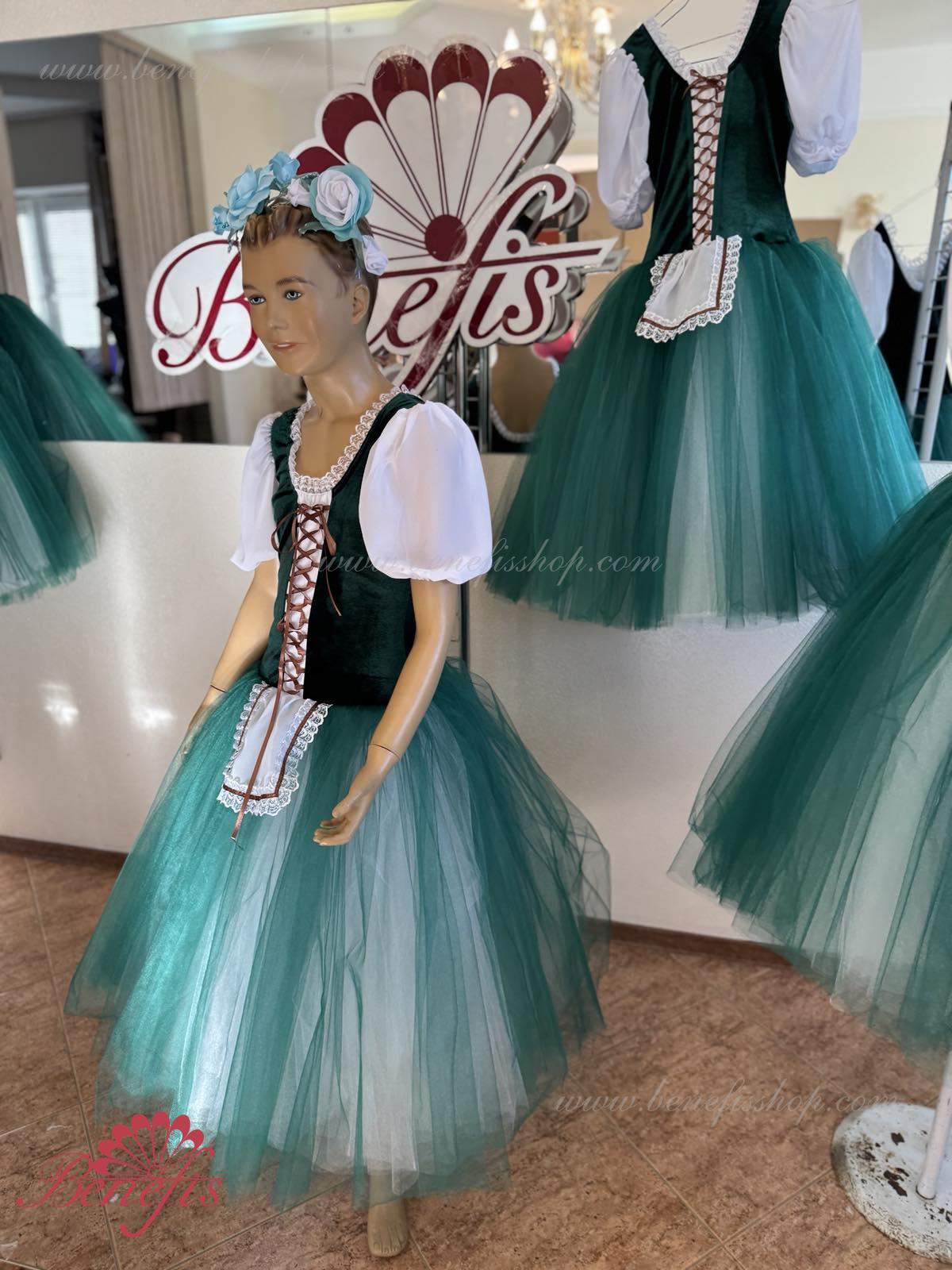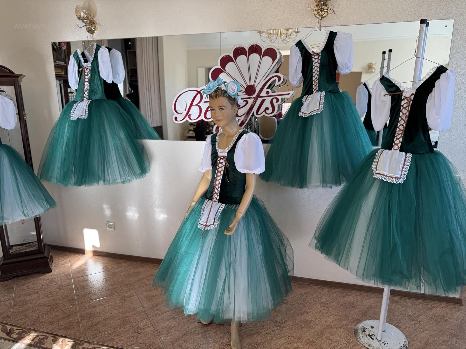 Костюм выполняется в крестьянском стиле с маленьким фартуком спереди и кружевной тесьмой по нижней части верхнего слоя юбки.Также в декоре платья использованы маленькие цветочки.