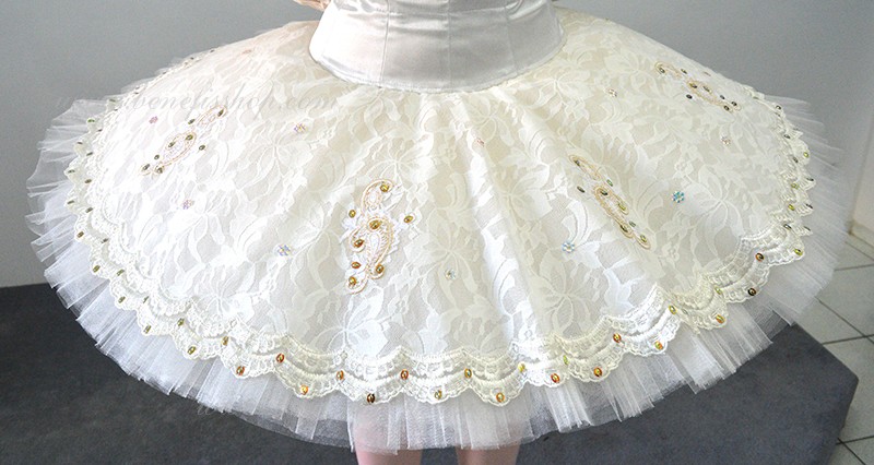 Рукава и покрышка выполнены из эластичного гипюра. Пачка выполнена из 9 слоев, верхние 3 волана - из мягкого фатина, при собранных в сборку, остальные 6 из жесткого фатина, заложенных в складку.