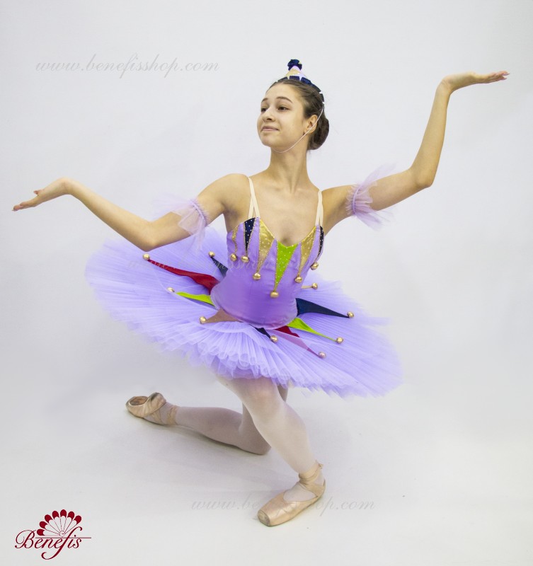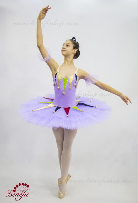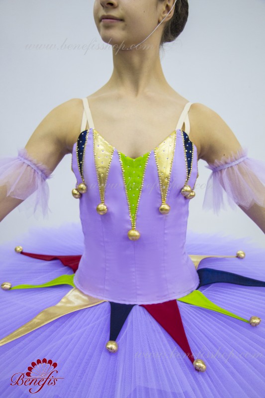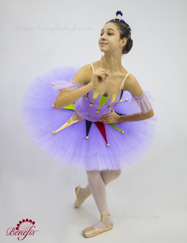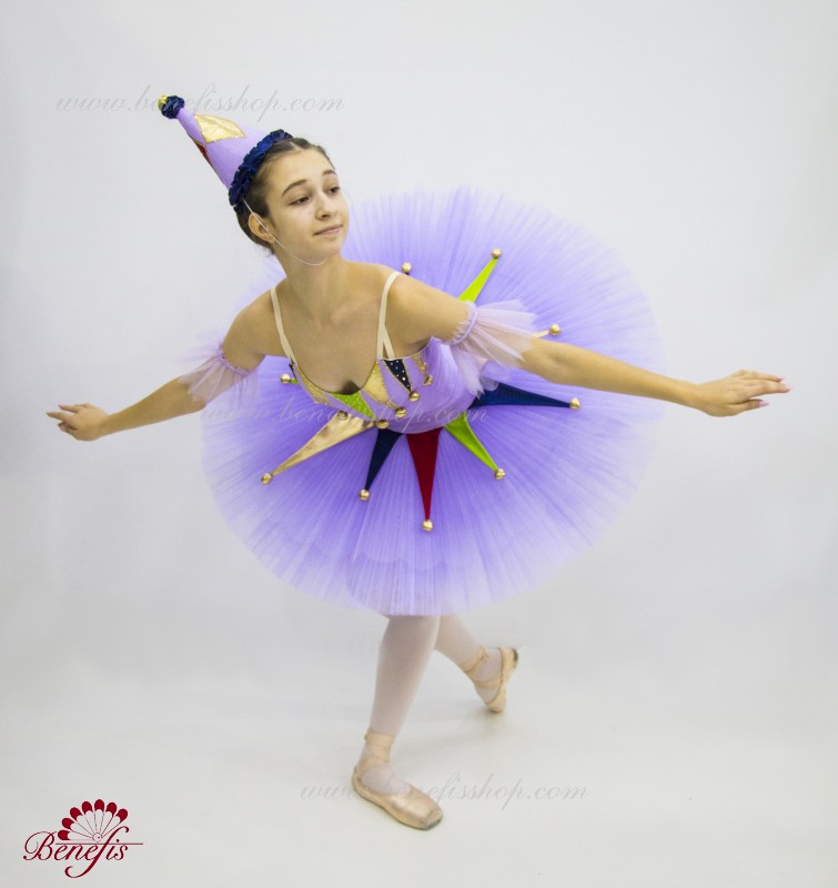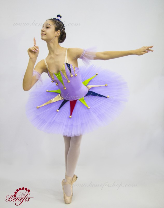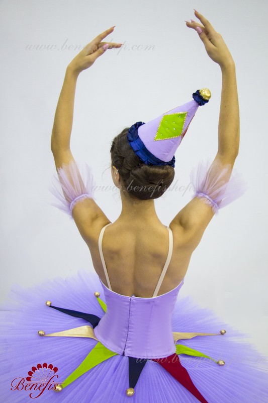 Профессиональный сценический костюм выполнен на основе базовой пачки T0001B. Восемь плиссированных градуированных слоёв полумягкого тюля- семь длинных и один короткий на трусиках из тюля с 10 см кокеткой, прикрепленной к эластичному поясу. Два кринолиновых обруча внедрены в средний слой с двумя дополнительными короткими оборками по краям. Длина верхнего слоя - 36-38 см, каждый следующий слой на 4 см короче. Пачка застегивается сзади на 6 больших крючков и петелек. Декор сделан из лучи разных цветов, стразы, блестки и помпоны. Лиф, на эластичных лямках и с телесной вставкой на груди, выполнен из плотной полу эластичной ткани.