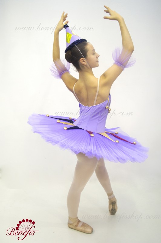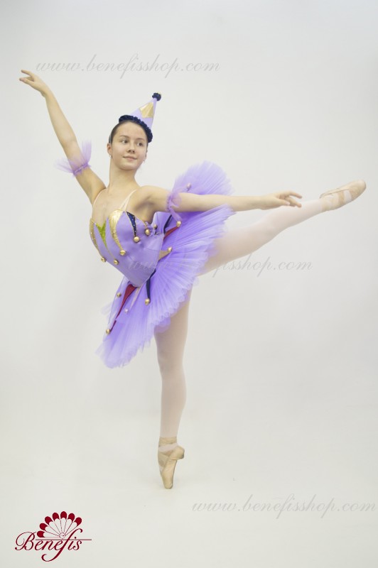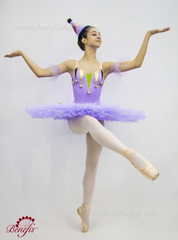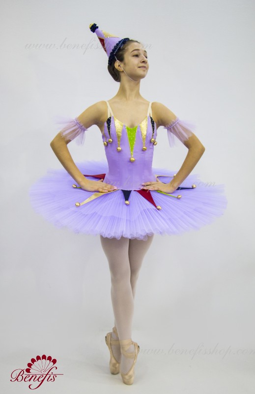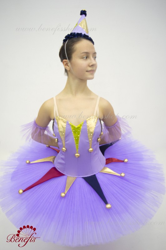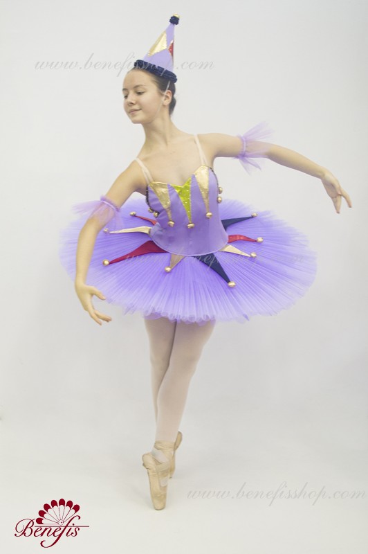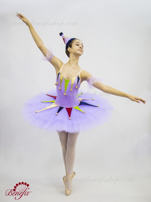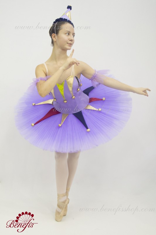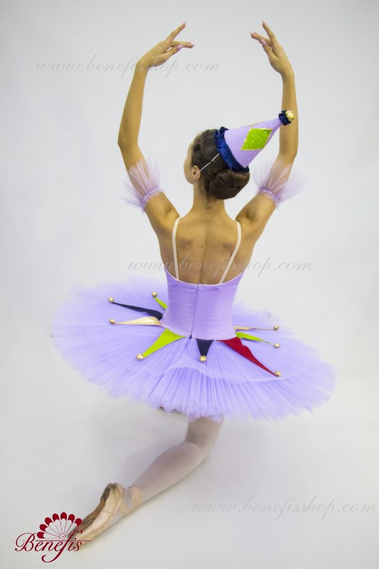 Профессиональный сценический костюм выполнен на основе базовой пачки T0001B. Восемь плиссированных градуированных слоёв полумягкого тюля- семь длинных и один короткий на трусиках из тюля с 10 см кокеткой, прикрепленной к эластичному поясу. Два кринолиновых обруча внедрены в средний слой с двумя дополнительными короткими оборками по краям. Длина верхнего слоя - 36-38 см, каждый следующий слой на 4 см короче. Пачка застегивается сзади на 6 больших крючков и петелек. Декор сделан из лучи разных цветов, стразы, блестки и помпоны. Лиф, на эластичных лямках и с телесной вставкой на груди, выполнен из плотной полу эластичной ткани.