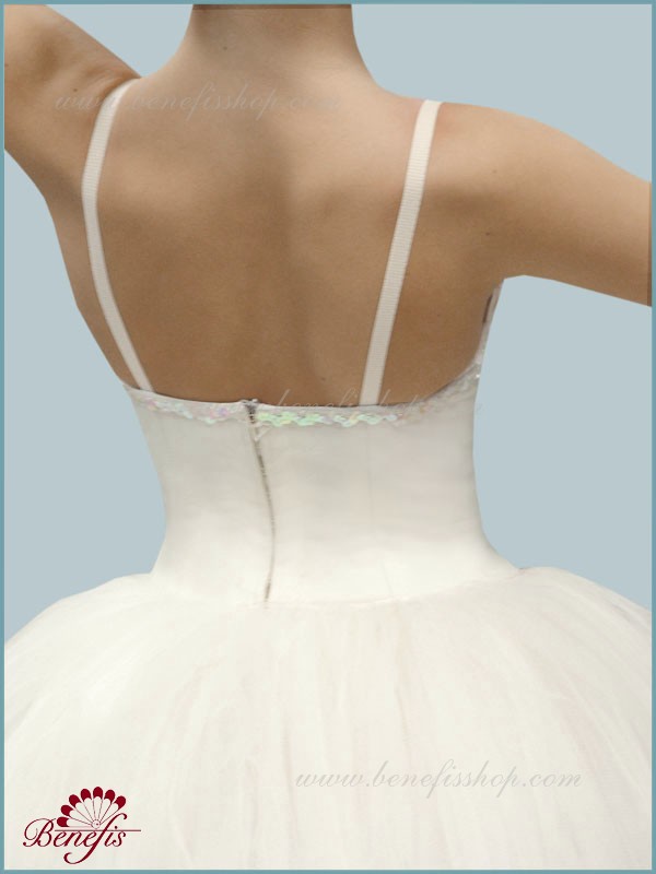 Лиф выполнен из полуэластичной ткани и прикреплён к романтической юбке. Для удобного регулирования размера, лиф застегивается сзади на 2 ряда крючков.