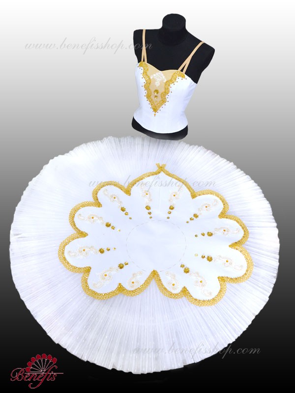 Восемь плиссированных градуированных слоёв полумягкого тюля- семь длинных и один короткий на трусиках из тюля с 10 см кокеткой, прикрепленной к эластичному поясу. Два кринолиновых обруча внедрёны в средний слой с двумя дополнительными короткими оборками по краям. Длина верхнего слоя - 36-38 см, каждый следующий слой на 4 см короче. Пачка застегивается сзади на 6 больших крючков и петелек. Эта балетная репетиционная пачка может быть выполнена как на взрослого, так и на ребёнка.